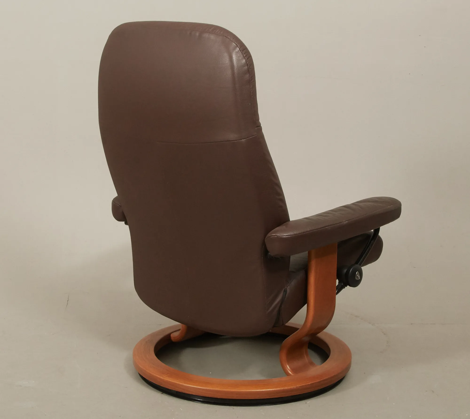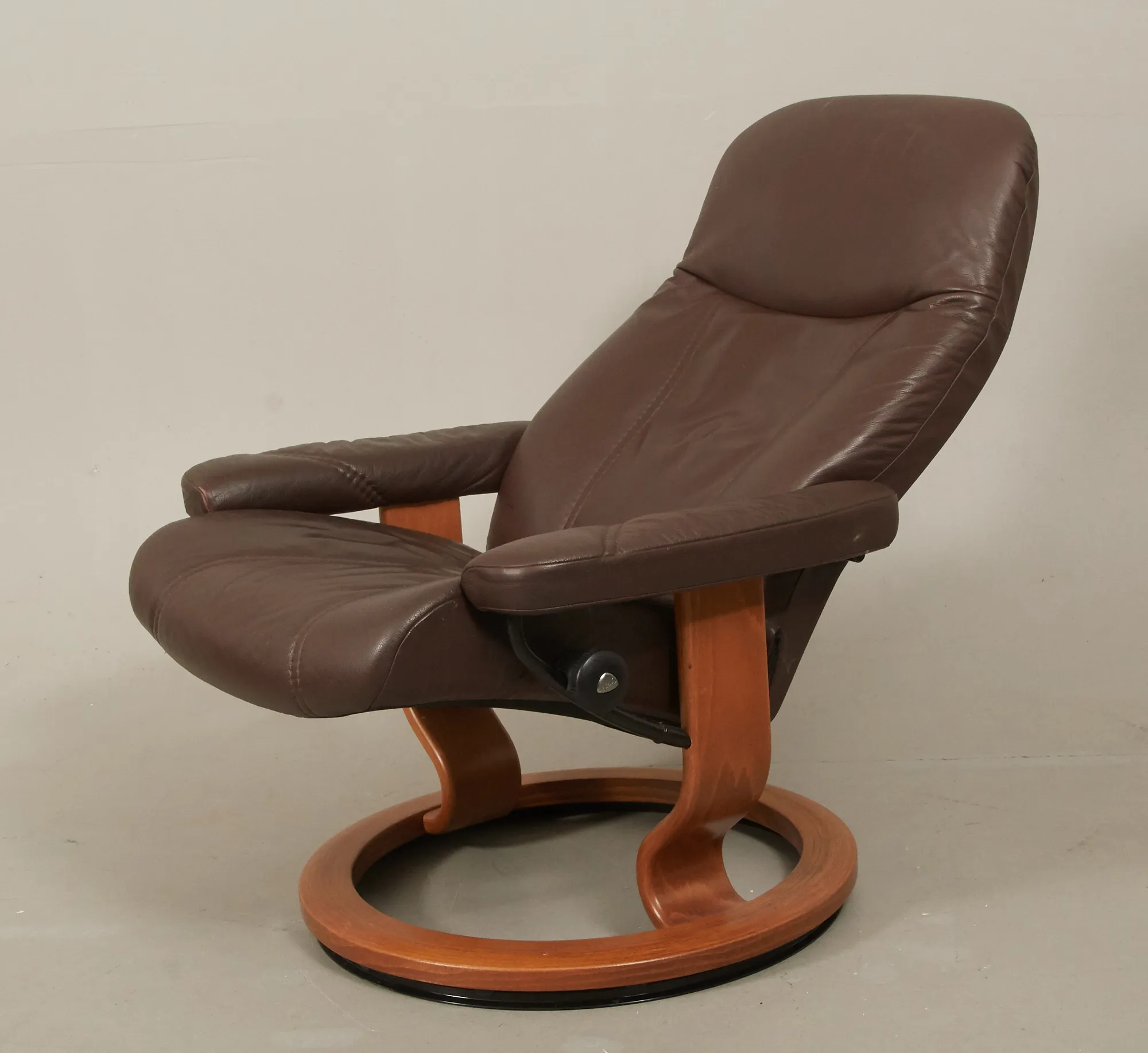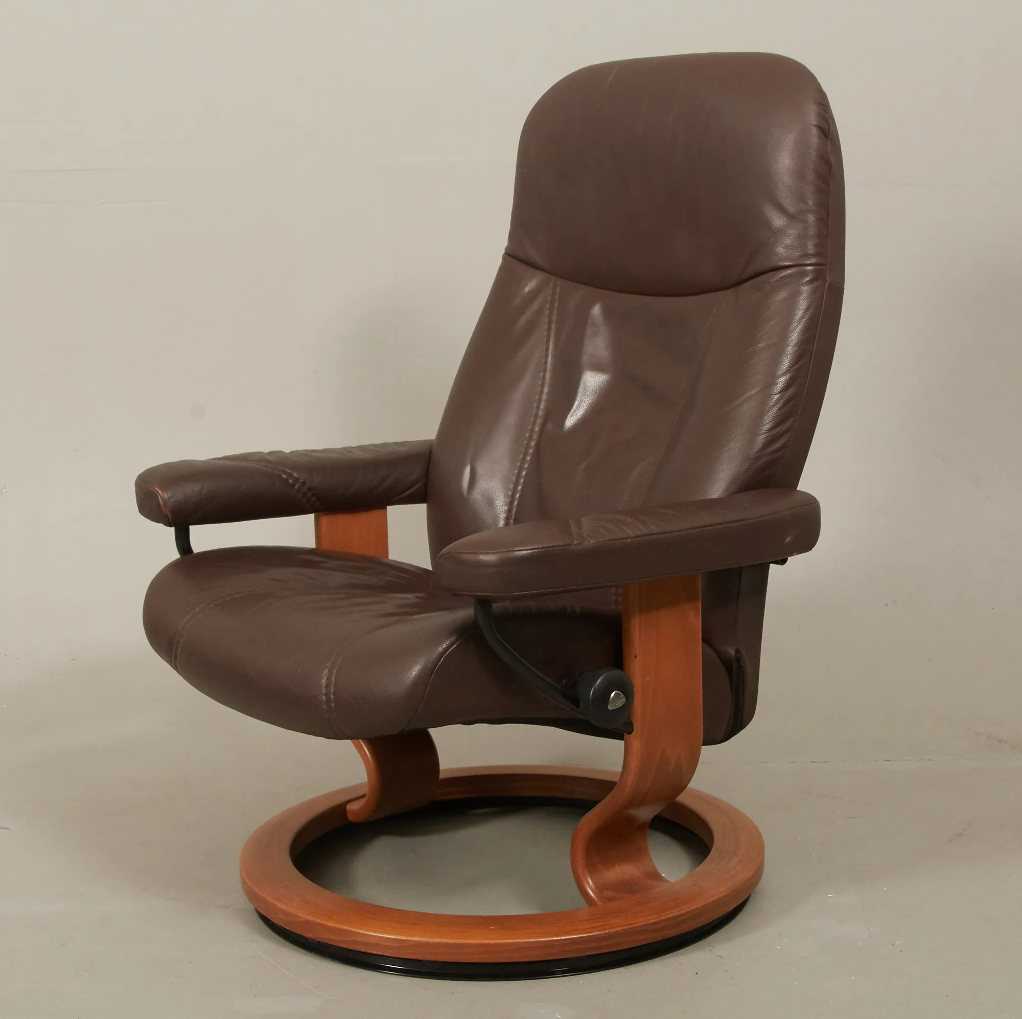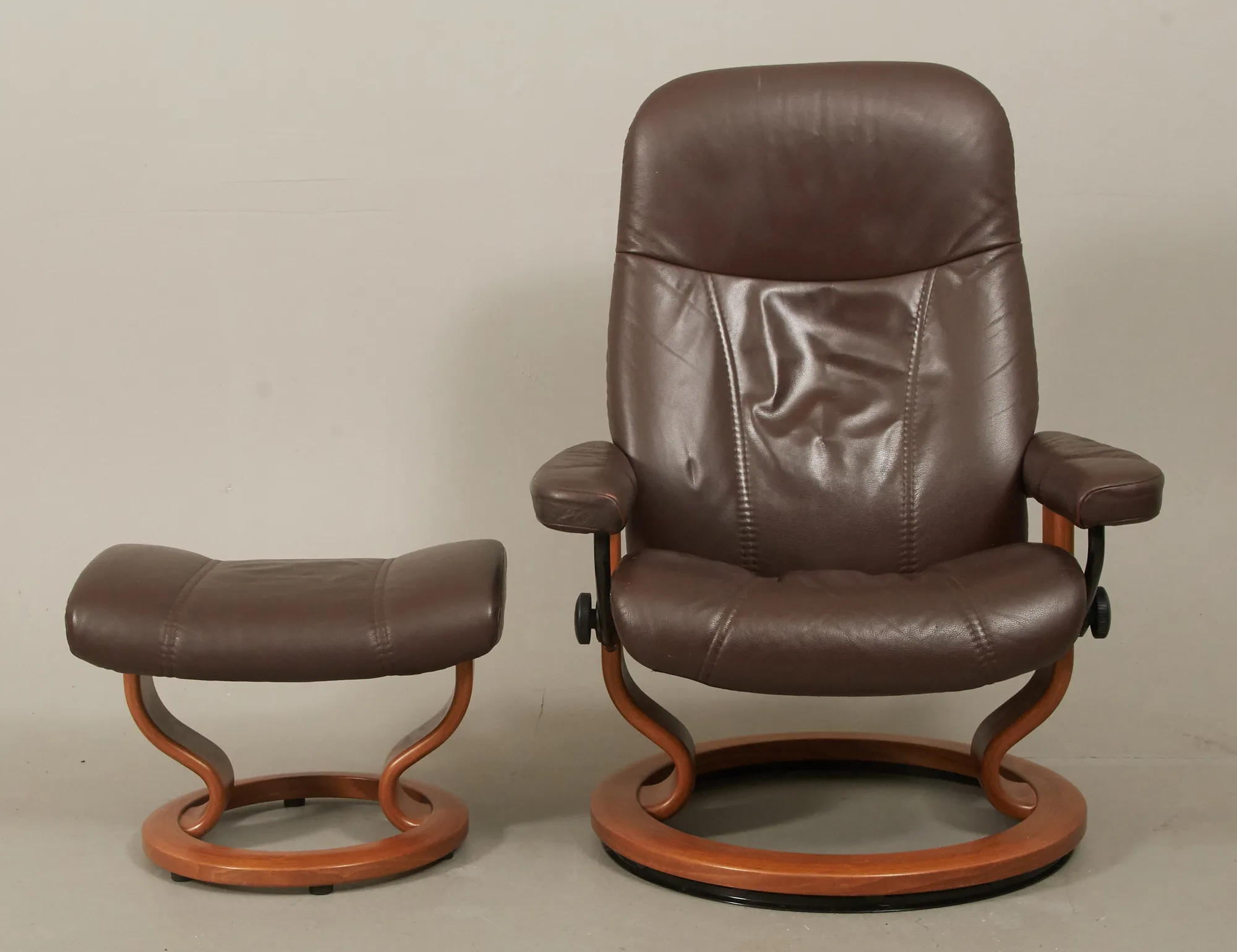 Fåtölj med fotpall. Brunt skinn, fot i ek, ställbar. Etikettmärkt, bruksslitage.