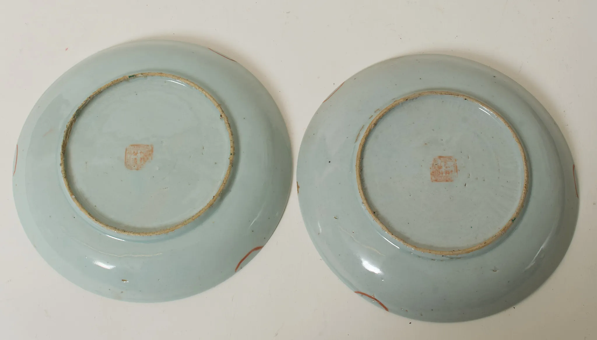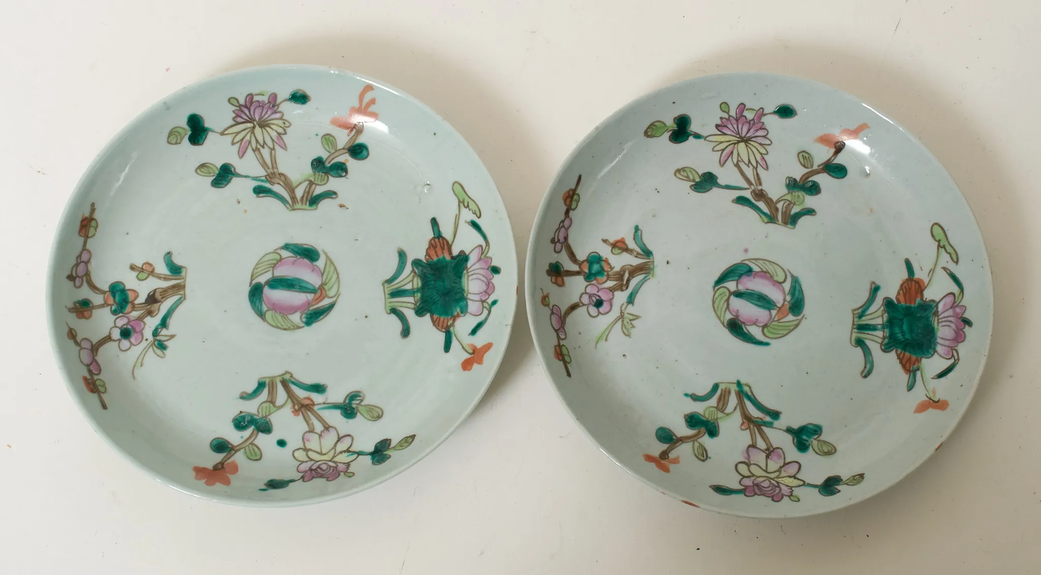 Ett par, dekor i emaljfärger med växtlighet, diam 22 cm, sprickor.