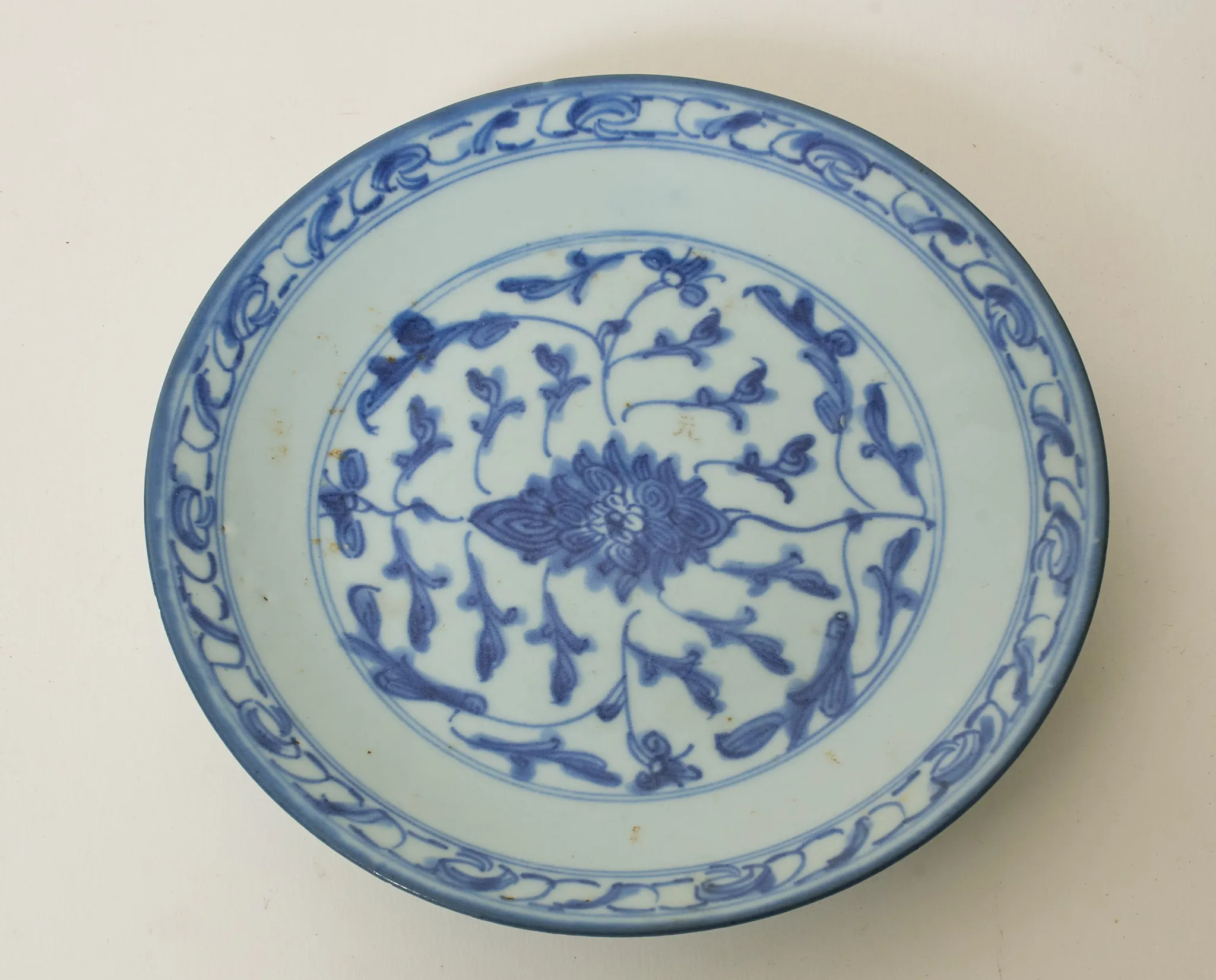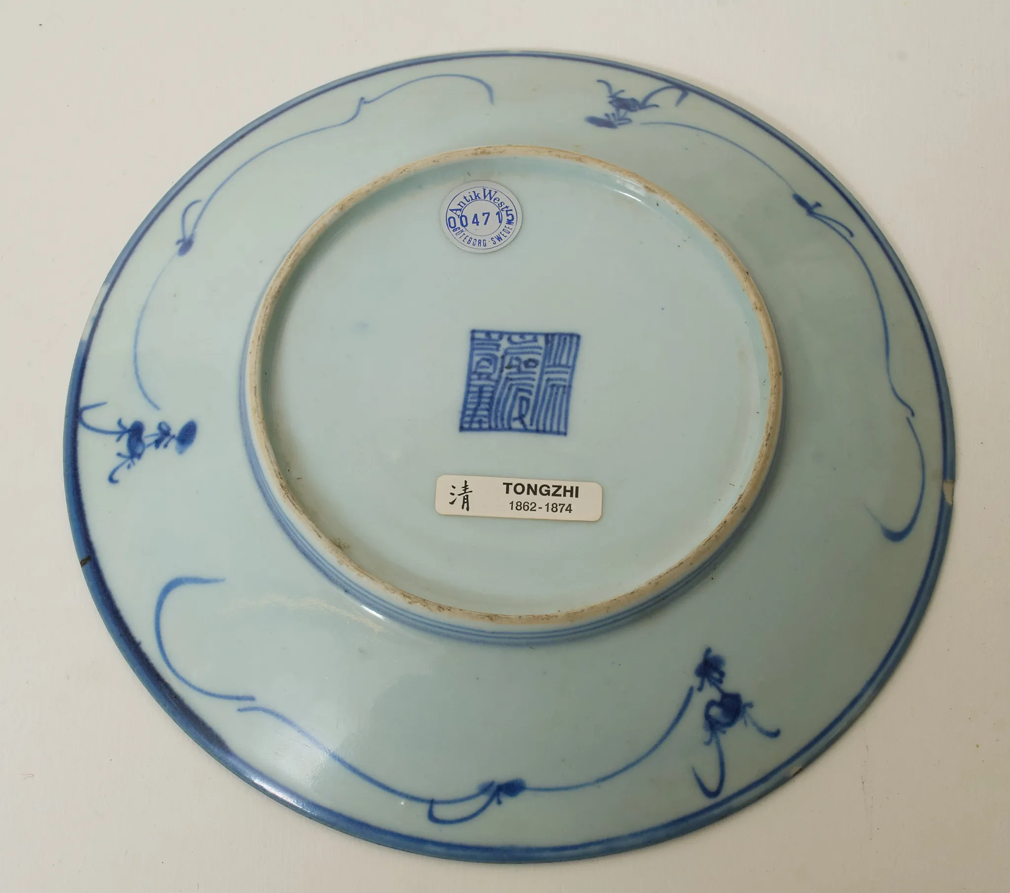 Dekor i underglasyrblått, diam 19,5 cm. Nagg i underkant.