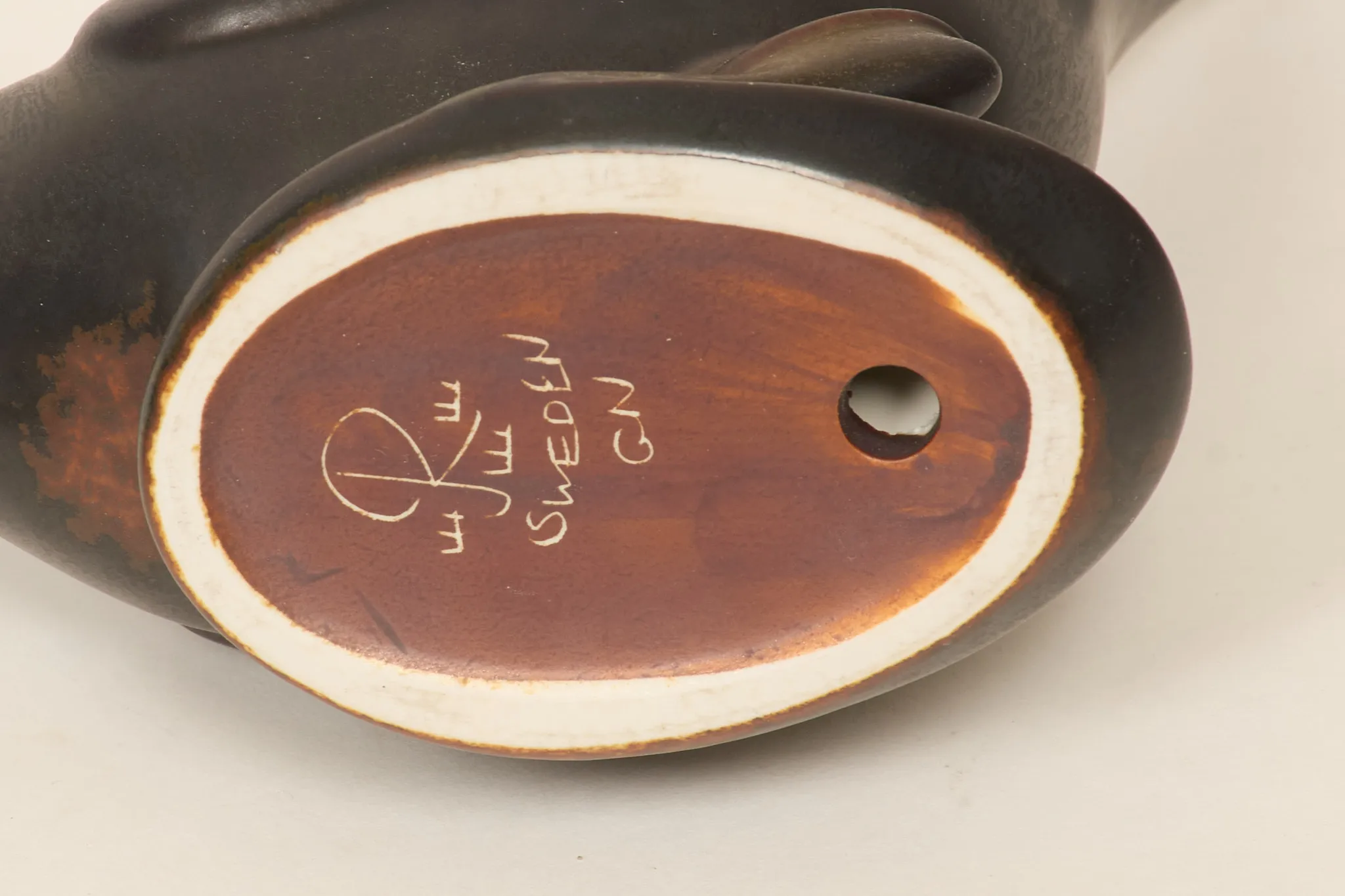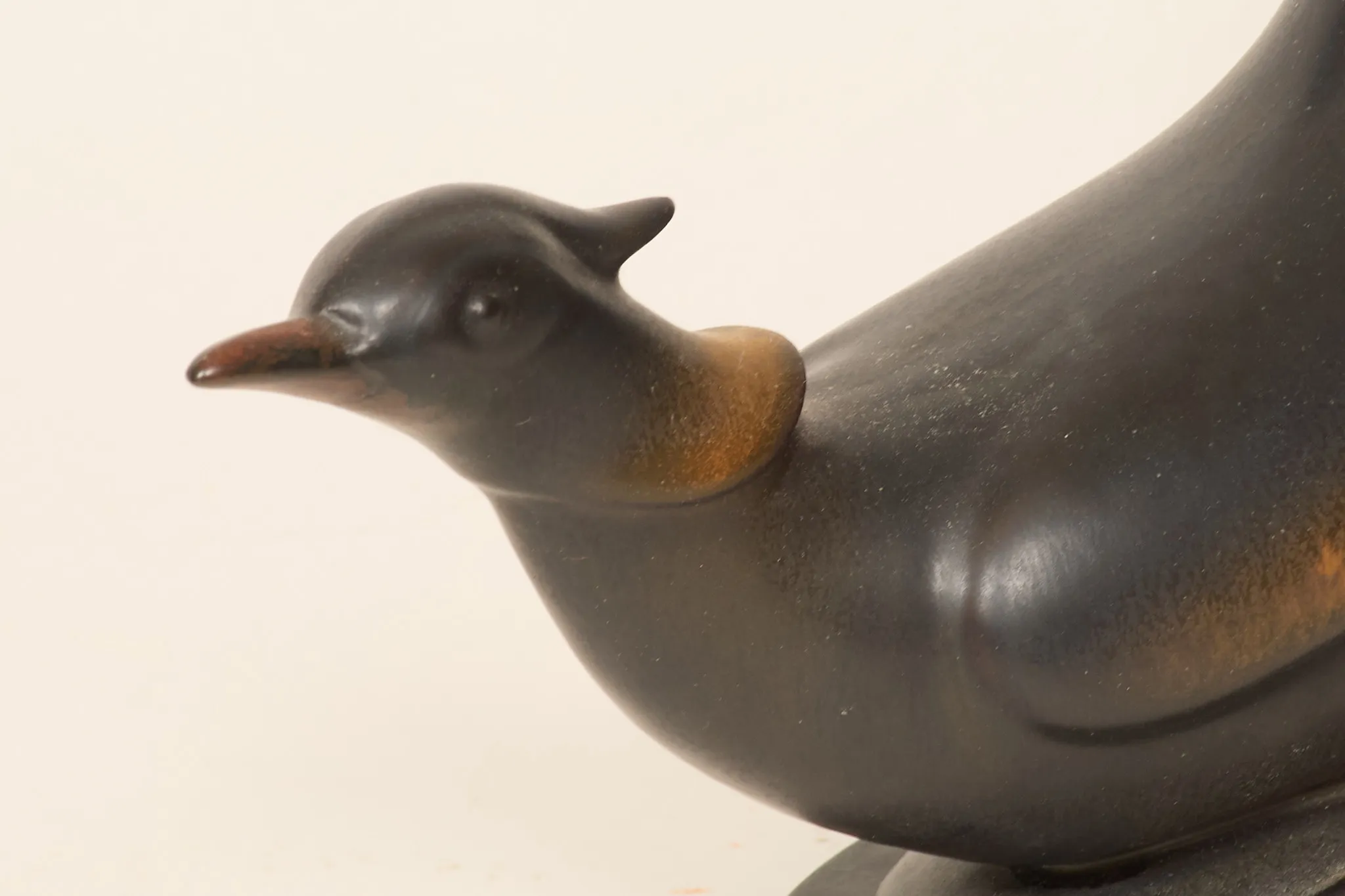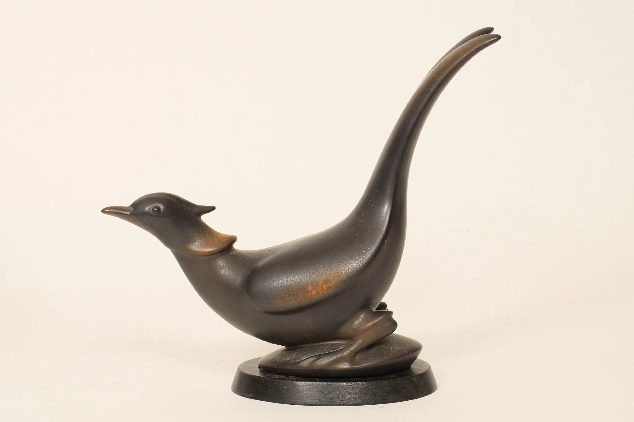 I form av fågel, glaserat stengods, sockel i trä medföljer, höjd utan sockel 22 cm, smärre bruksslitage.