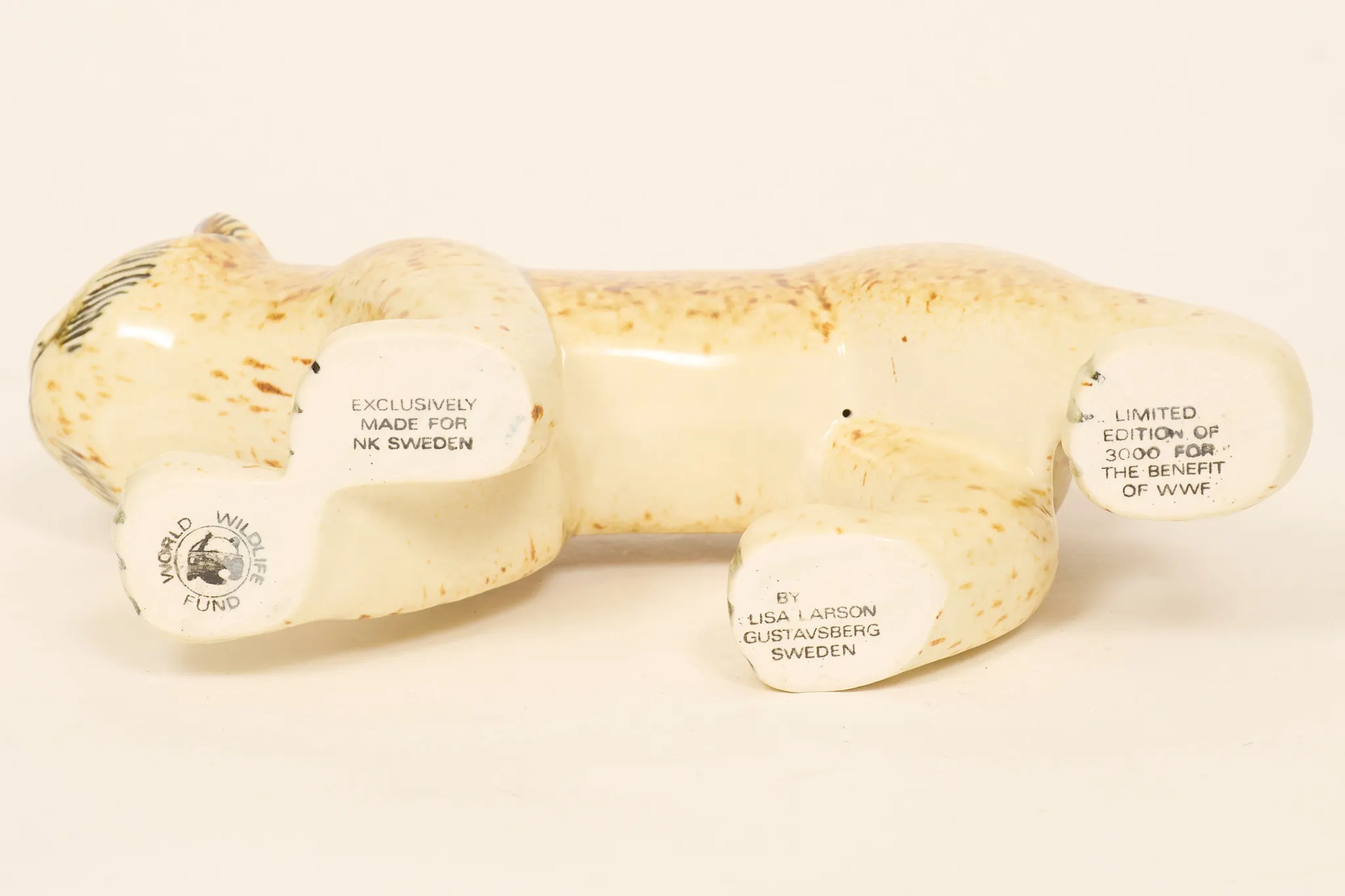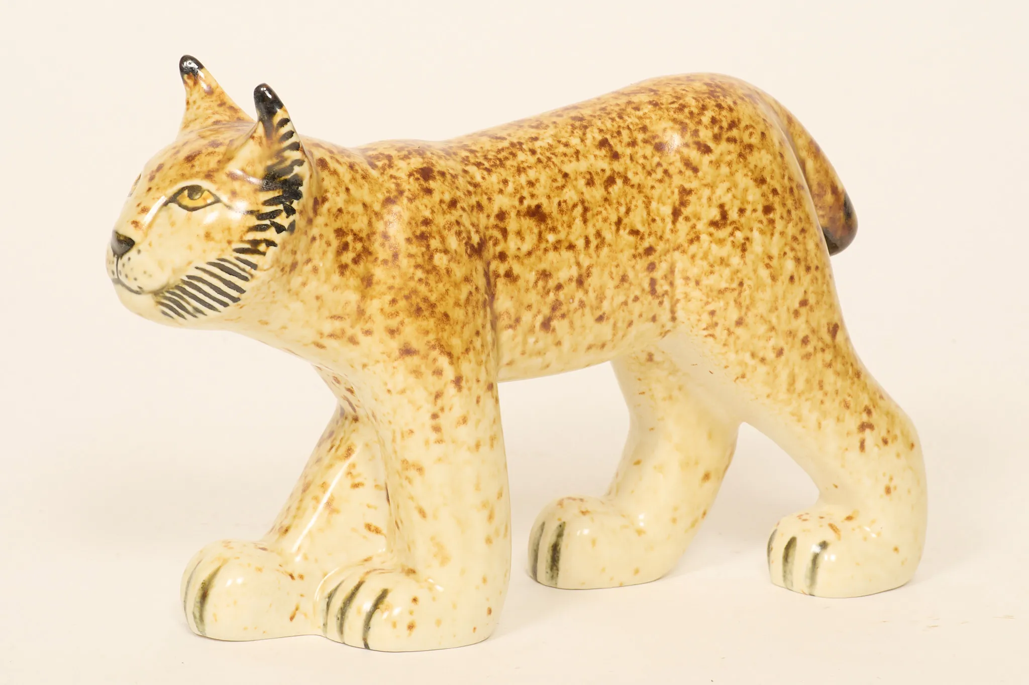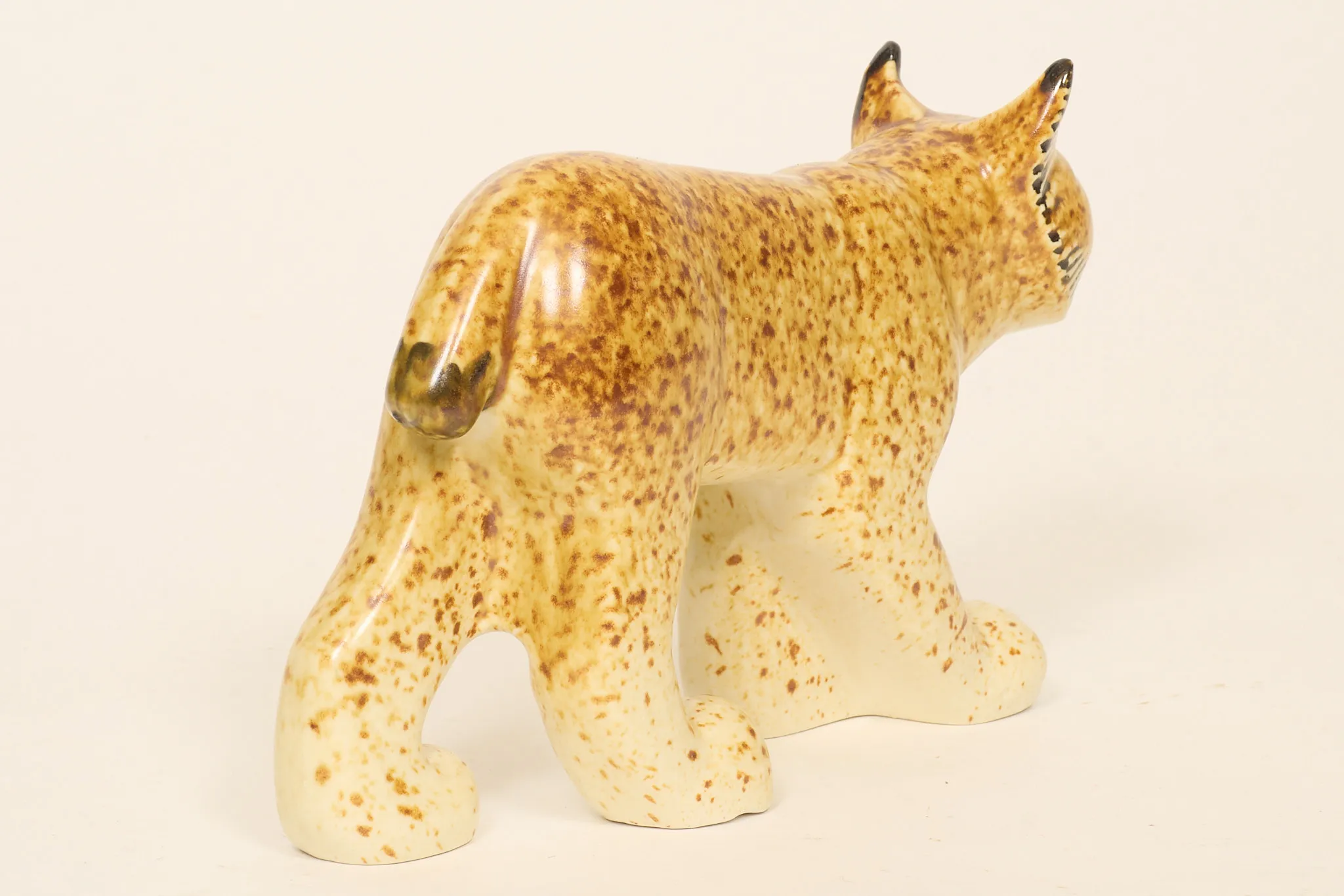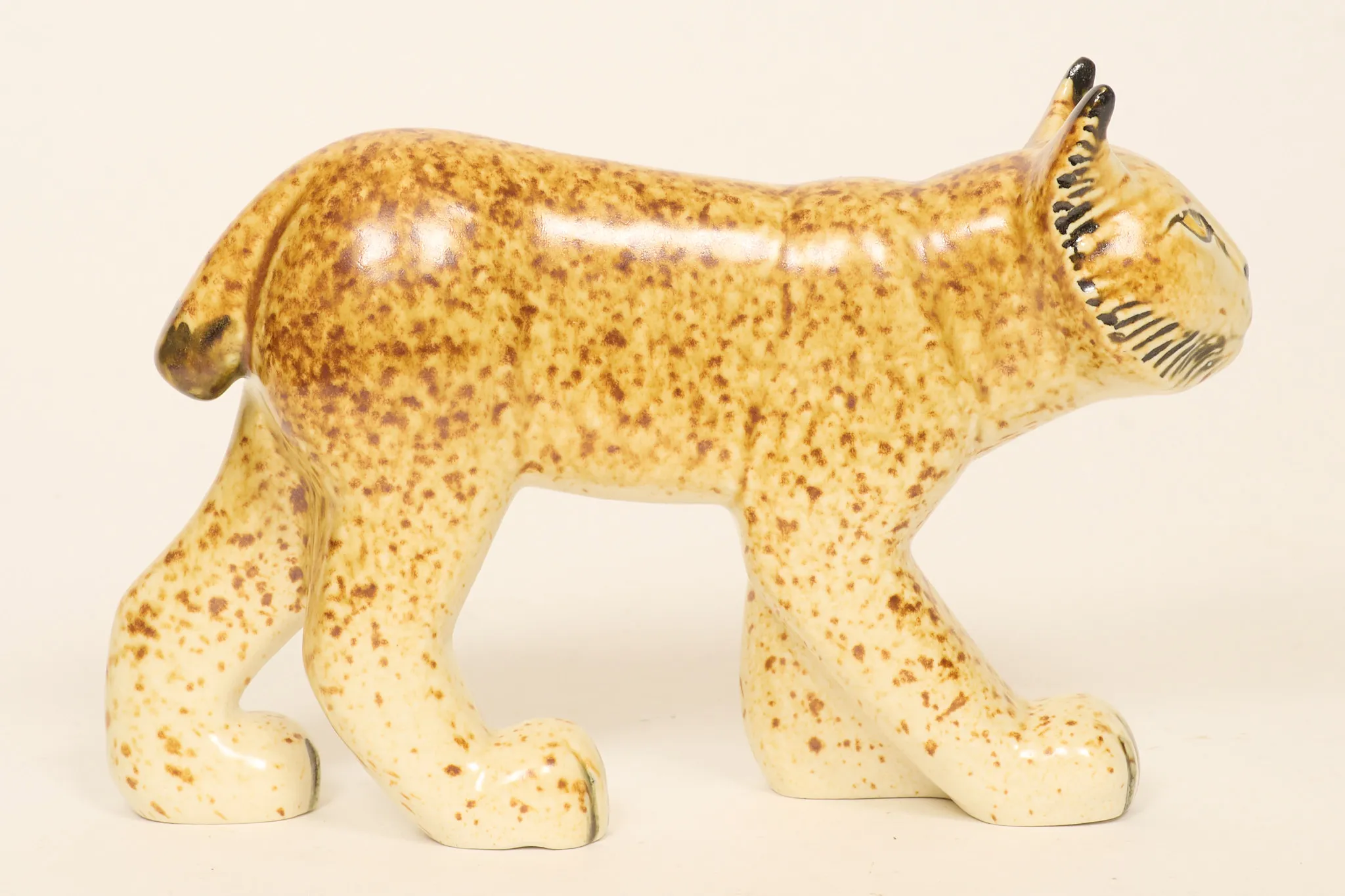 I form av lodjur, ur serien utrotningshotade djur, för NK, WWF. Glaserat stengods, stämpelsignerad, höjd 15 cm, fint skick.