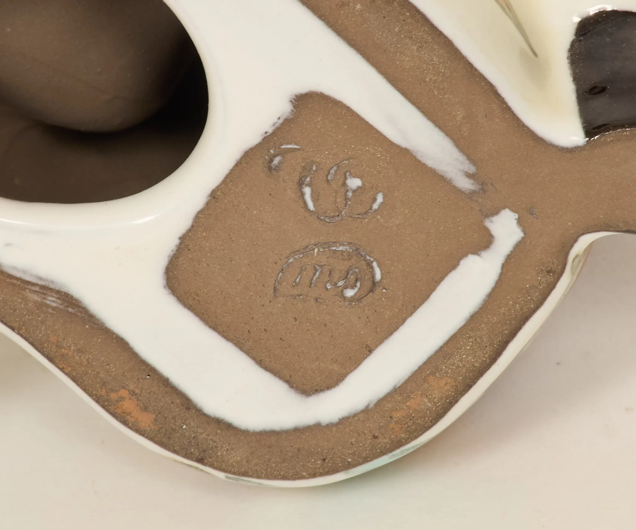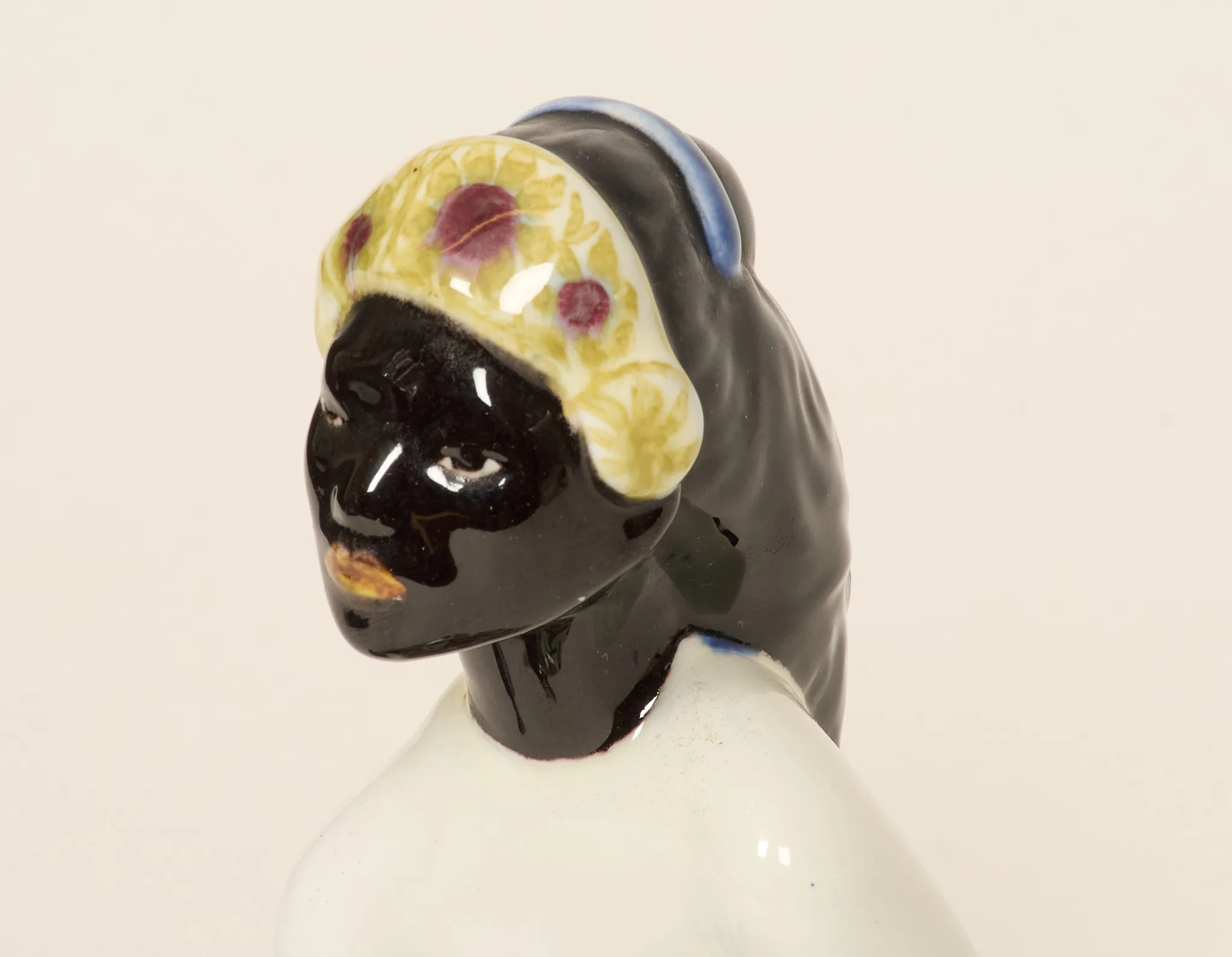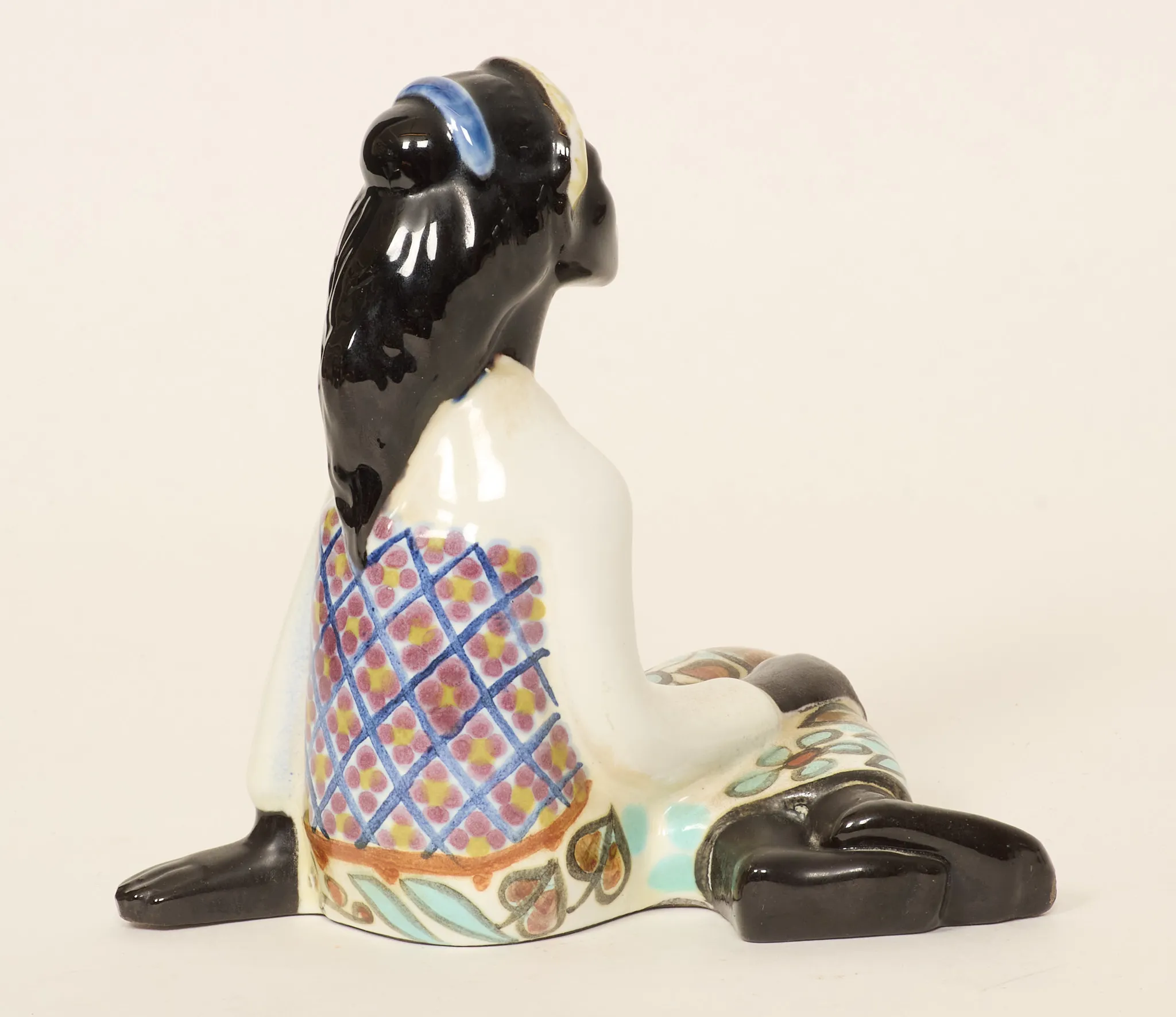 I form av sittande kvinna, glaserat stengods, höjd 18 cm, smärre bruksslitage, men mindre glasyrbortfall förekommer.
