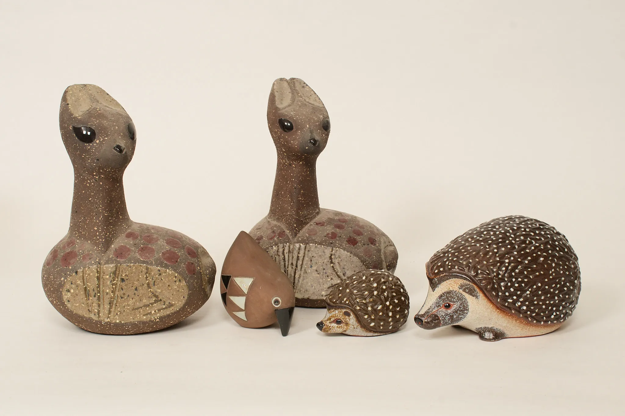 5 delar, i form av rådjur, igelkott, fågel. Höjd 7 - 28 cm. Bruksslitage, ytsmuts.