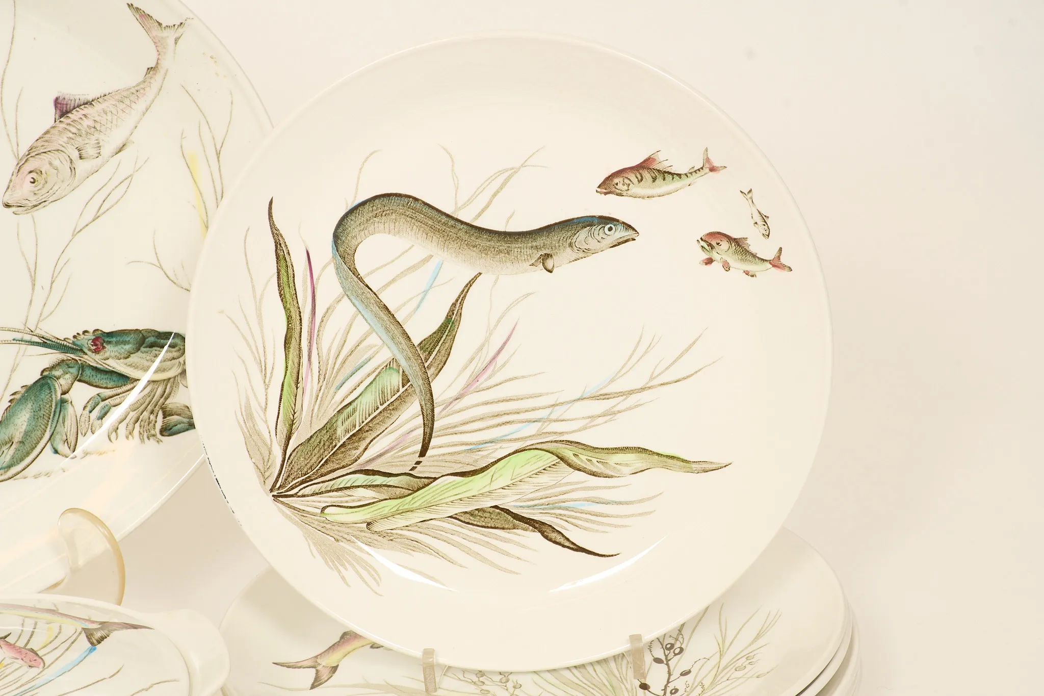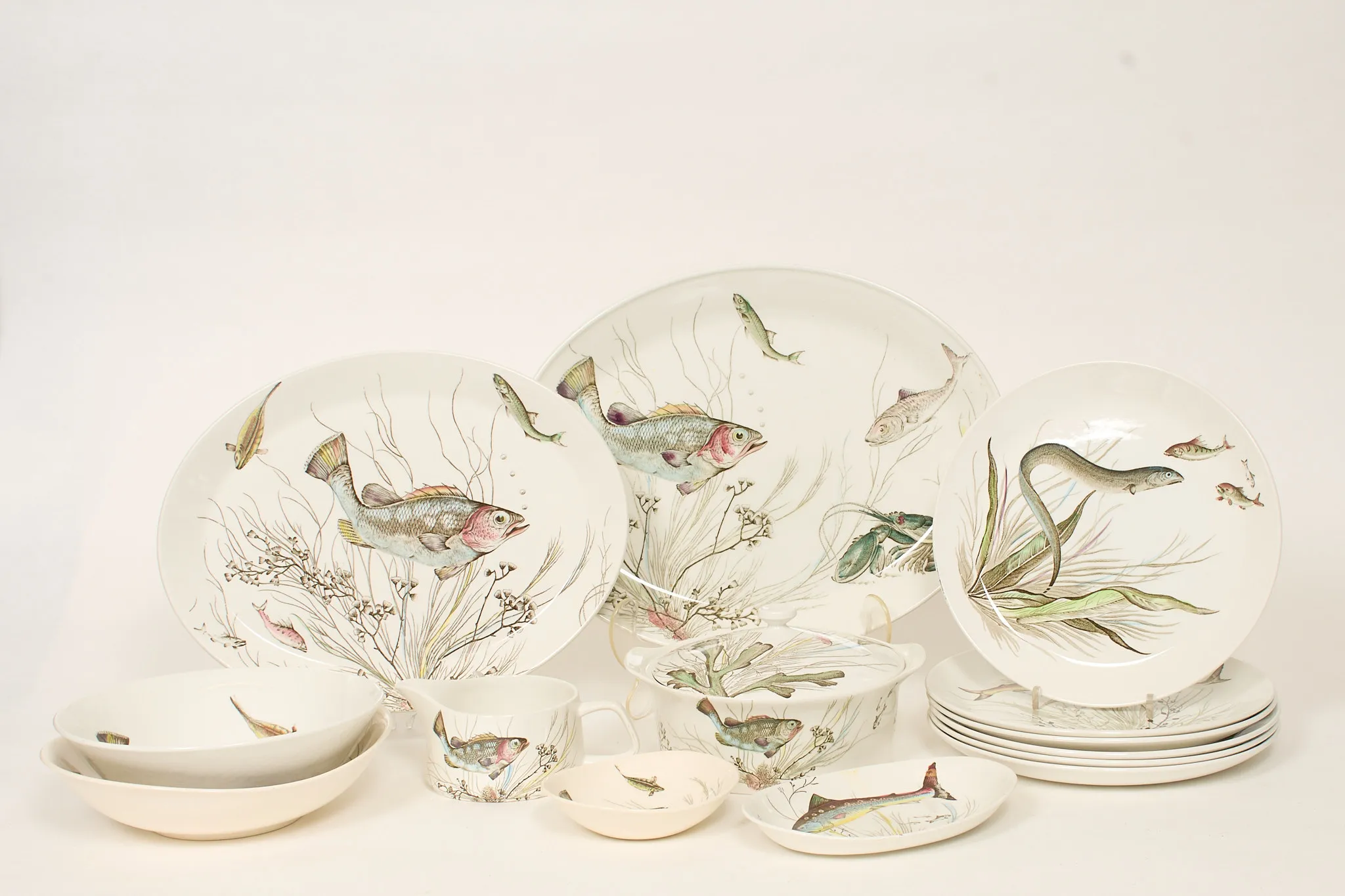 16 delar. 6 mattallrikar, 2 uppläggningsfat, terrin, 4 skålar, samt såskanna. Smärre bruksslitage. Ett litet nagg på ett uppläggningsfat.