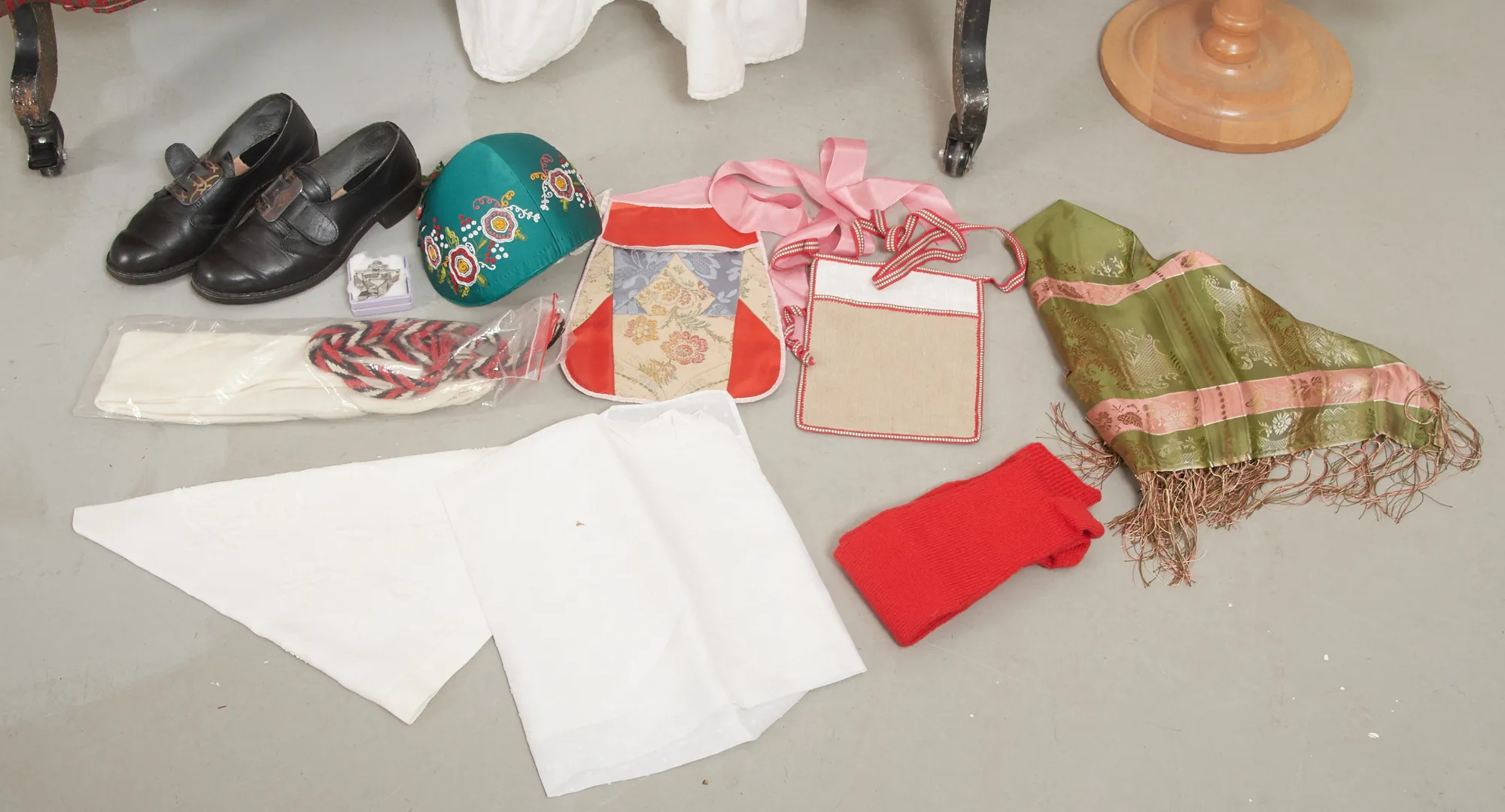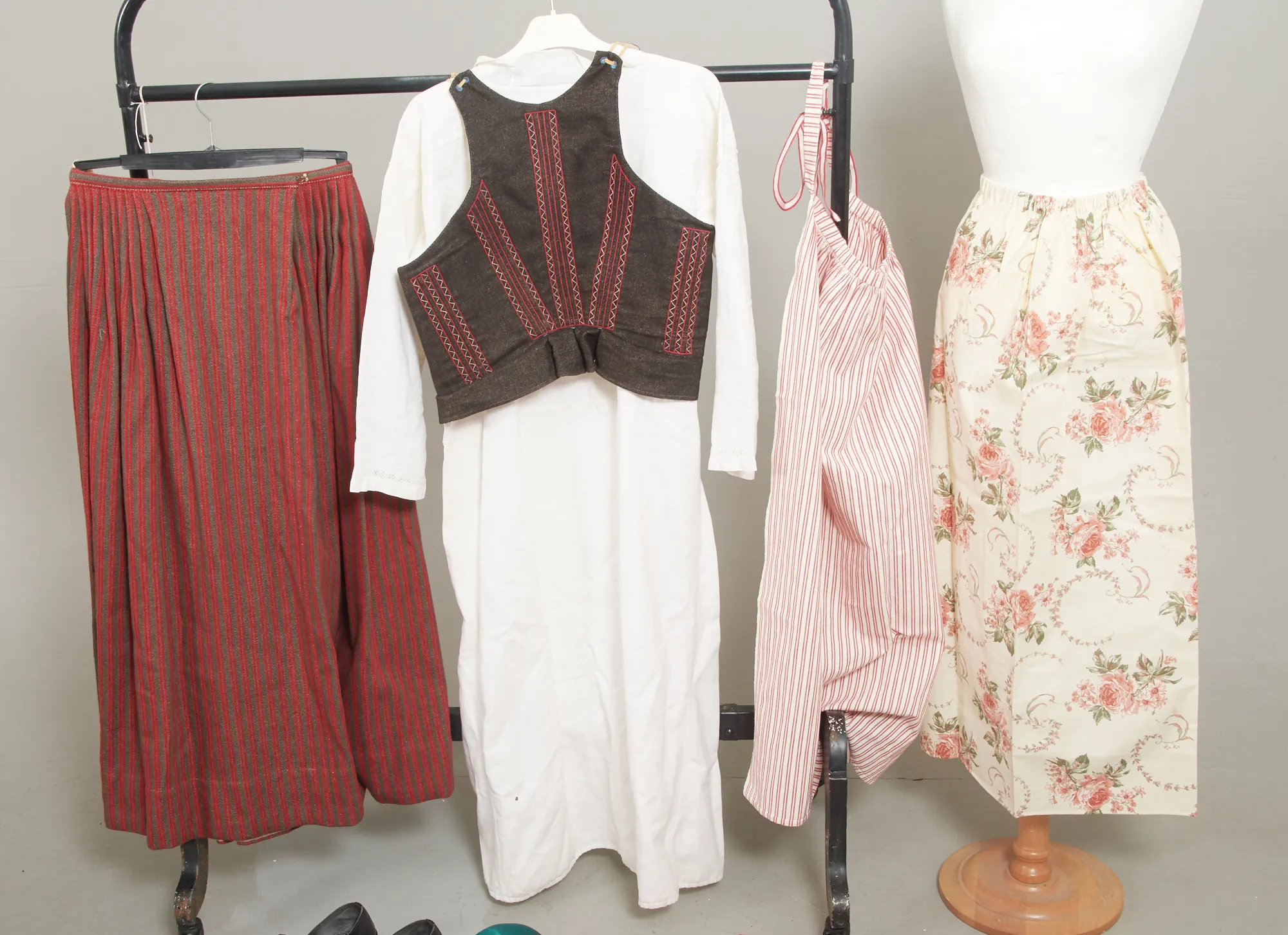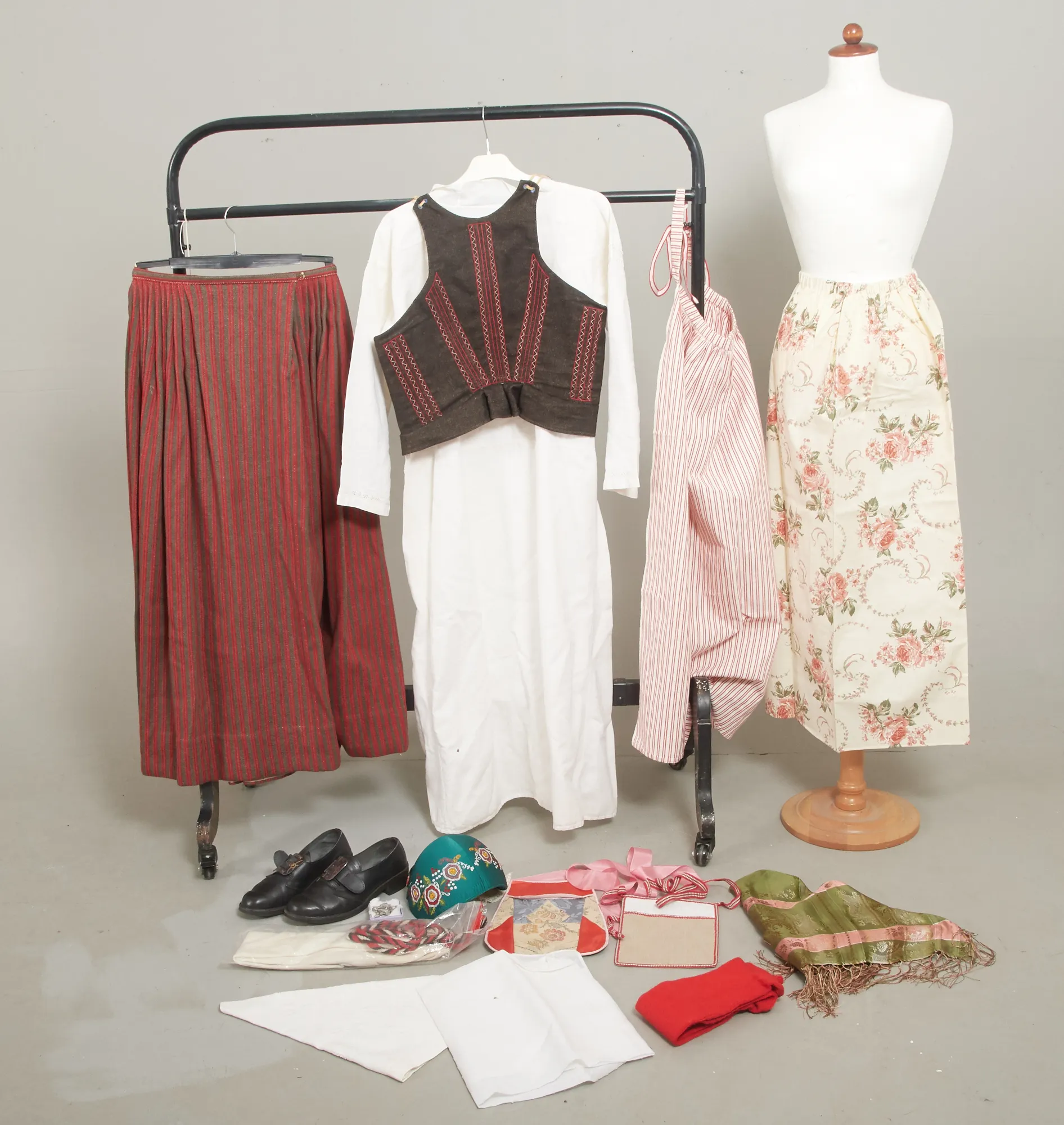 Handsydd, 10 delar. Rödrandig kjol, vit särk BWD=Bonja Werners dotter, svart väst, grön sidensjal, tennsmycke, broderad grön bindmössa med stycke, svarta skor storlek 39, kjolficka, vita strumpor+flätade strumpeband, rödrandigt förkläde. Bruksslitage