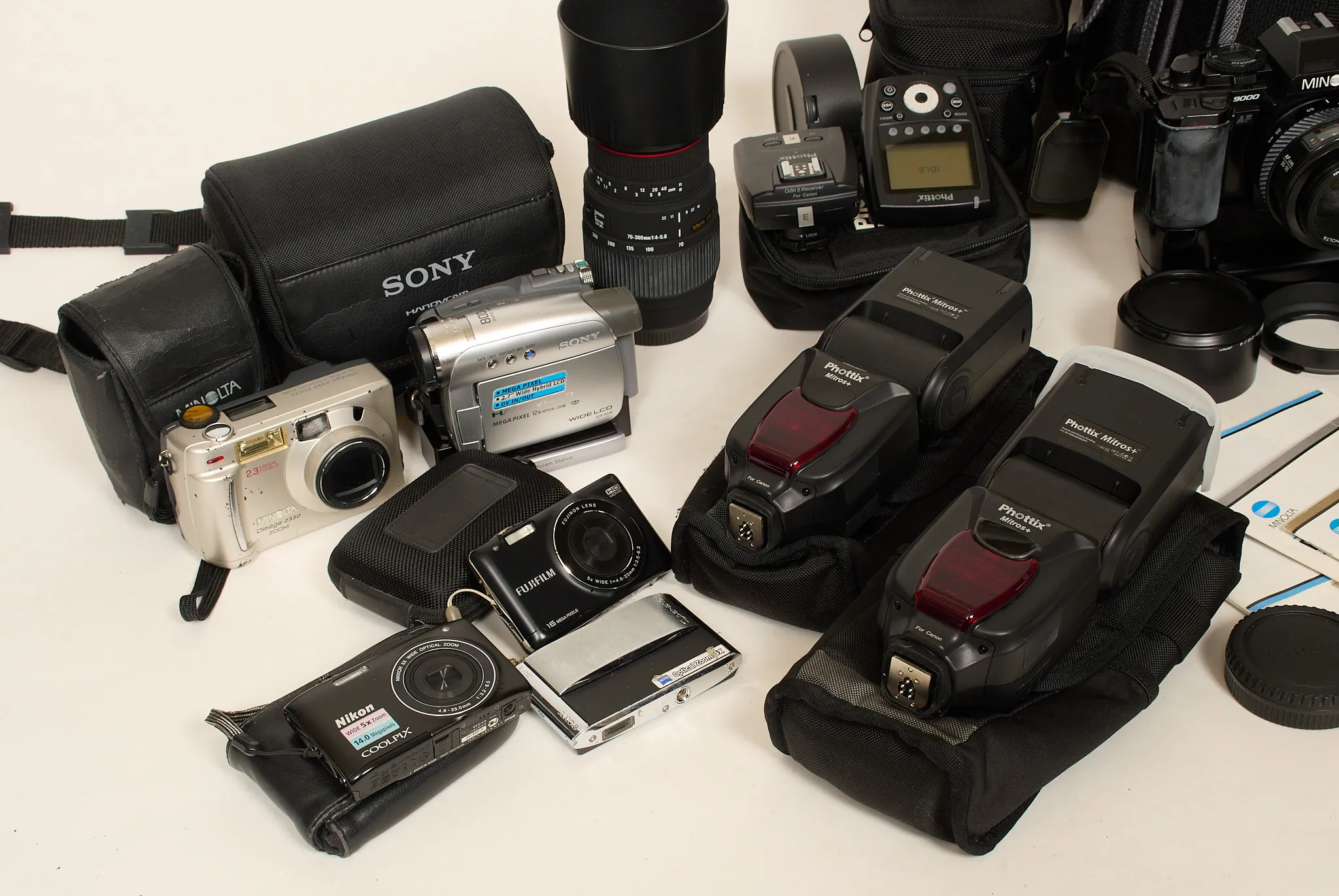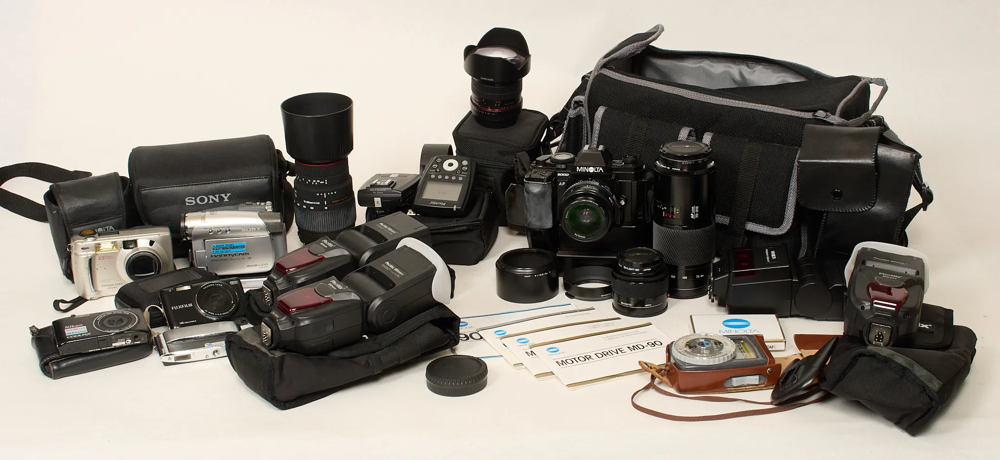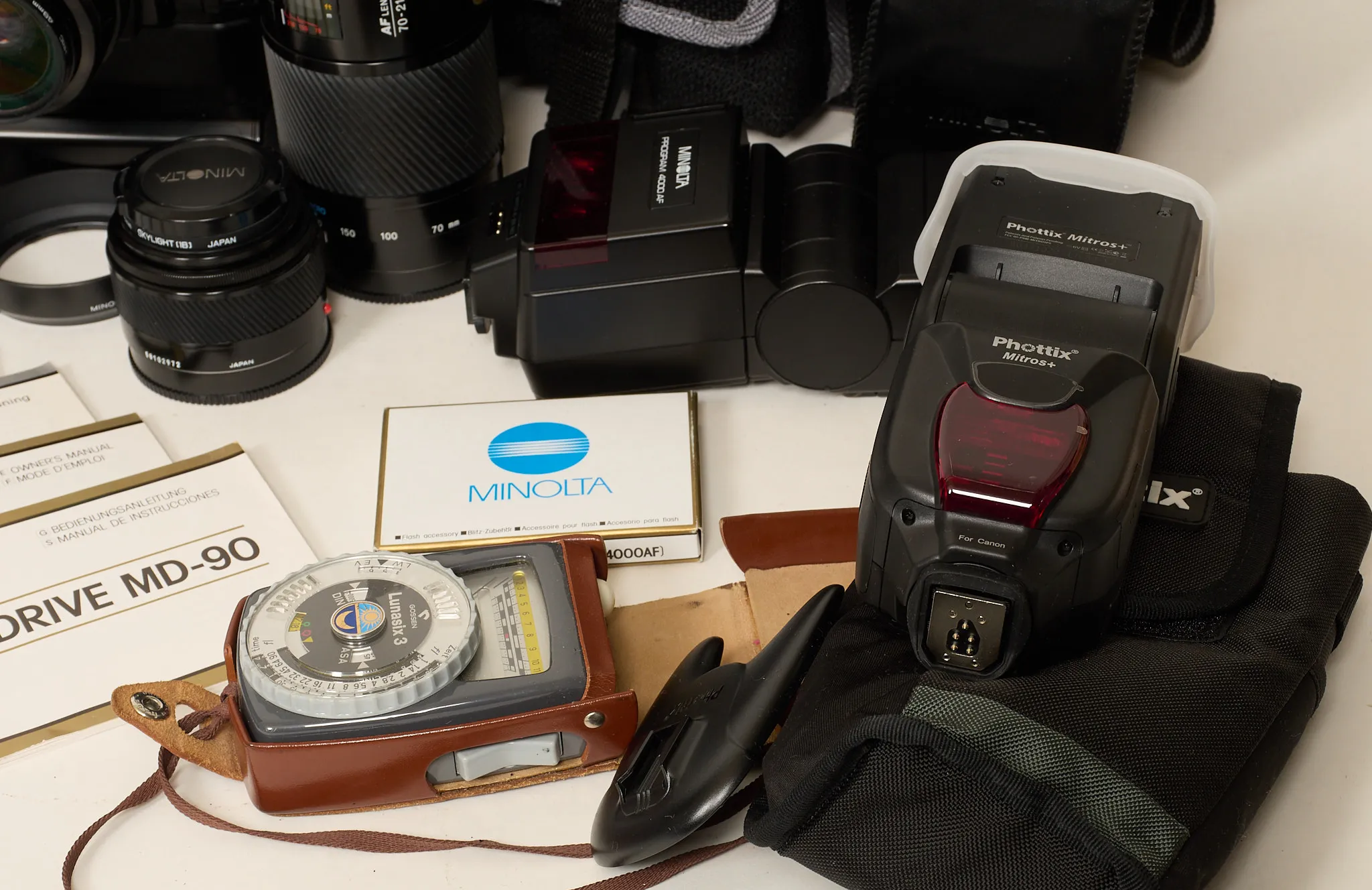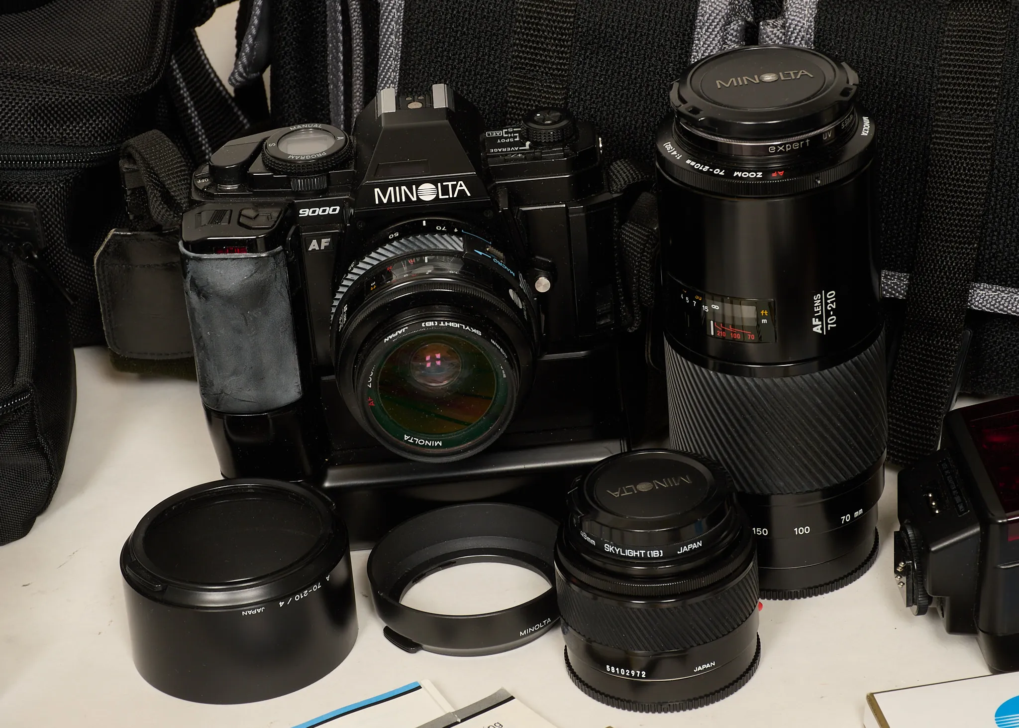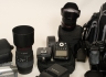Minolta 9000 Af med Winder, objektiv AF 70-210 mm, Objektiv AF 28 mm, objektiv AF 35-70 mm, blixt 4000 AF, 3 st blixtar Phottix, Nikon coolpix, sony cyber-shot, Fuji Kamera, objektiv Sigma APO 70-300mm, objektiv Samyang 2.8/14 mm. m.m.