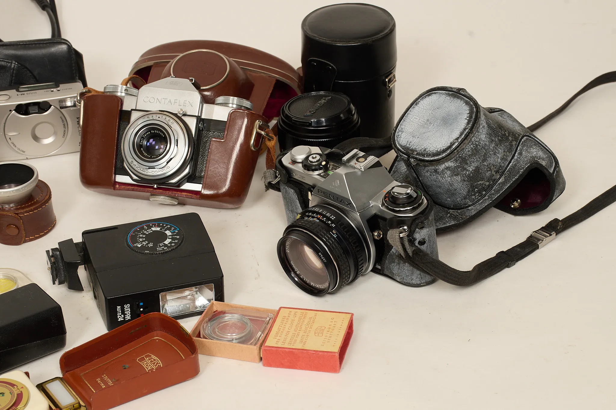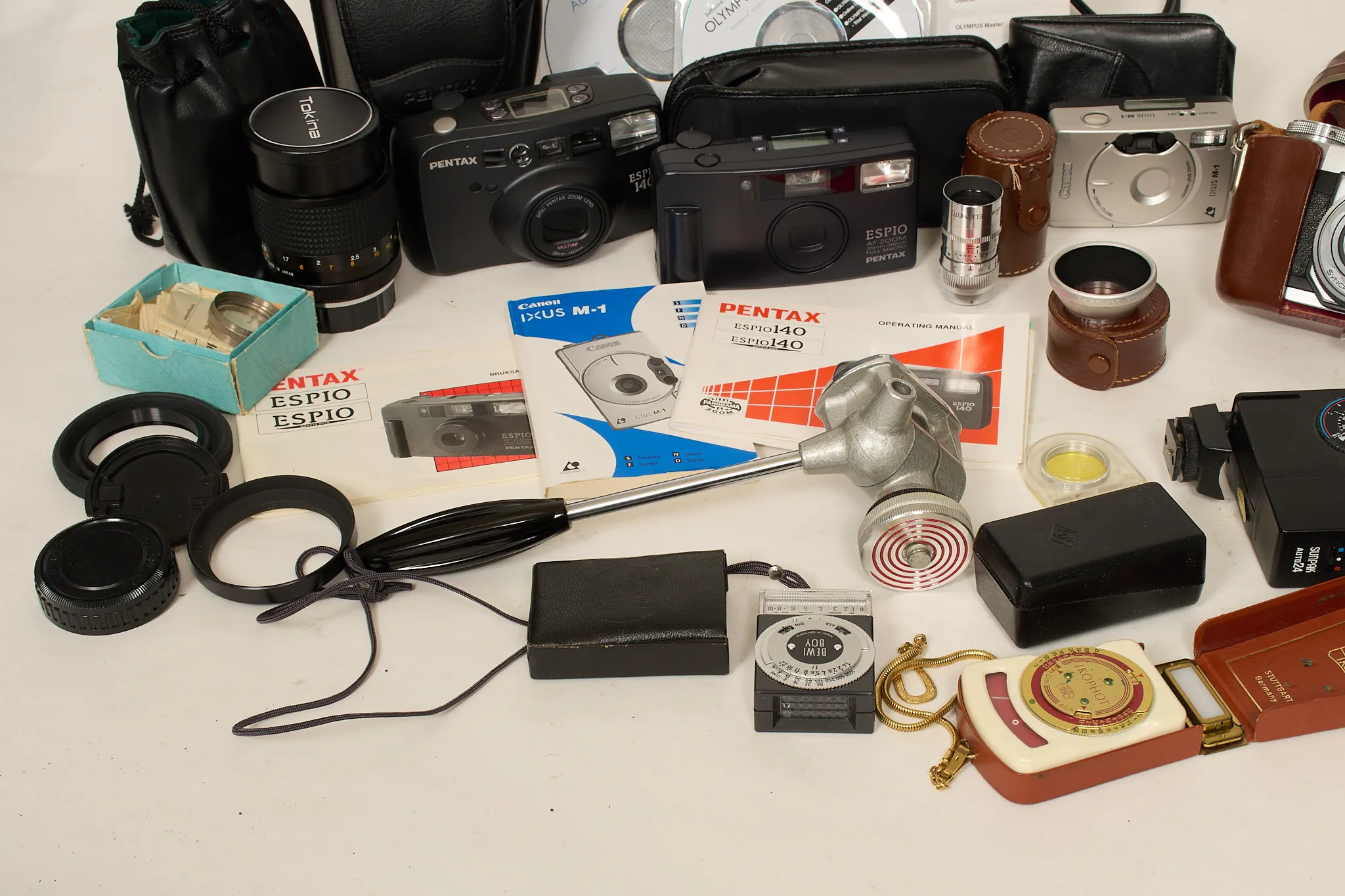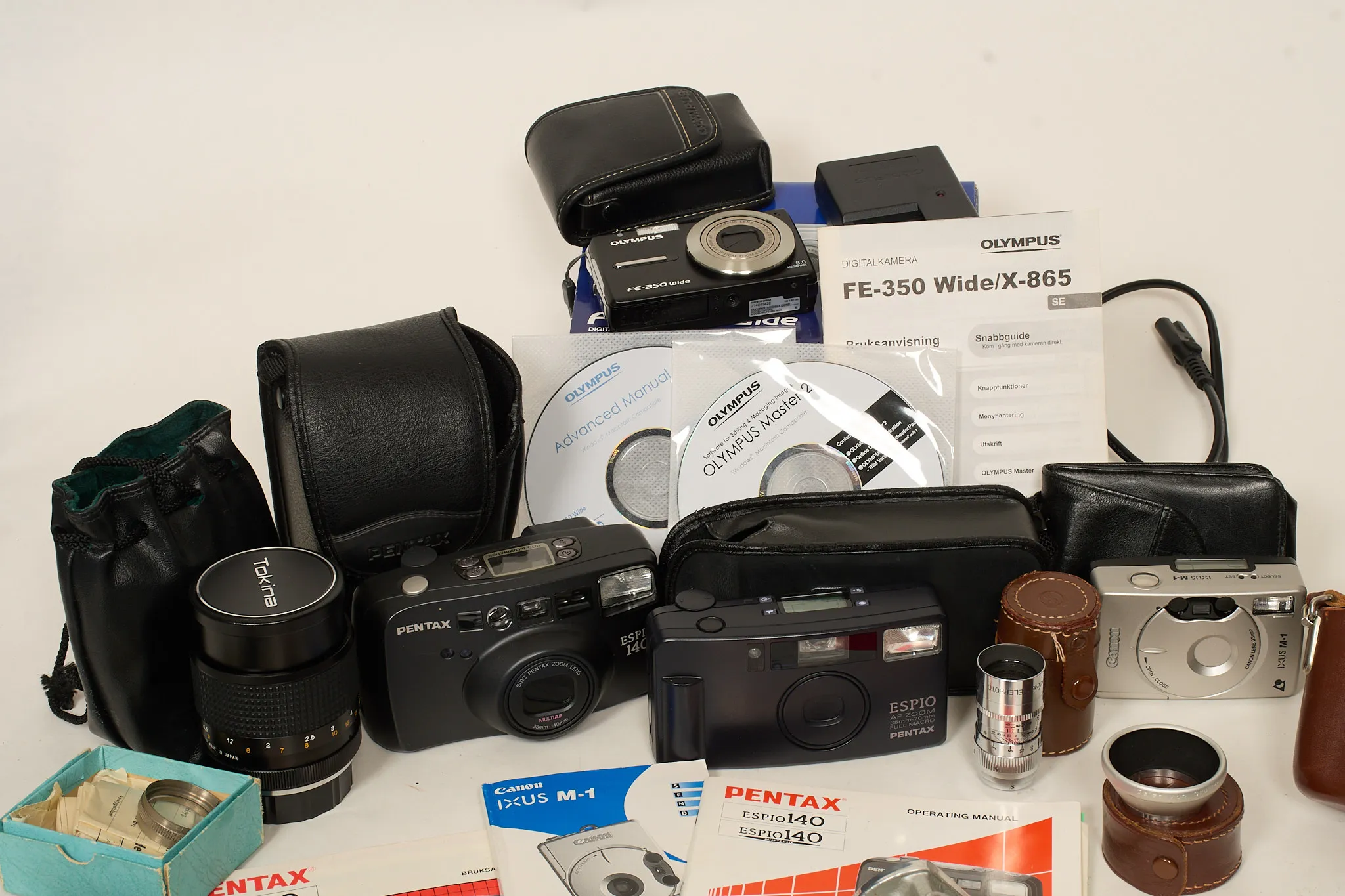 Pentax ME. Objektiv SMC 50 mm, objektiv Sakar auto f=28mm, objektiv Tokina 135 mm. Blixt Sunpak. Zeiss contaflex div linser mm. Olympus FE 350 med laddare. Pentax Espio AF Zoom, Pentax Espio 140, Canon IXUS M-I, ljusmätare mm. Ej funktionstestat.