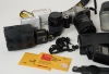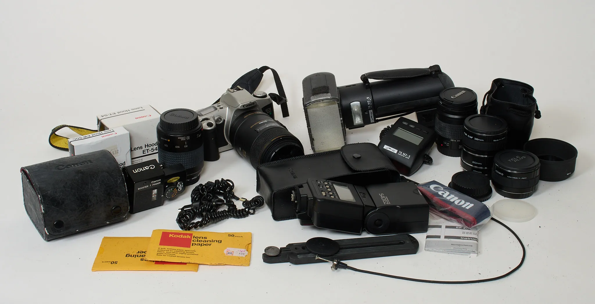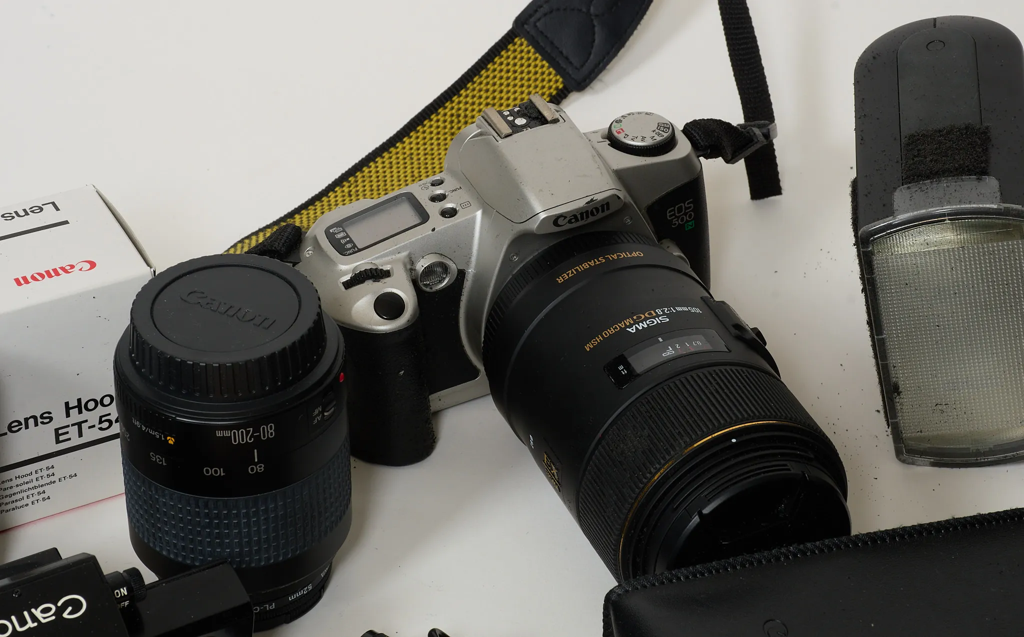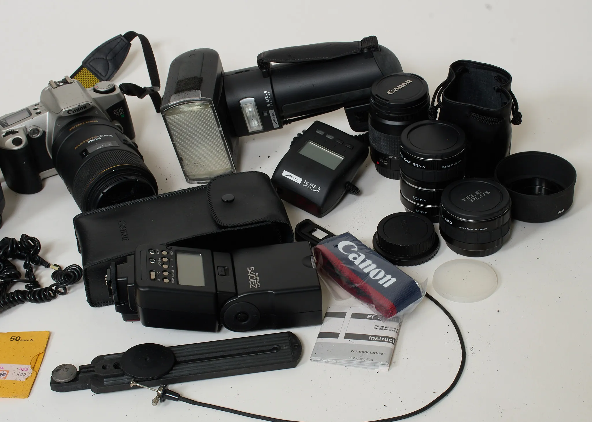 Canon EOS 500 n. Objektiv Canon zoom EF 28-80 mm, Objektiv Canon Zoom EF 80-200 mm, Sigma 105 mm DG Macro HSM, Kenko Teleplus MC7, Kenko Extension Tube, blixt Canon 540 EZ, blixt Metz 76 MZ-5, Canon Booster T Finder, lens hood mm. Ej funktionstestat.