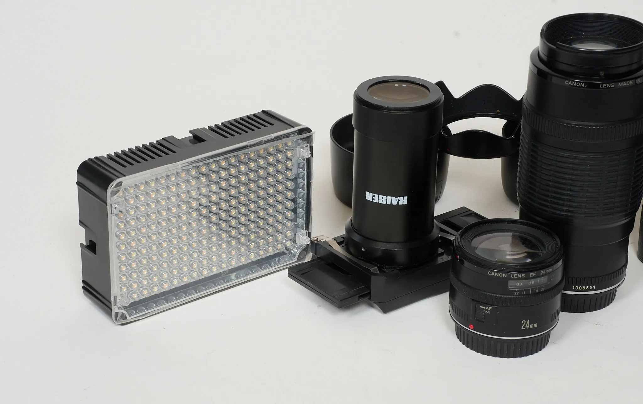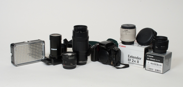 Canon EOS 100, Canon zomm EF 70-120 mm, Canon EF, 24 mm, 1:28, Canon EF 50 mm, Kaiser diaduplikator, Aptur ledlampa motljusskydd.