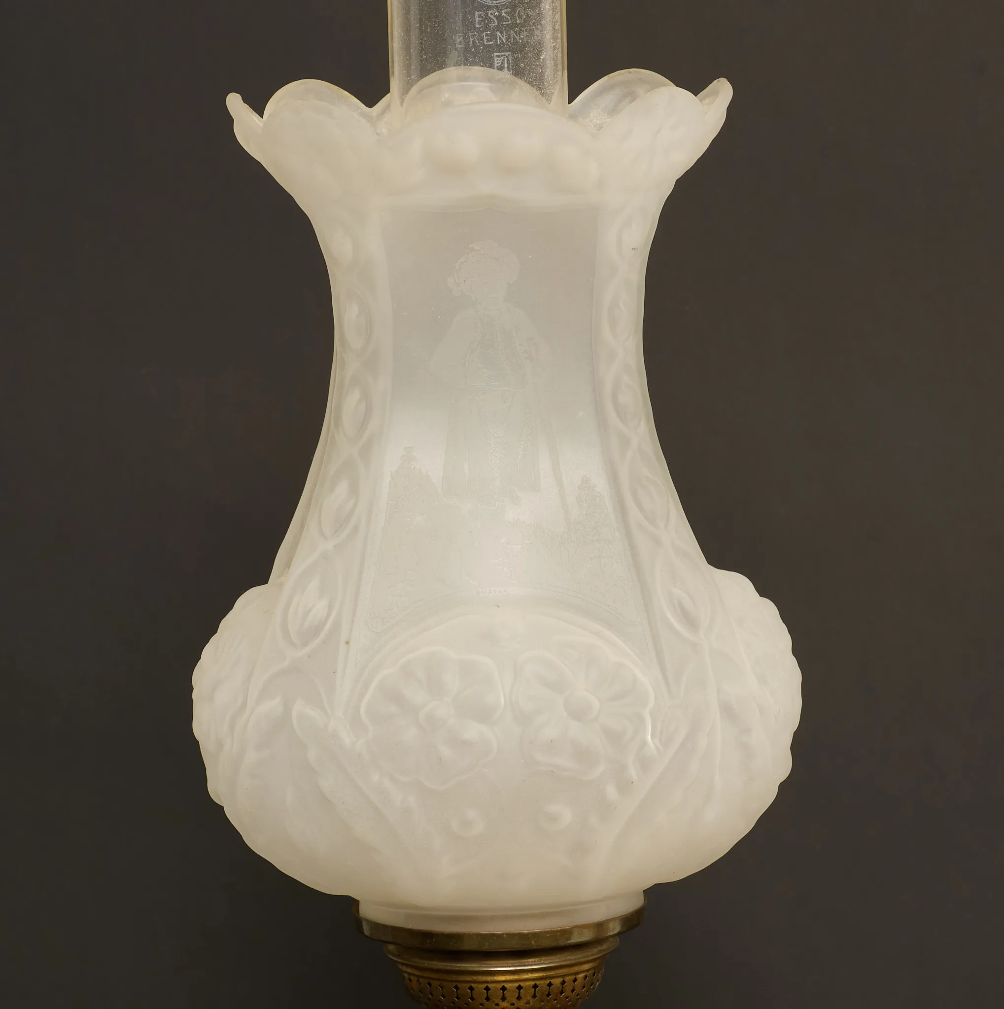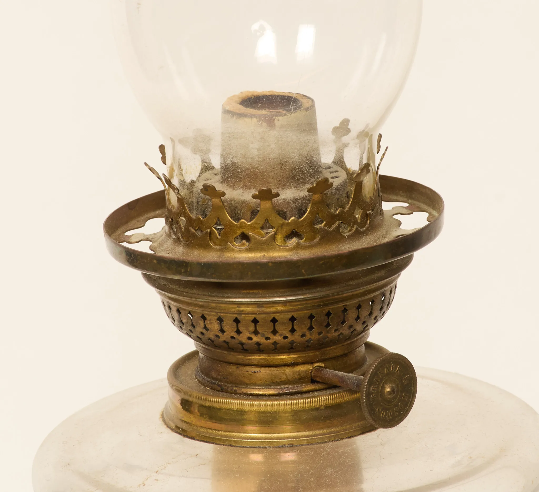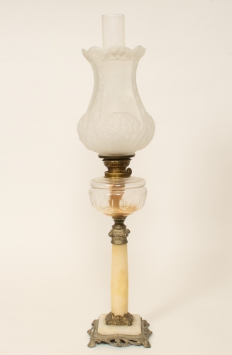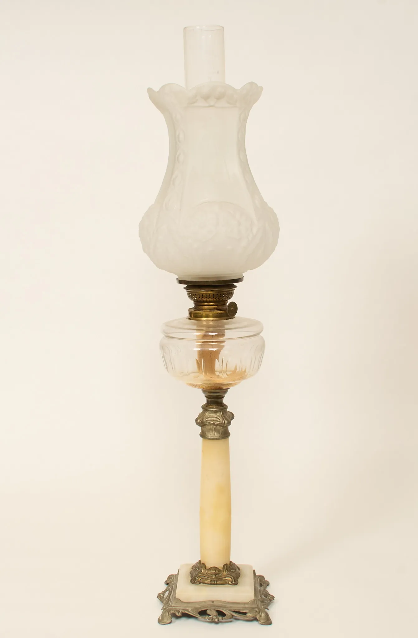 Fot i marmor och metall med kupa i glas. Höjd inkl brännrör 74 cm. Bruksslitage, glasdel på foten limmad på metall.
