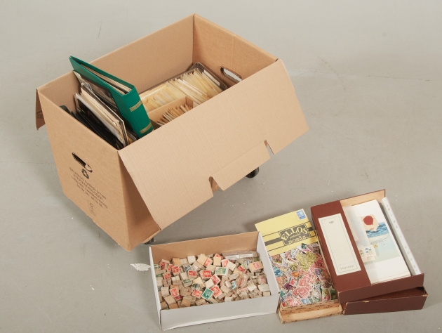 "Fyndlåda", samling Island, Grönland, Färöarna, Åland. 100 buntar H.V frimärken i pengamyntkuvert, brev mm.