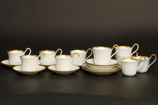 5 koppar med fat, en tekopp med fat, 3 assietter, 4 koppar, samt ett extra fat till tekopp. Vissa delar II:a, samt III:e sortering, bruksslitage, visst dekorslitage.