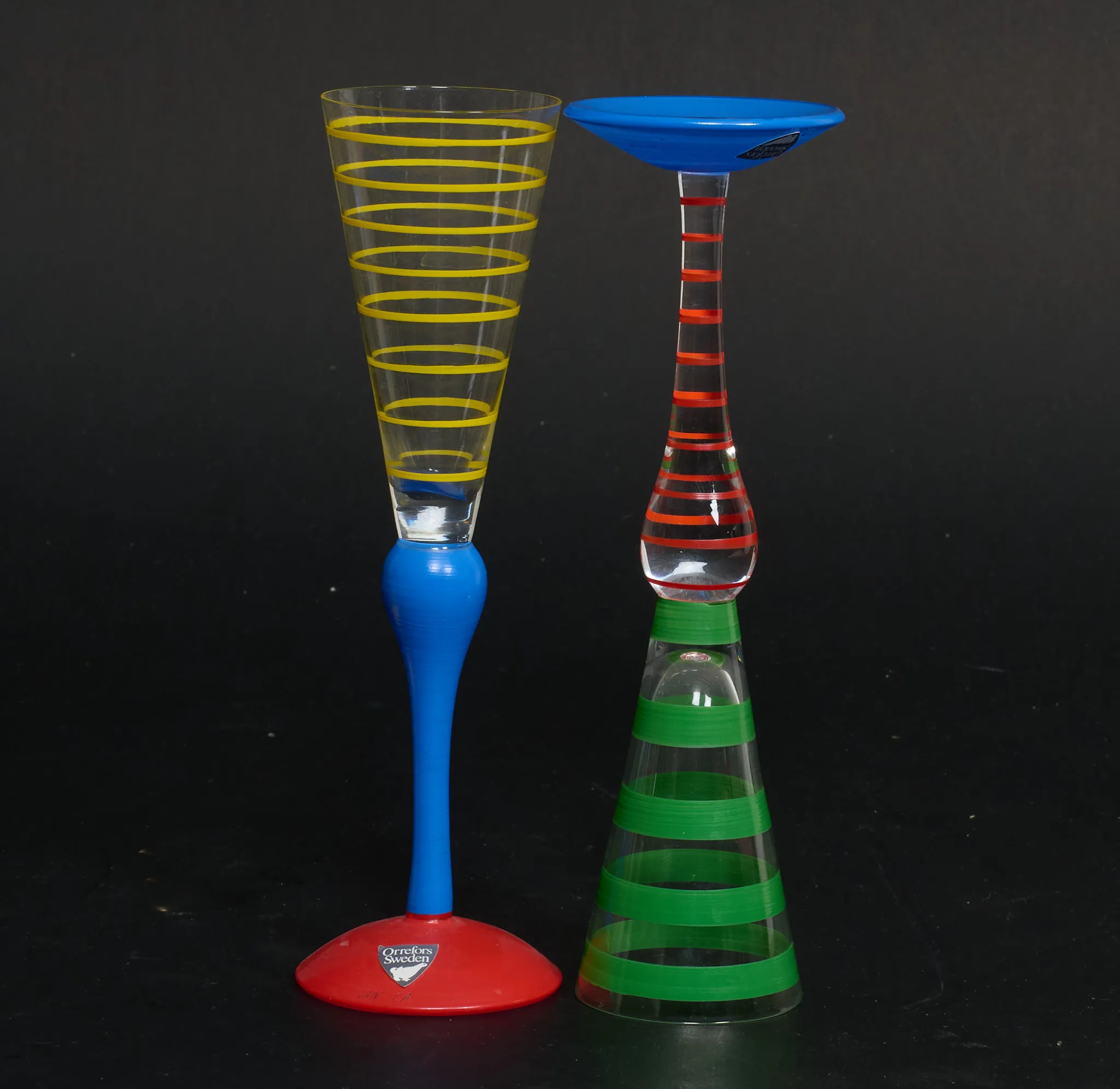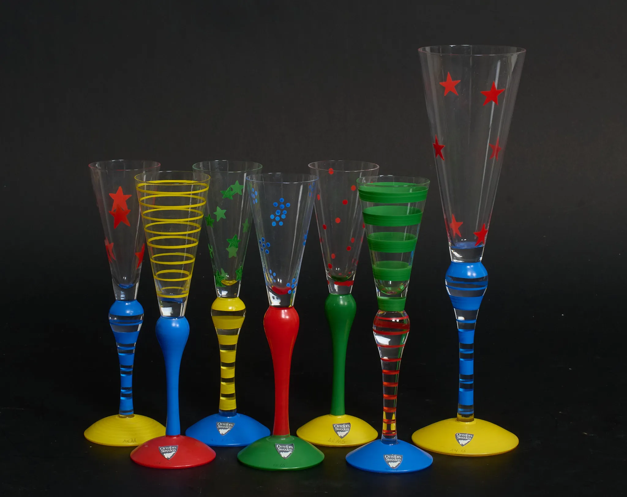 6 st snapsglas samt 1 champagneglas. Höjd 19-27 cm. Signerade, smärre bruksslitage.