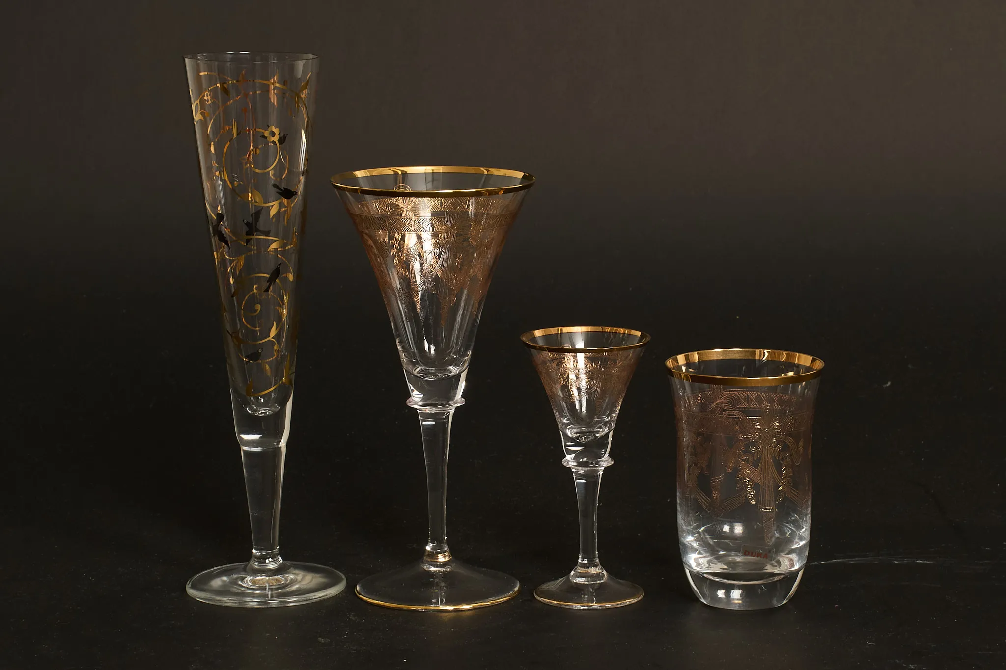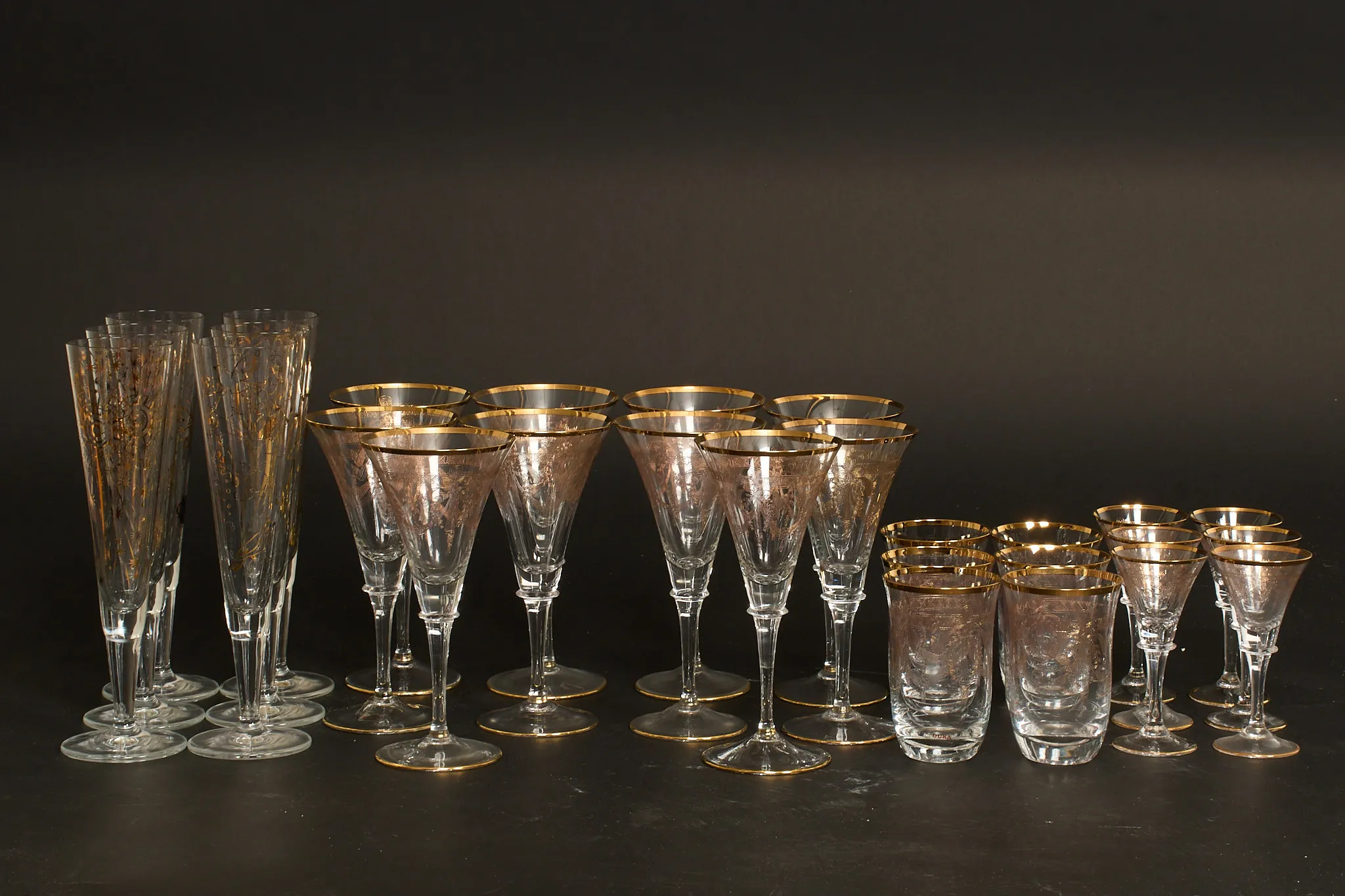 10 vinglas, höjd 18,5 cm, 6 dricksglas, höjd 10,5 cm, 6 snapsglas, höjd 12 cm, samt 6 cahampagneglas annan tillverkare, höjd 24, smärre bruksslitage.