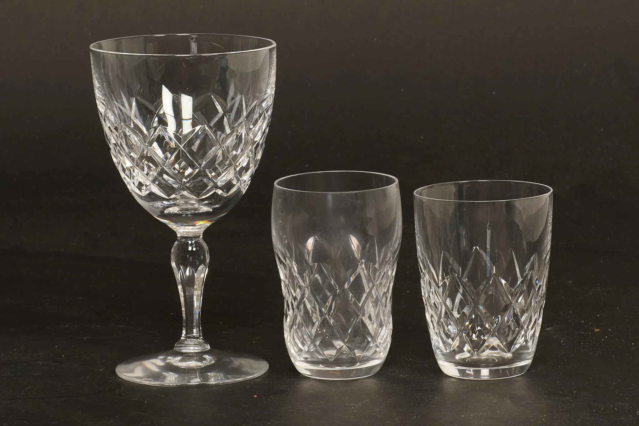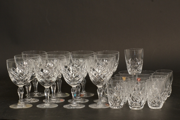 12 vinglas, höjd 15 cm, 13 vattenglas (olika modeller), höjd 8 cm, flertal etikettmärkta, smärre bruksslitage.
