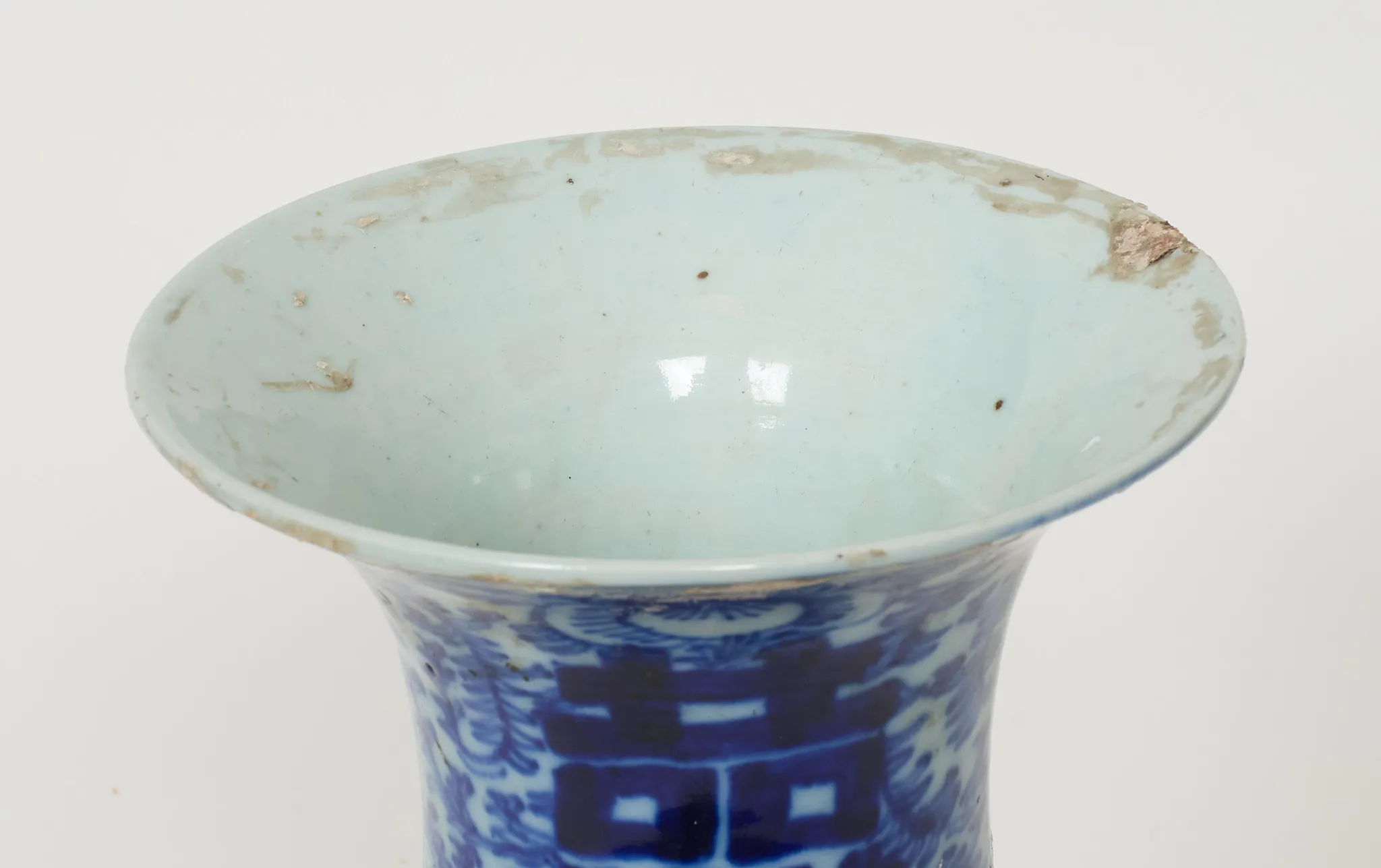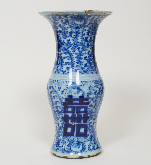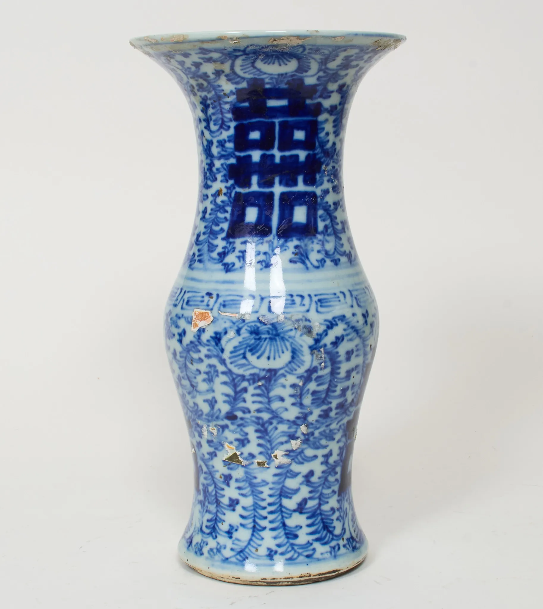 Dekor i underglasyrblått med lyckotecken mm, höjd 38 cm, skador