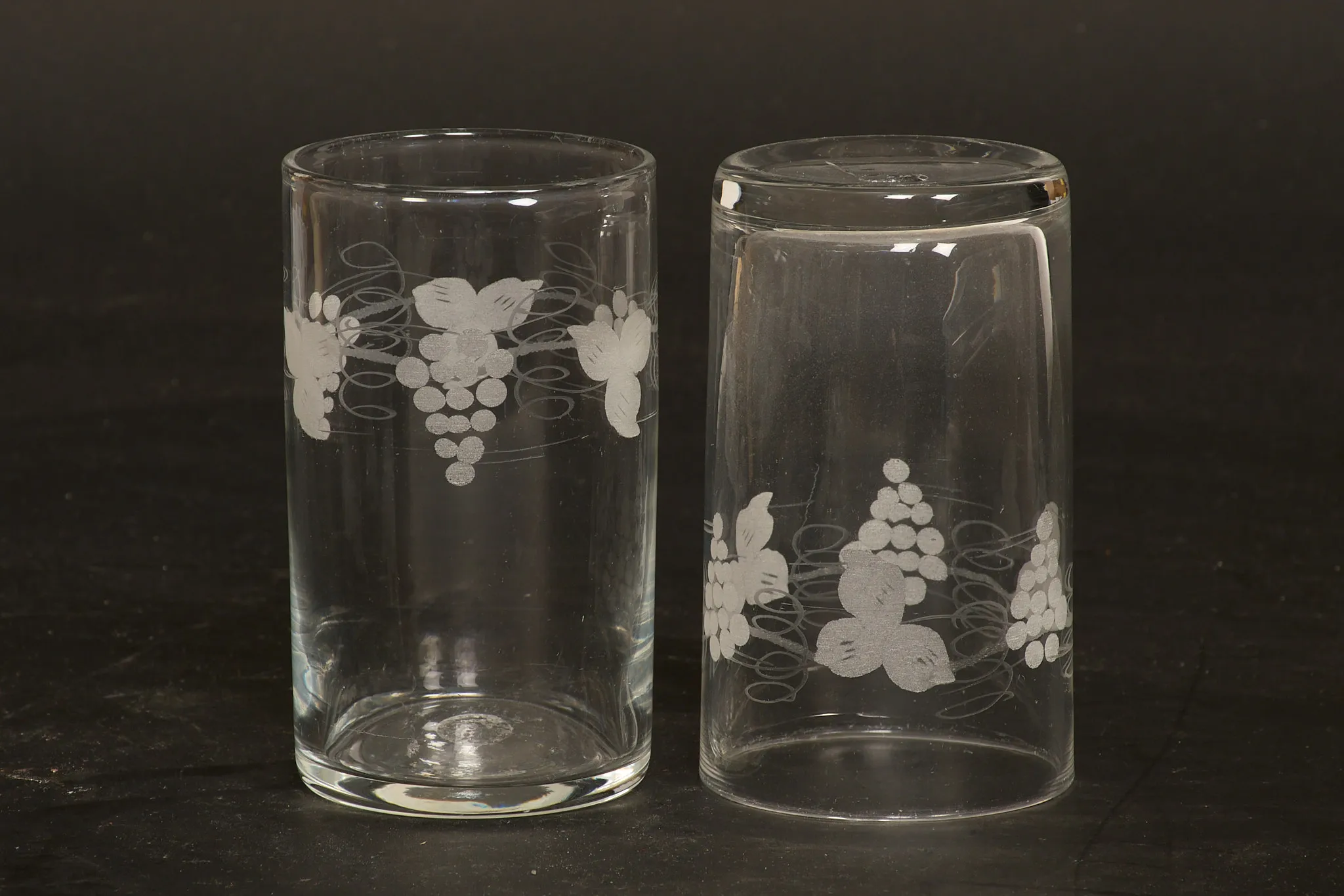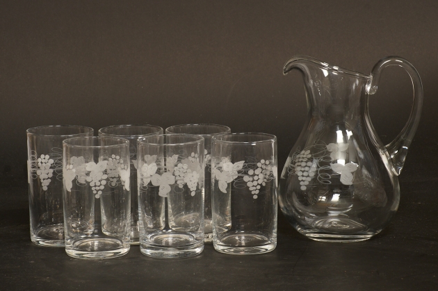 6 glas, höjd 11,5 cm, samt kanna, höjd 19 cm, dekor av vinranka, smärre bruksslitage, ett glas med fotnagg.
