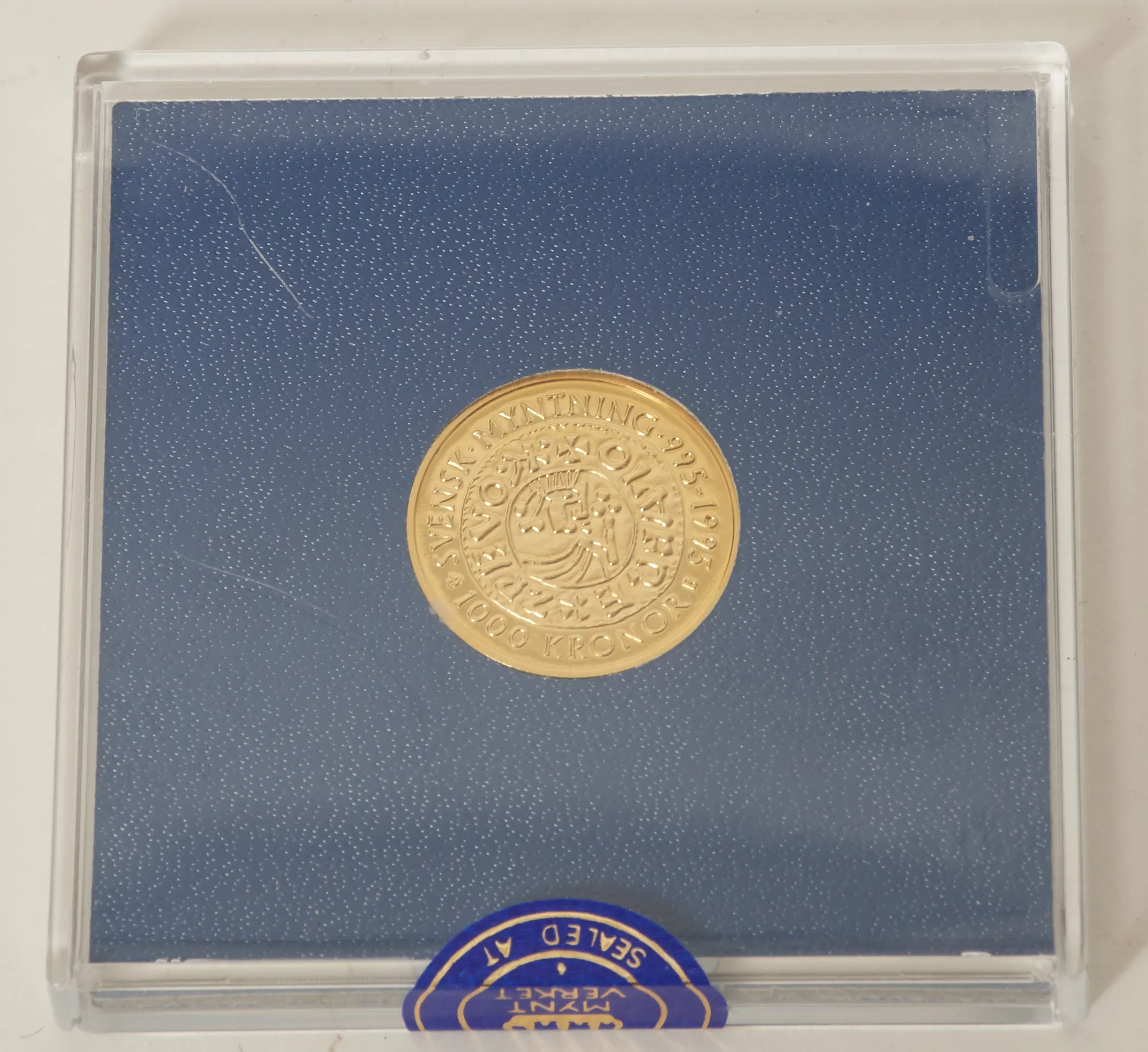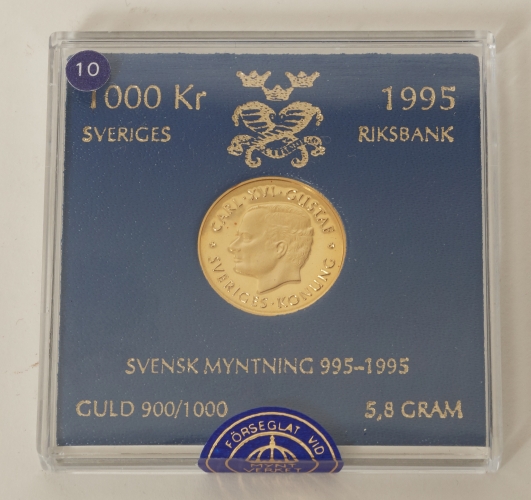 1000 kr 1995, svensk myntning 995 - 1995, vikt 5,8 gram. Detta objekt förvaras inte i auktionssalen, för visning kontakta kundtjänst