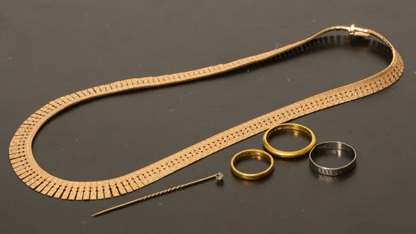 23-k 8,95 gram, 18-k 41,72 gram (nålen med liten sten), 14-k 1,92 gram. Detta objekt förvaras inte i auktionssalen, för visning kontakta kundtjänst
