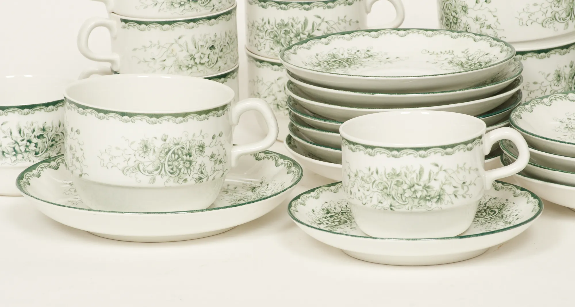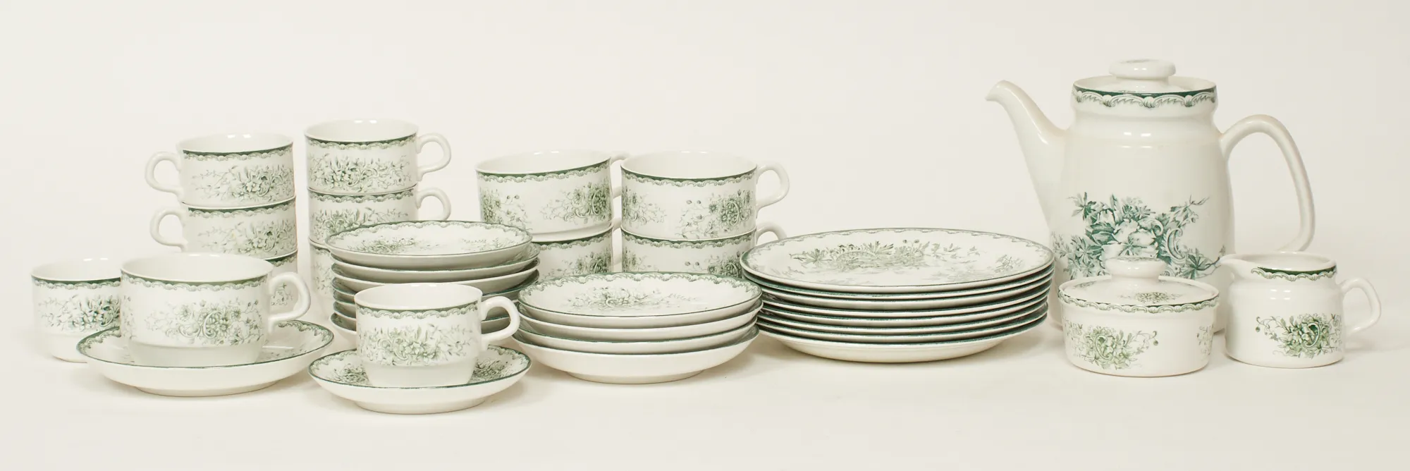 8 kaffekoppar med fat, samt assiett, 5 tekoppar med fat, sockerskål, gräddkanna, samt kaffekanna. Fint skick, (enstaka nagg kan förekomma).