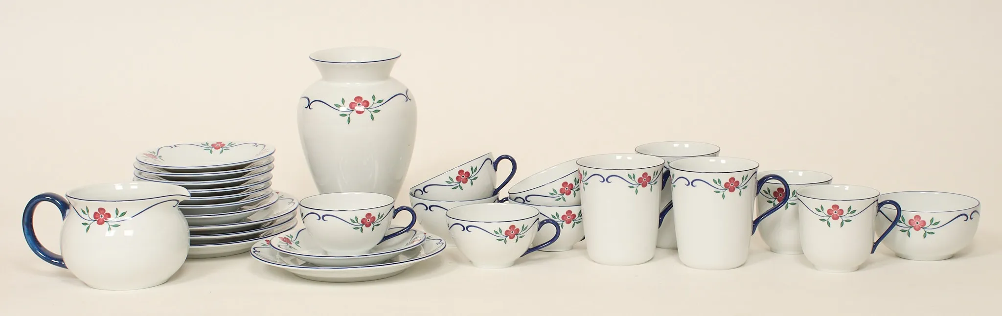 Rörstrand, 4 + 2 kaffekoppar med fat, 3 muggar, 4 assietter, vas, mjölkkanna, samt sockerskål, bruksslitage.