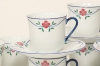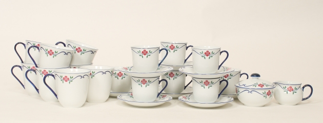 Rörstrand, 8 st kaffekoppar med fat, samt 8 st tekoppar, sockerskål, samt gräddkanna, enstaka fat med nagg, för övrigt fint skick.