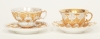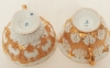 Kopp 1 med delvis guldpläterad bladdekoration, svärdmärke. Höjd kopp ca 7 cm, diameter fat 15 cm. Skador på fat samt litet nagg på fotring mugg.