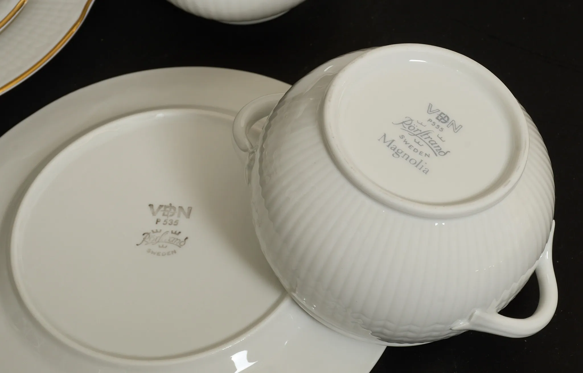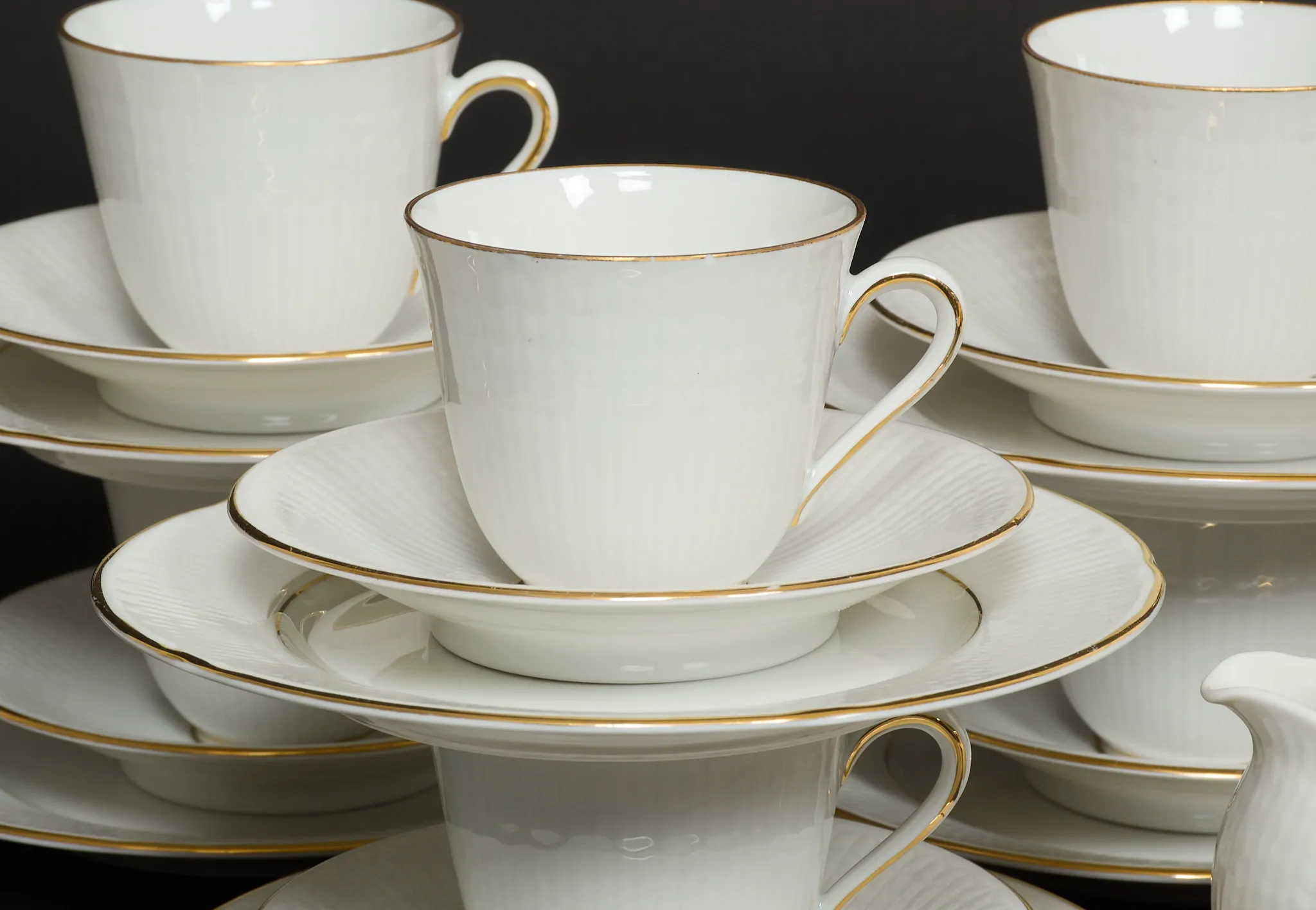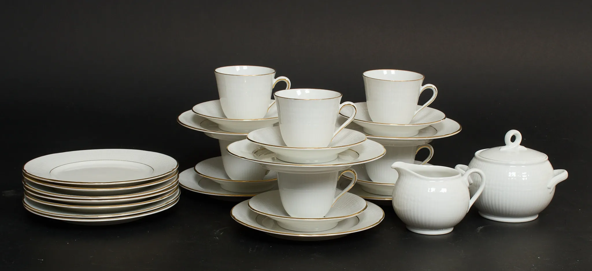 Rörstrand, 6 st koppar med fat (med nagg), samt assiett, avvikande modell på sockerskål samt gräddkanna, 7 st extraassietter medföljer