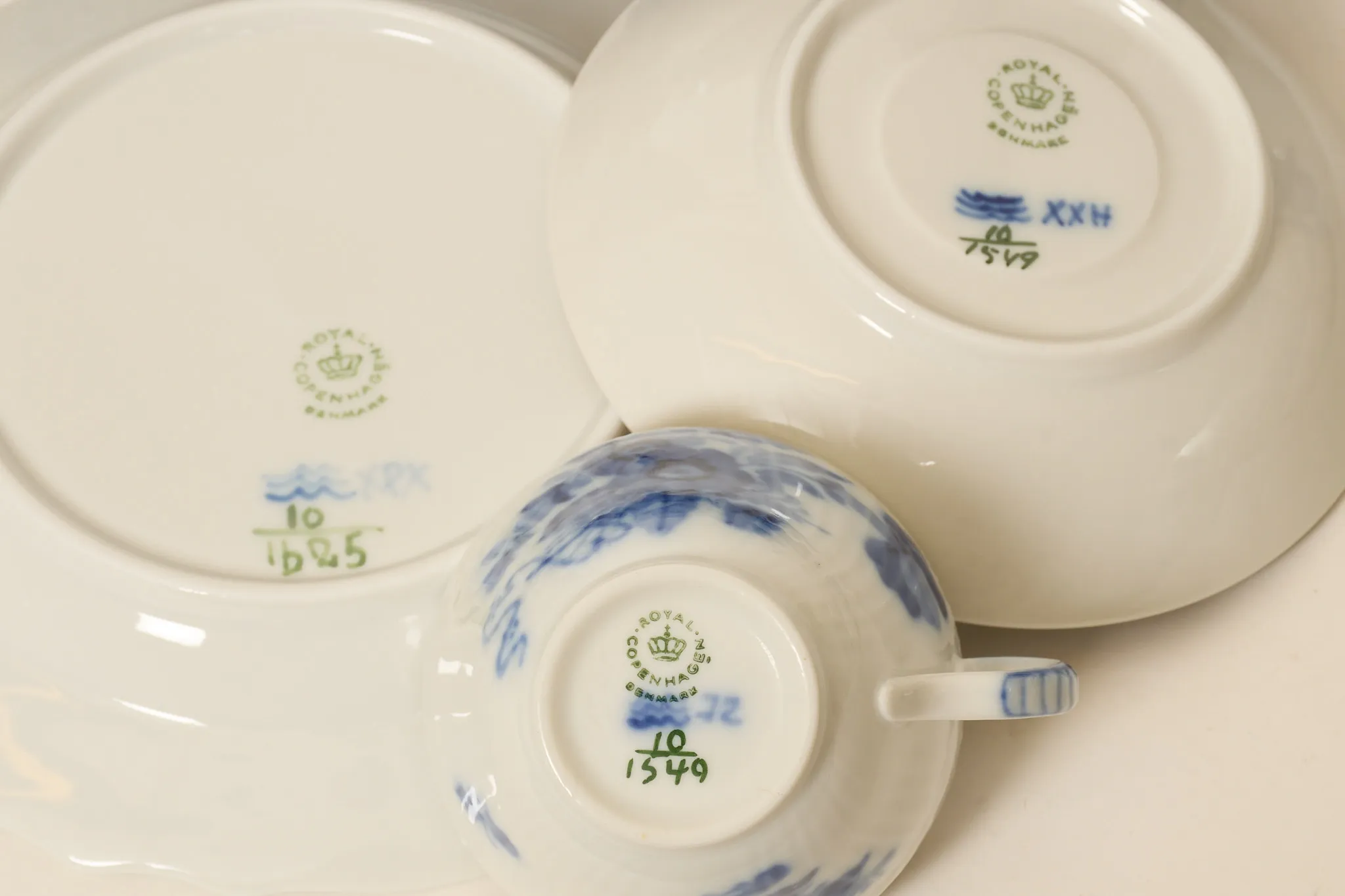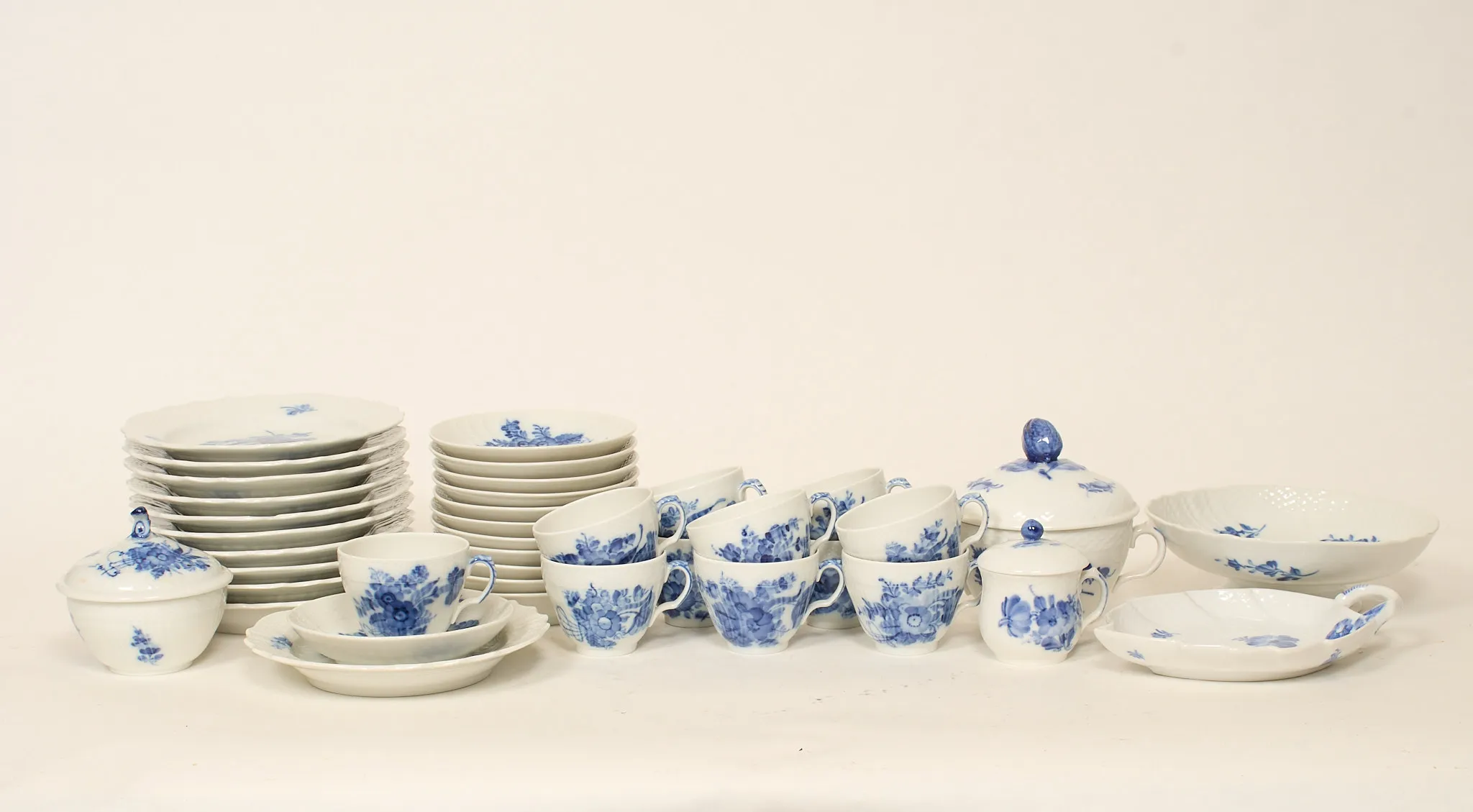 11 koppar med fat, samt assiett, sockerskål, kakfat m.m. Smärre bruksslitage.
