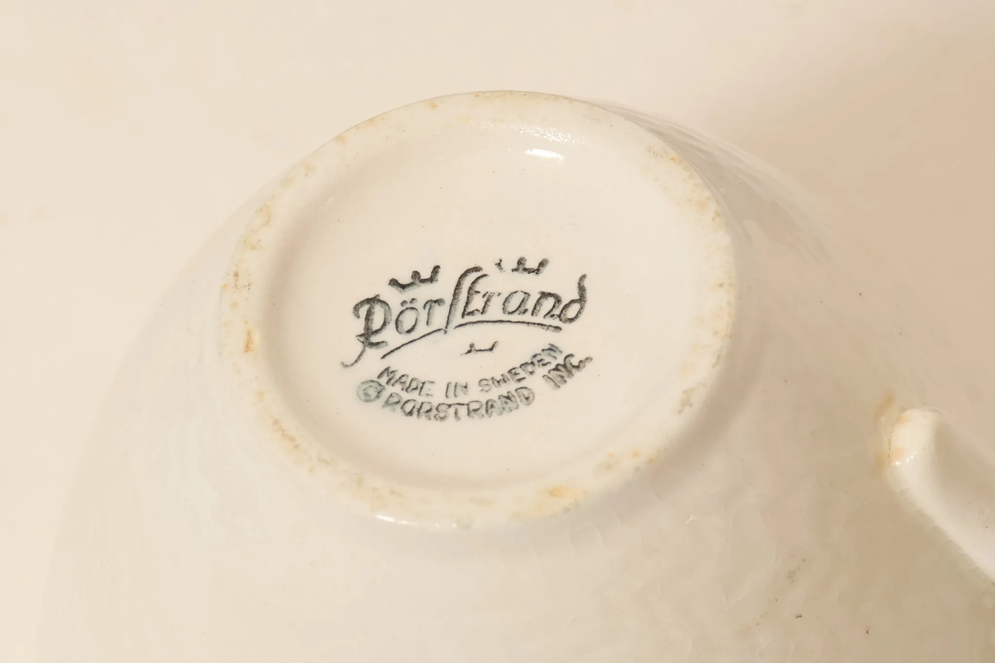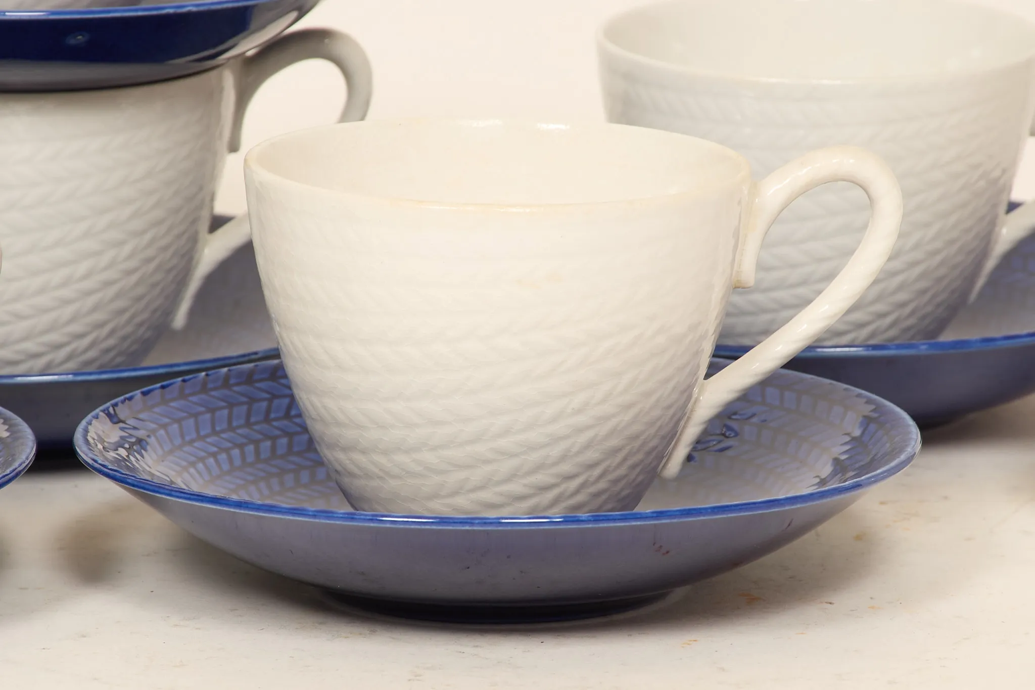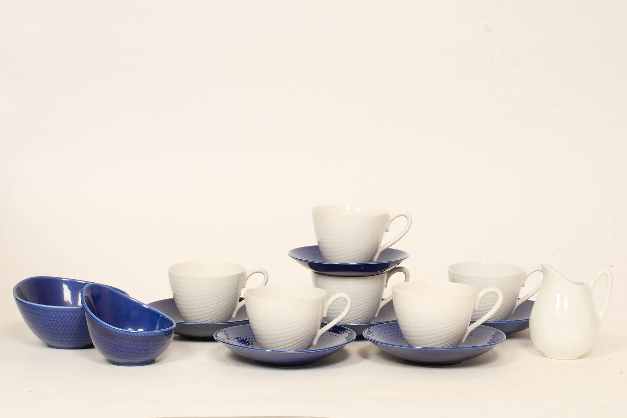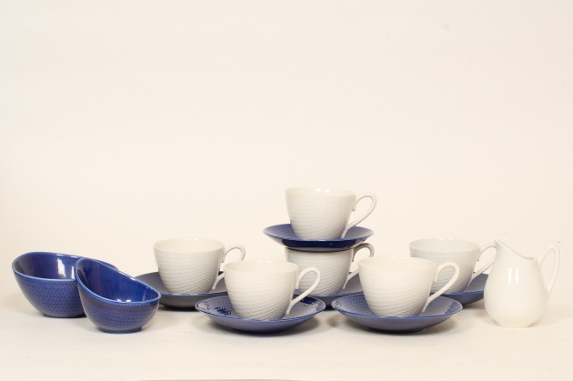 5 koppar med fat, en kopp med fat (avvikande storlek), mjölkkanna, samt 2 sockerskålar, bruksslitage, enstaka minimala nagg.