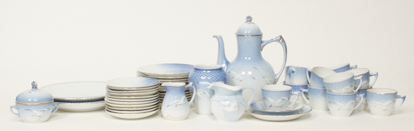 12 koppar med fat, samt assiett, kaffekanna, sockerskål, mjölkkanna, samt 2 uppläggningsfat. Smärre bruksslitage, men enstaka nagg kan förekomma.