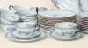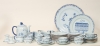12 koppar med fat, samt assiett, 4 tekoppar med fat, kaffekanna, gräddkanna, ett par ljusstakar, samt 2 större uppläggningsfat. Smärre bruksslitage, men enstaka nagg kan förekomma.