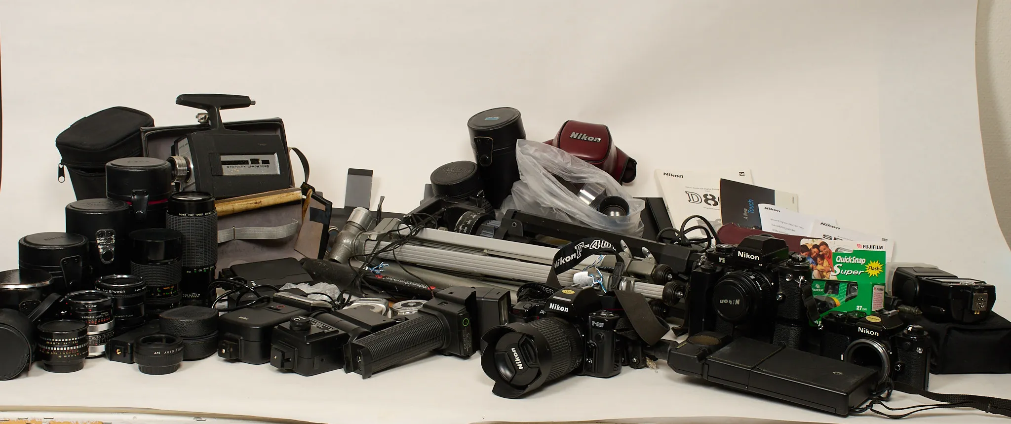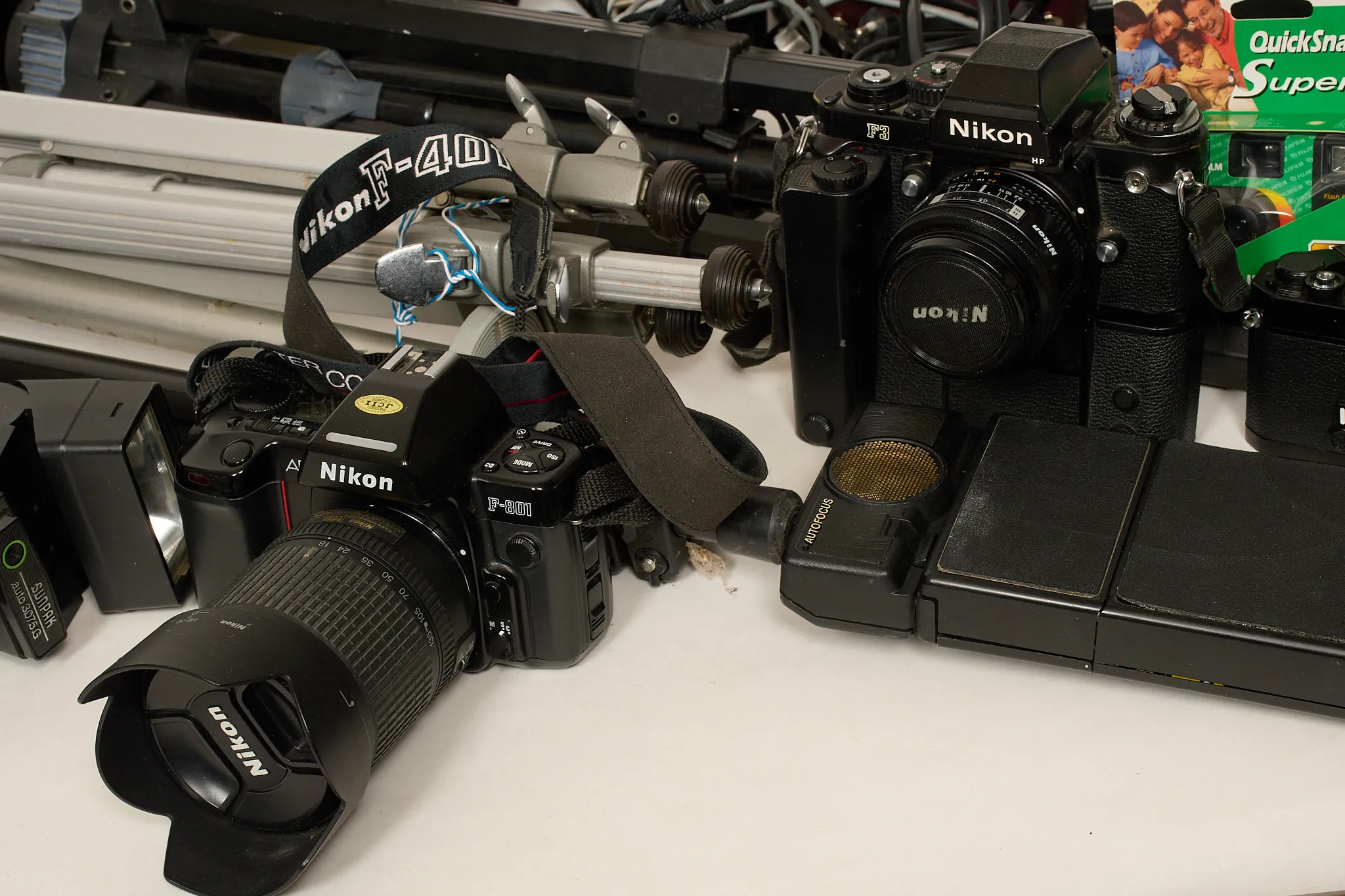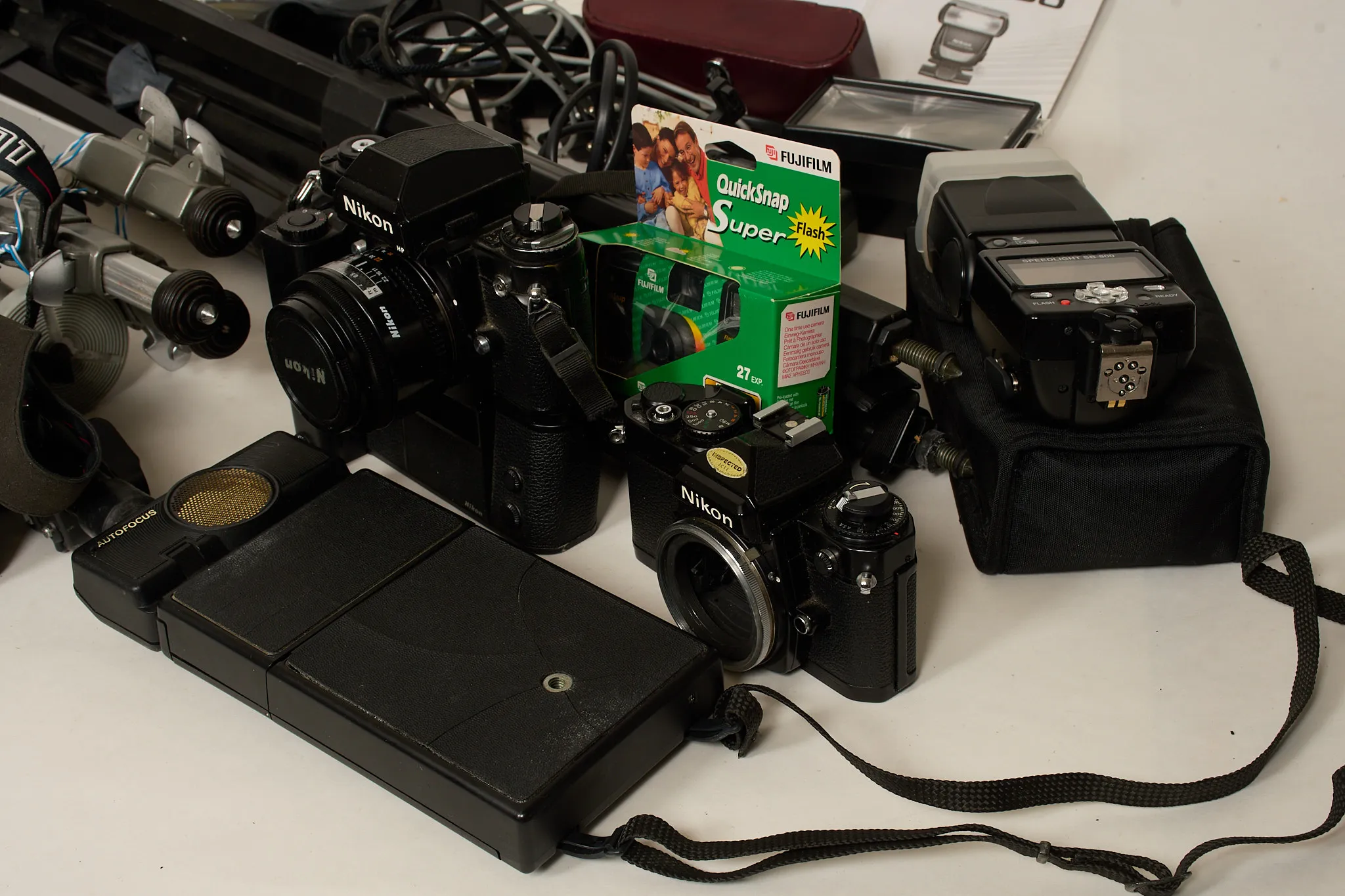 Nikon F3, motordrive HD-4. Objektiv nikkor 28 mm, Sigma zoom 35-70 mm. Autotube, autoteleplus, telepower. Objektiv Sigma zoom 80-200 mm.