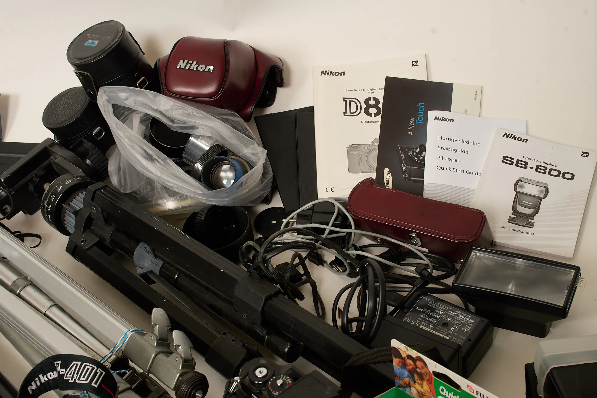 Nikon FE, Nikon AF F-801, objektiv DX 18-135 mm. Bell Howell super 8 polaroid, 3 stativ, filter mm