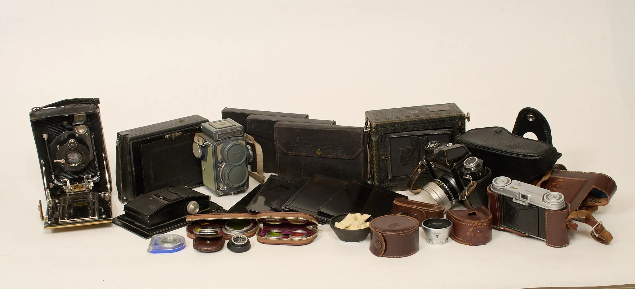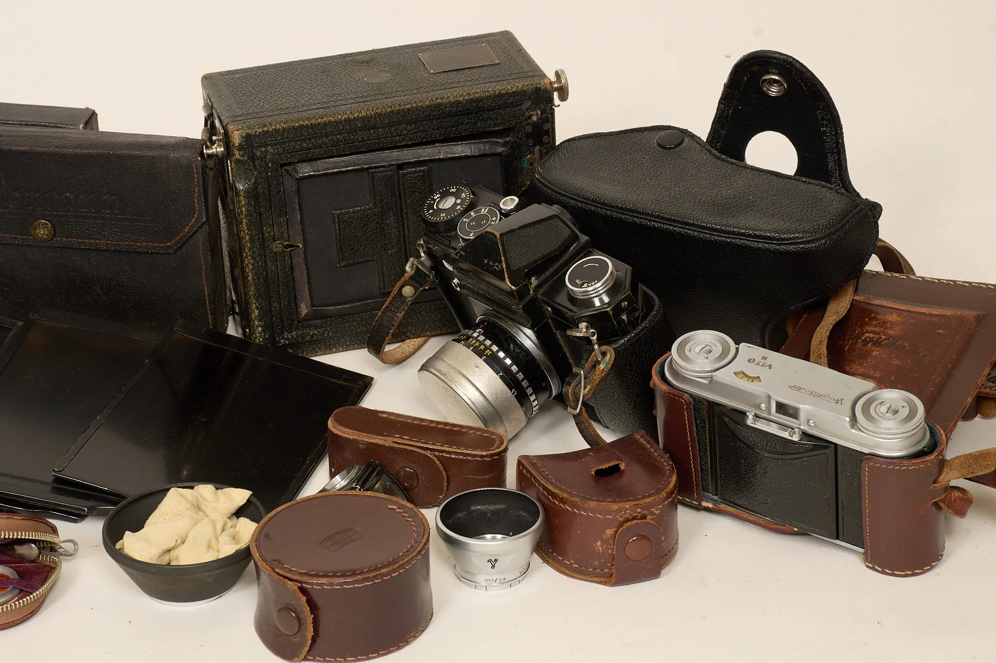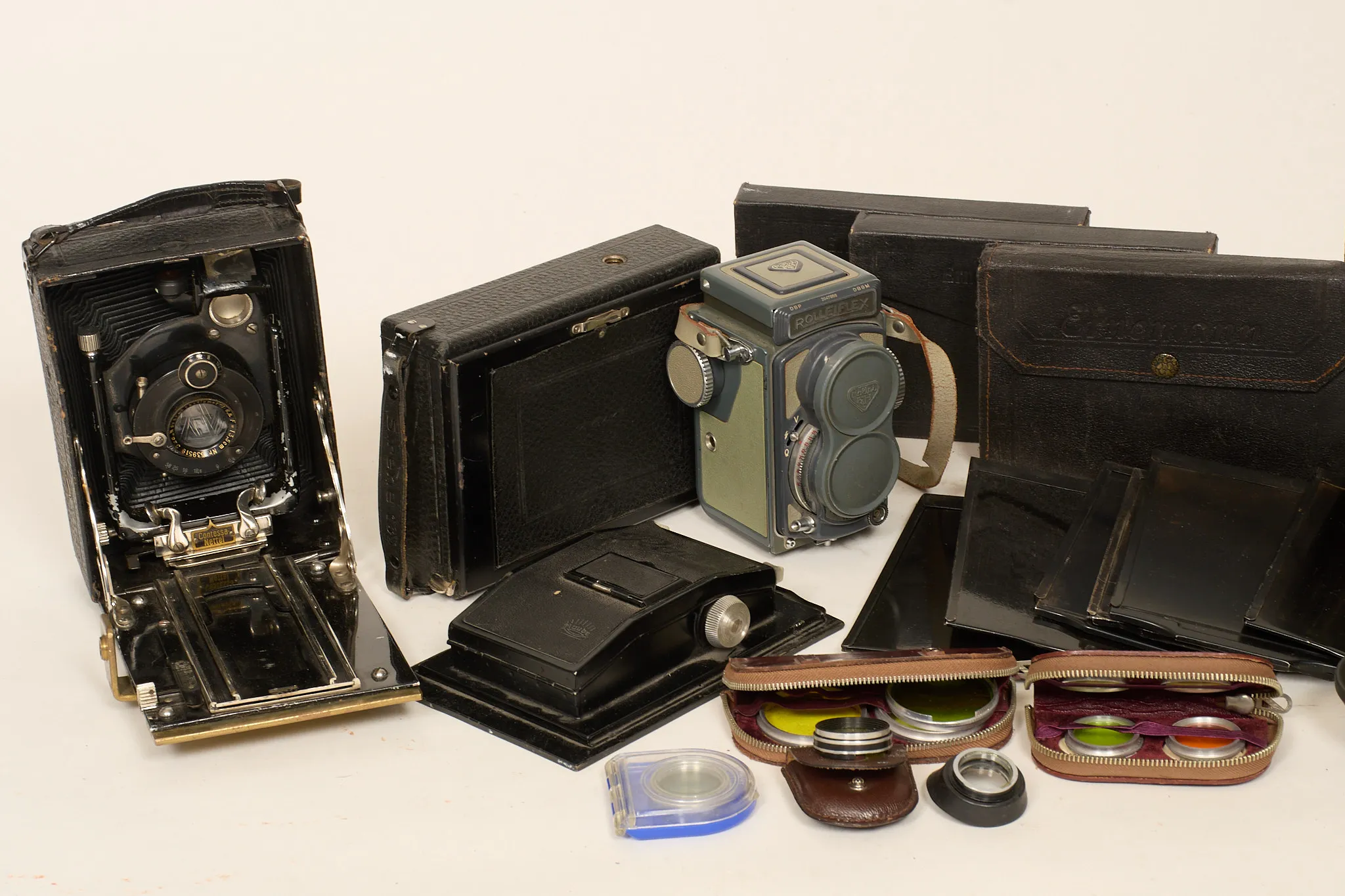 Rolliflex, Franke & Heidecke Voightländer vito II Edixa Prismat, 2 st Contessa Nettel bälgkameror, Ernemann Dresden bälgkamera, samt plåtar, filter m.m. Ej genomgånget eller funktionstestat.