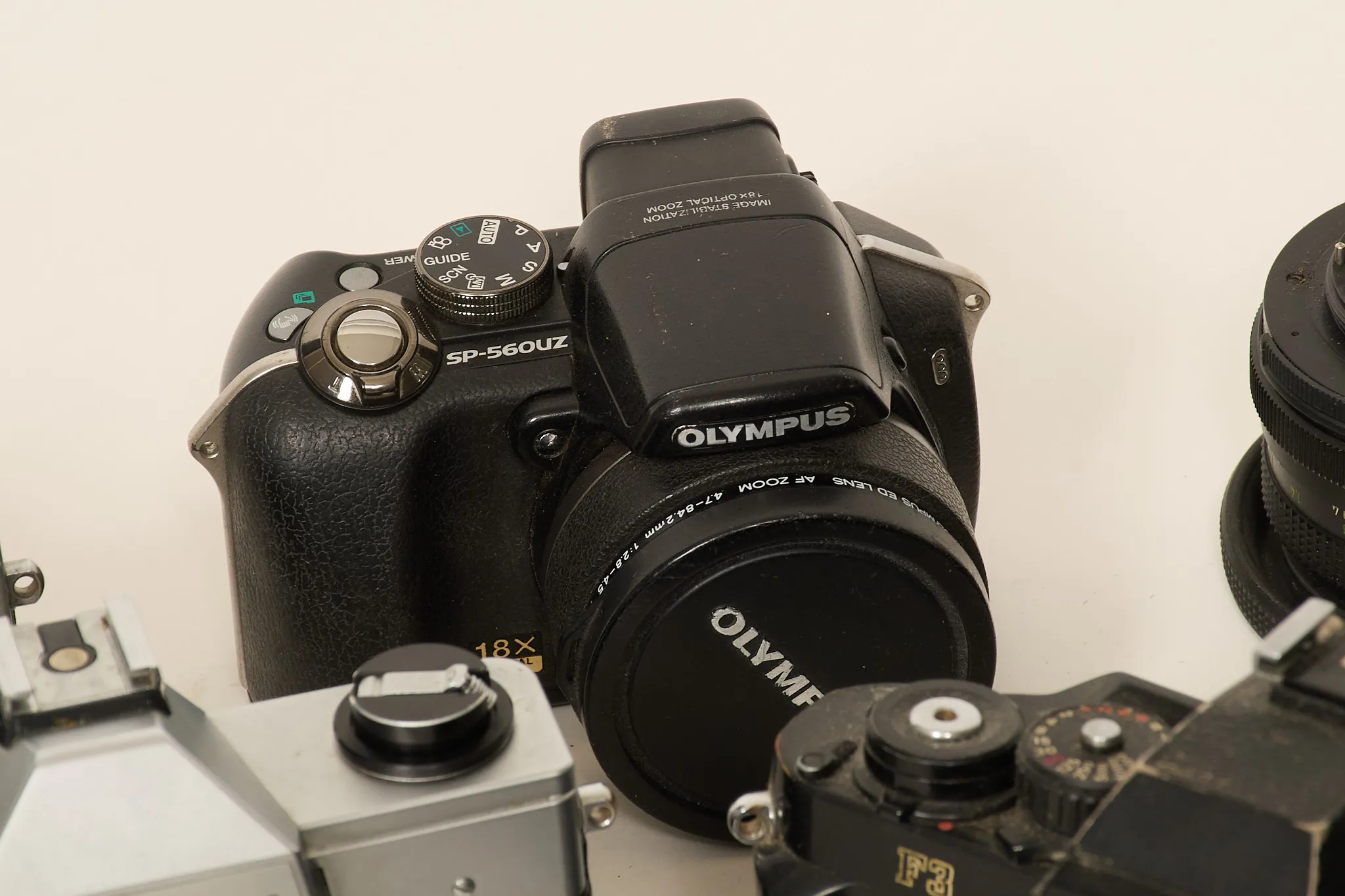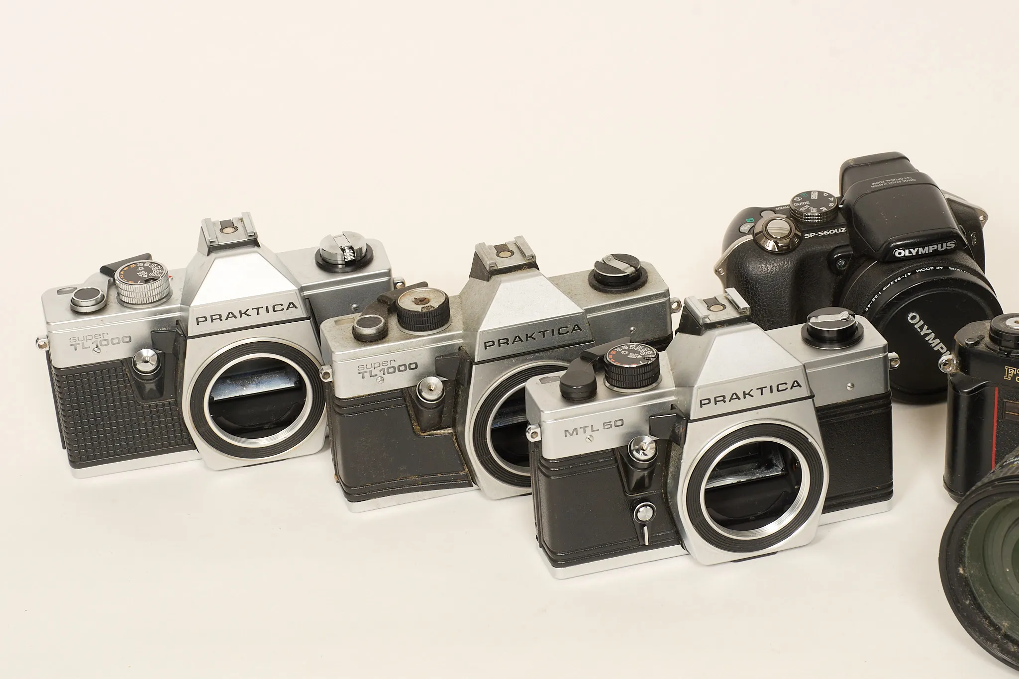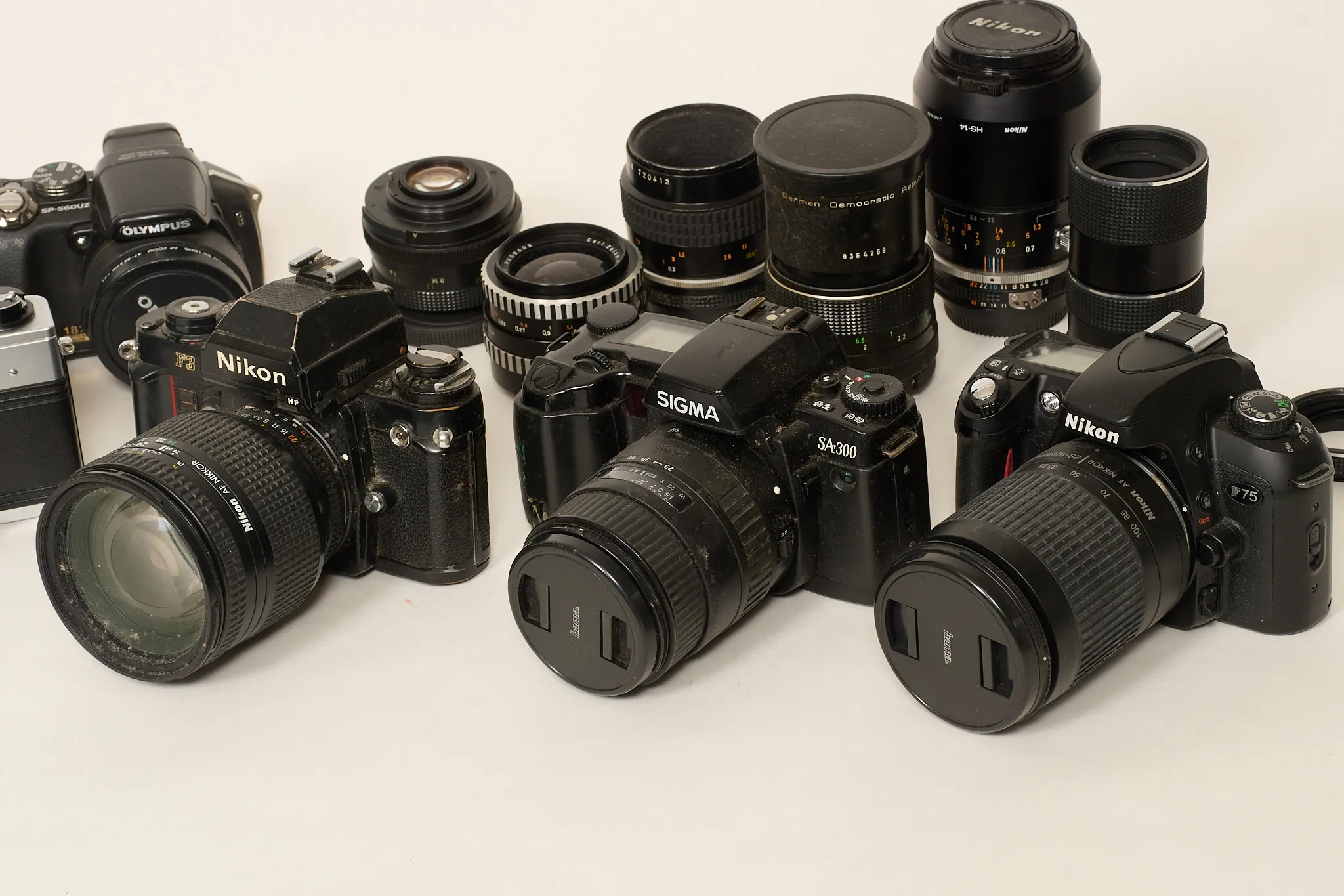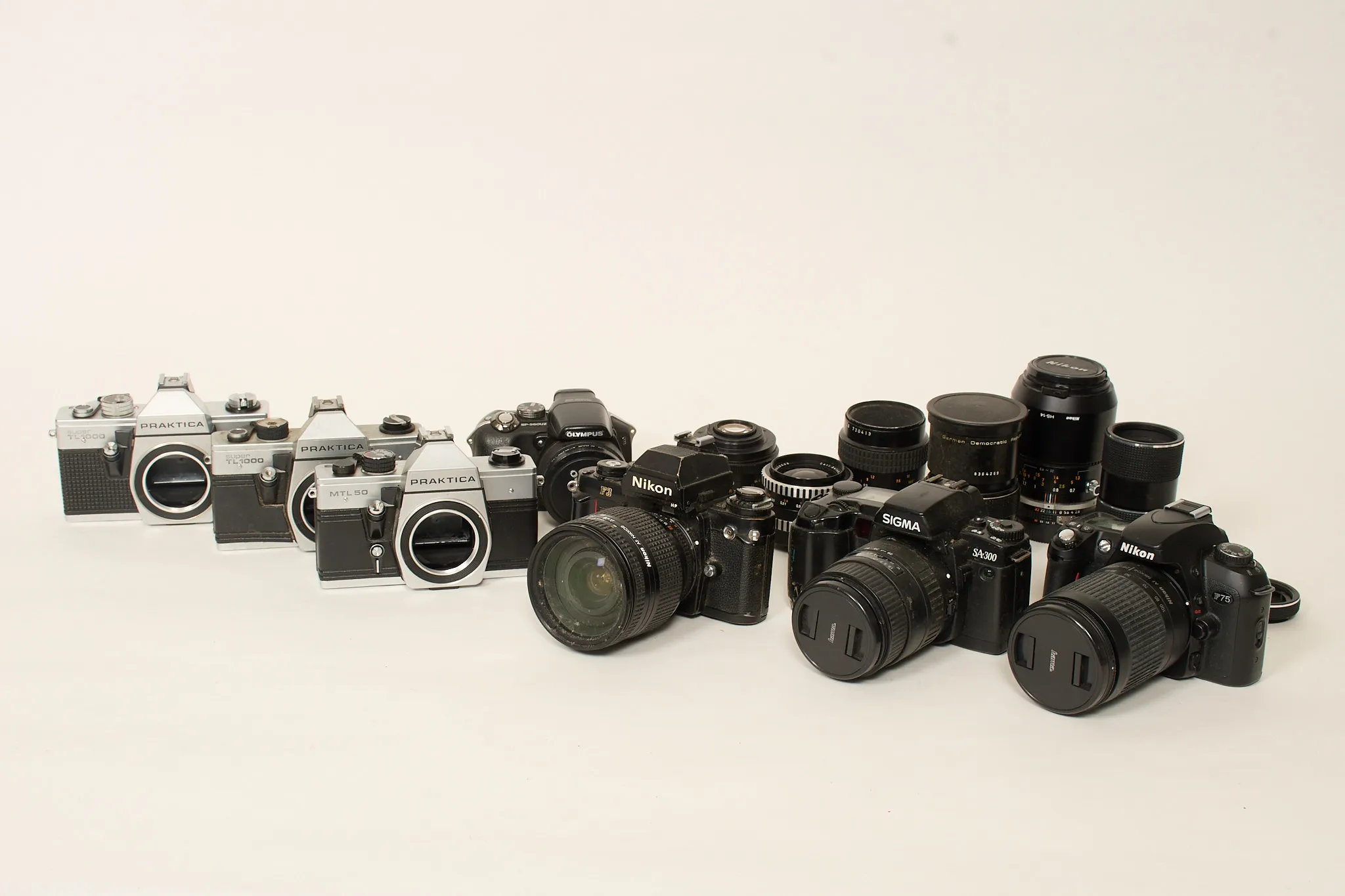 Nikon F3 objektiv 24-120 mm. Nikon F75 objektiv 28-100 mm, Olympus SP-56OUZ, Sigma SA-300 objektiv 28-105 mm, 2 st Praktica TL100, 1 st Praktica MTL 50, objektiv Nikon 55 mm, samt 105 mm, objektiv Carl Zeiss 35 mm, objektiv Pentacon 50 mm, samt 135 mm. Ej genomgånget eller funktionstestat.