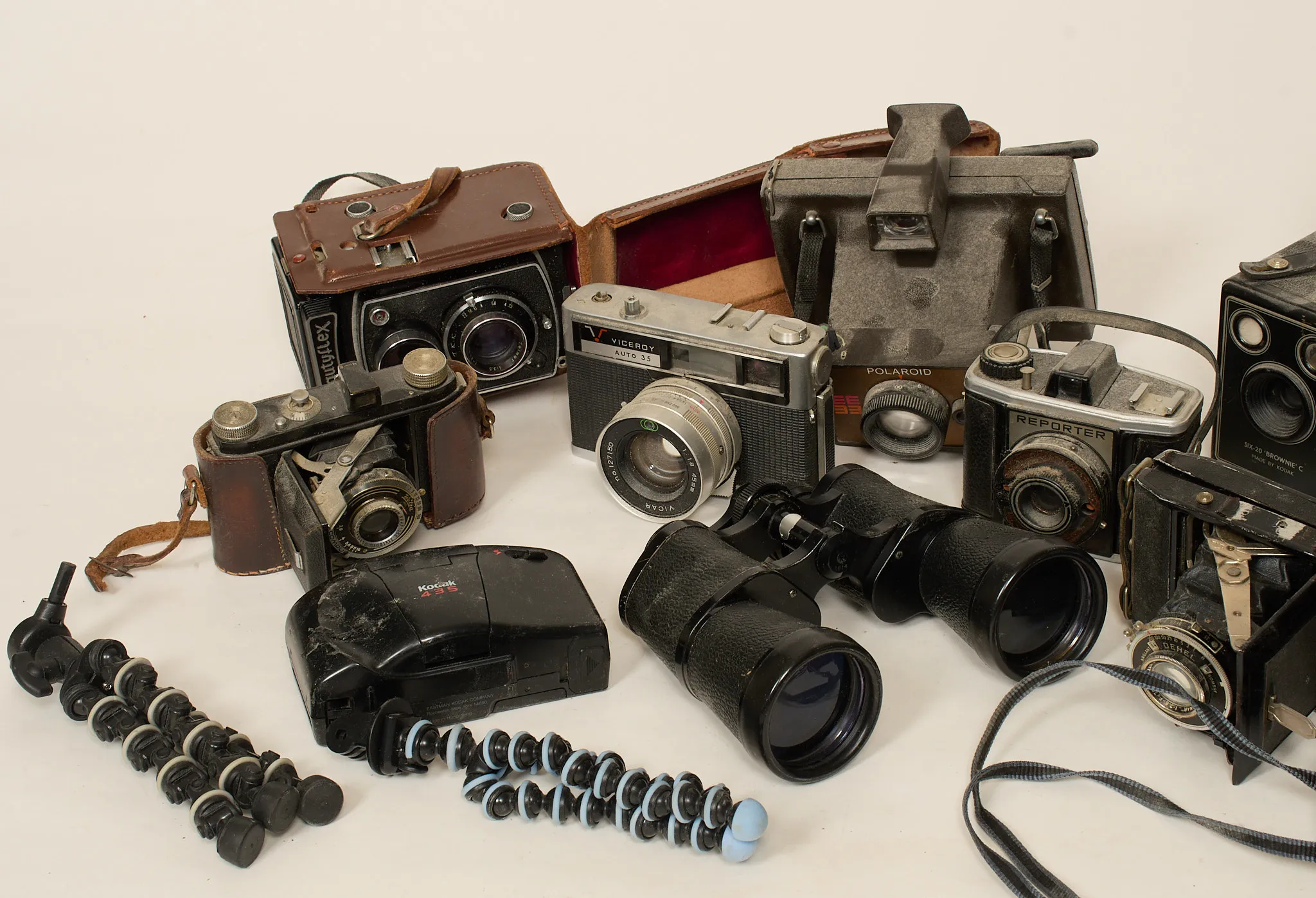 Canon AL-1, objektiv Canon FD 135 Canon Power Winder A, Beautyflex, 3 st lådkameror, Welta compur, Dehel, Reporter, Canon A560, Kodak 435, Minolta FS-E, Polaroid, Viceroy, objektiv Soligor 28-35 mm, Kikare Bristol 7x50.