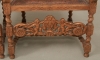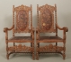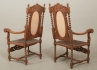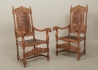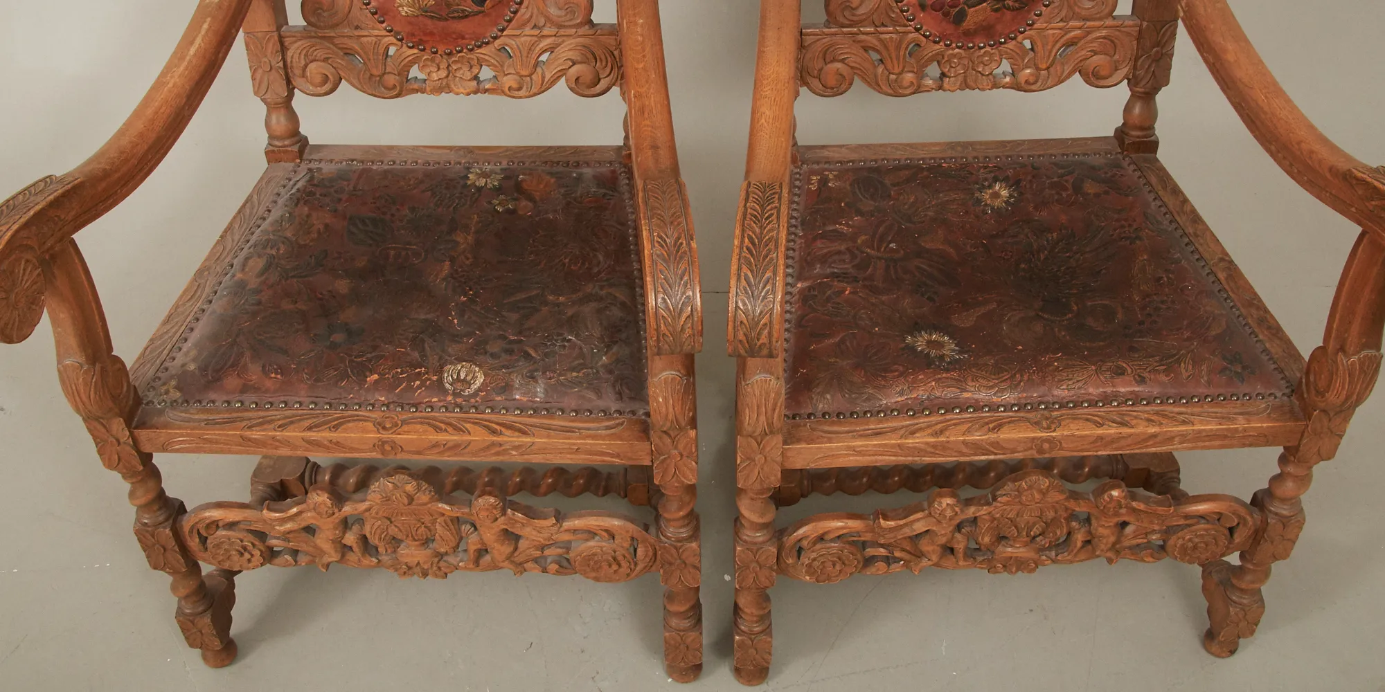Ett par, 1900-talets första hälft, stomme i ek, sitsar och rygg klädda i gyllenläder, stomme i ek med skuren dekor, bruksslitage.