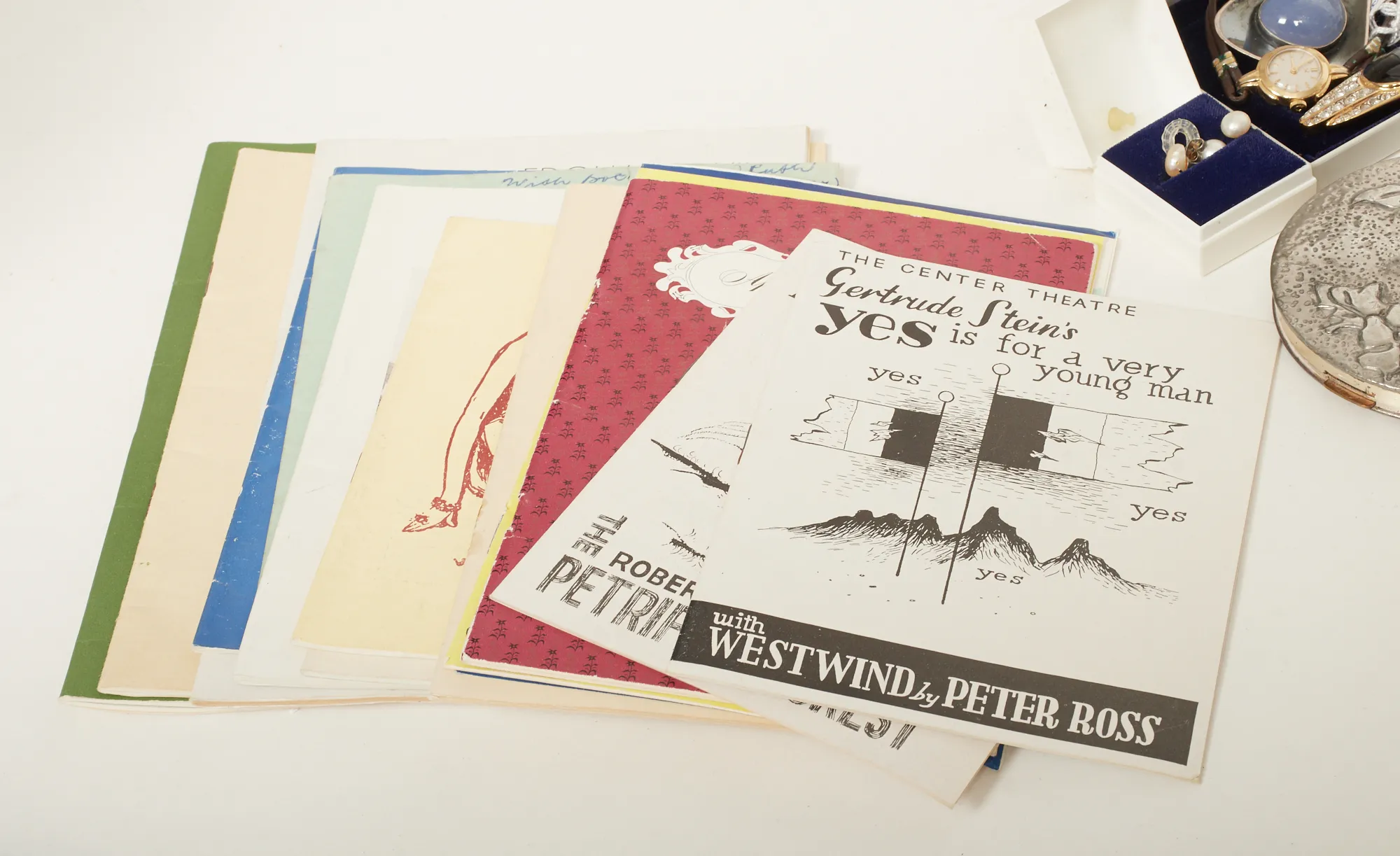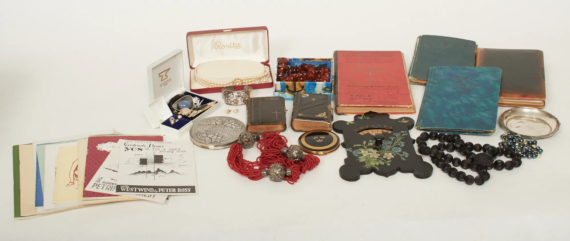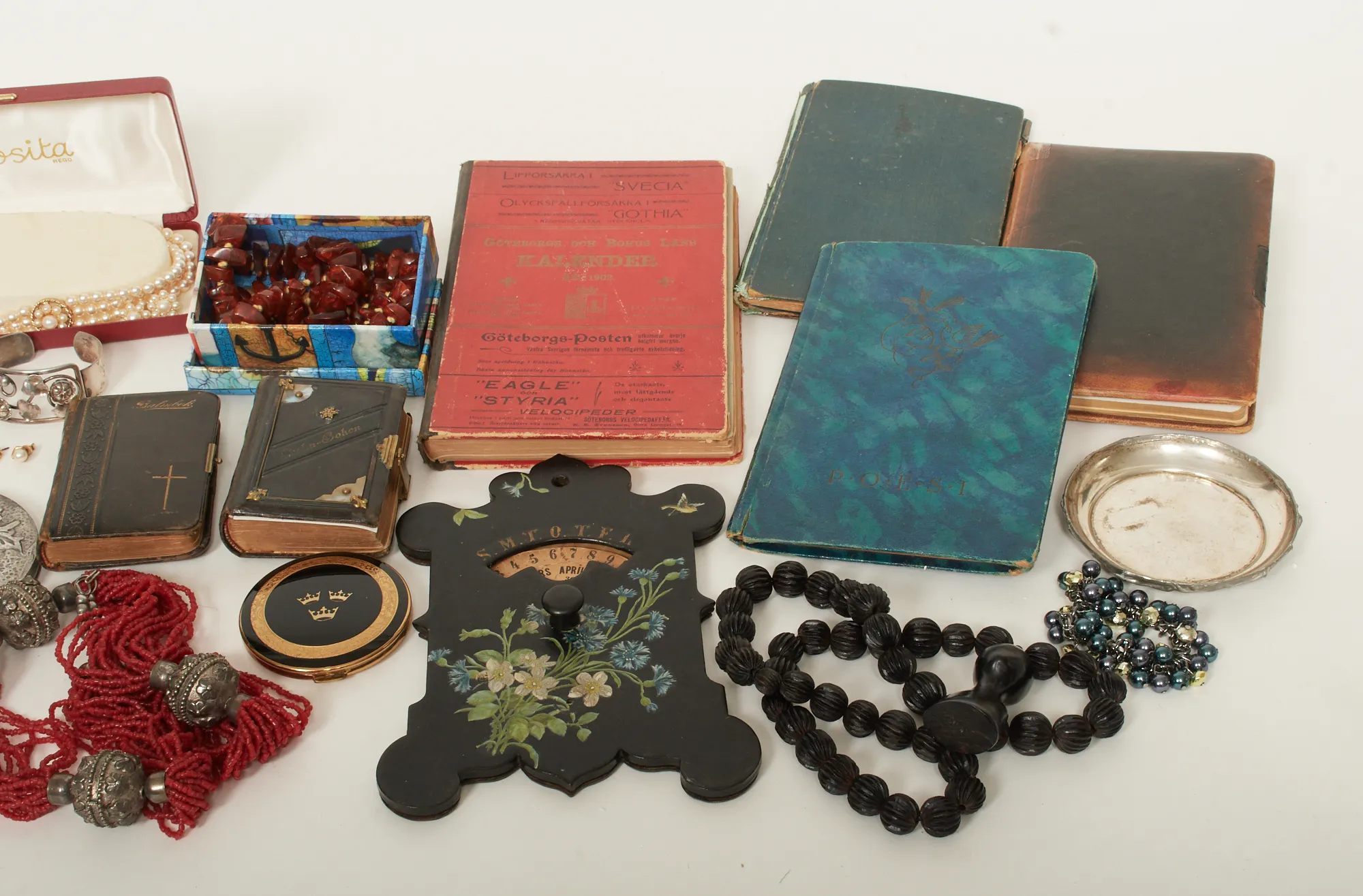 Äldre teaterprogram, väggalmanacka, bärnstenshalsband m.m. Ej fullständigt genomgånget.