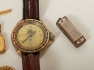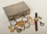 3 st fickur bl.a. Omega, i st mormorsur, en rysk klocka automat (fungerar), några medaljer m.m. i tennask. Slitage samt skador.