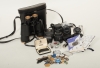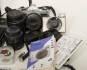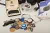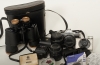 Kamera Pentax MX, objektiv Takumar 135 mm, panagor mellanringen, klockor, kikare, cigg.tändare Ronson, consul m.m. Slitage.