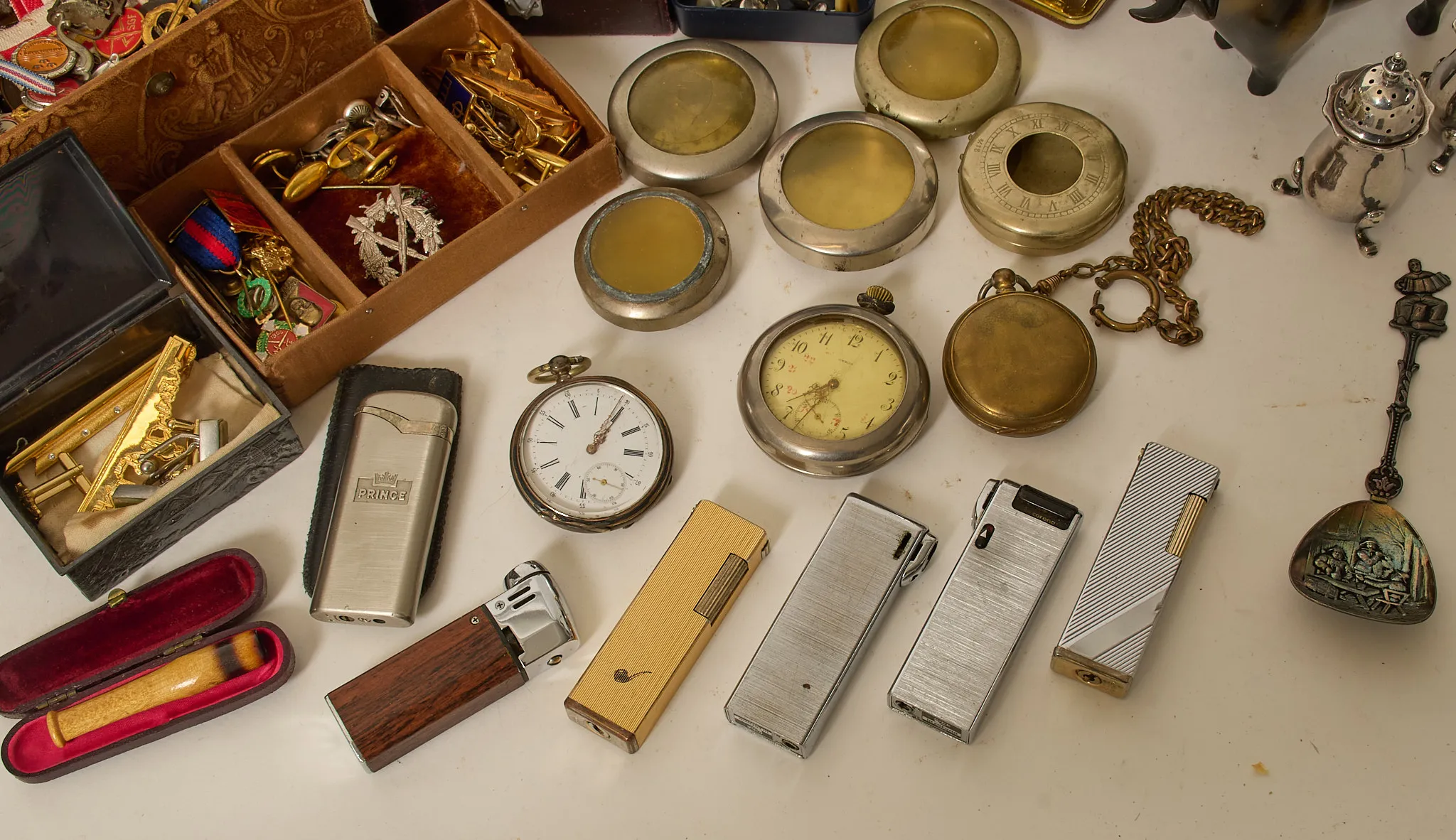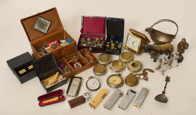 Fickur, bl.a. Omega, reseur, tändare, bl.a. Ratos, salt- och pepparkar, nålmärken, slipsnålar, manschettknappar m.m.