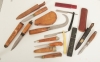 6 st, diverse i masurbjörk, m.m. längsta längd 25 cm. 2 rakknivar Heljestrand Söderén. Slitage, skador.