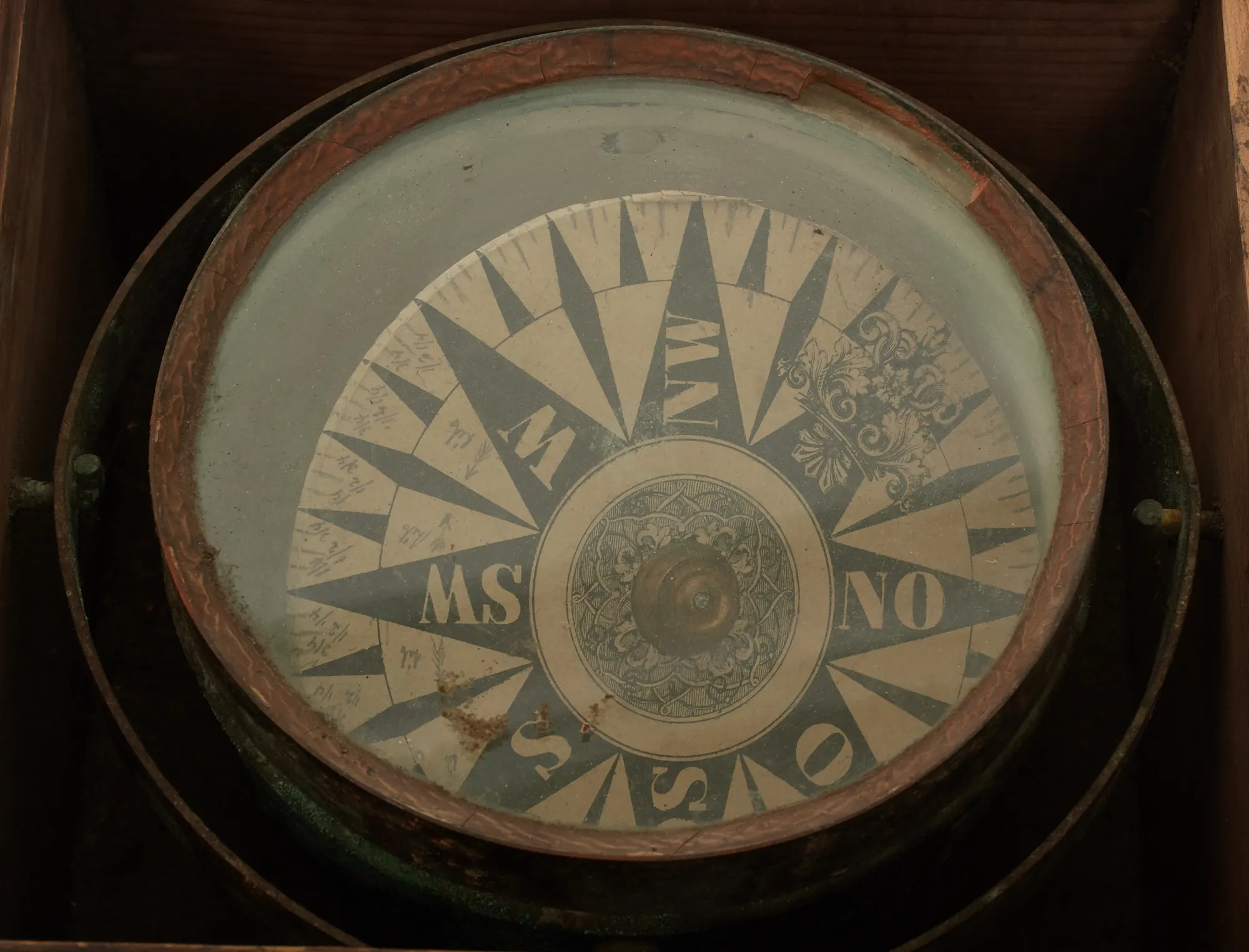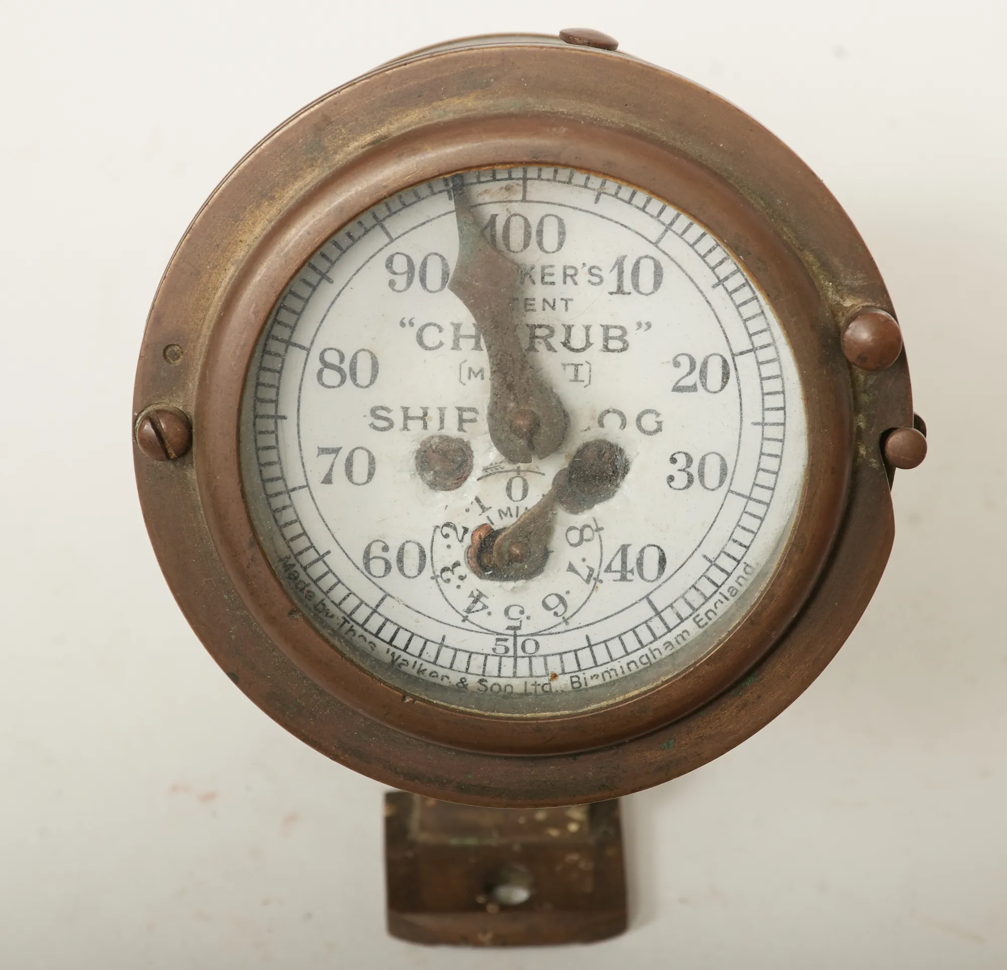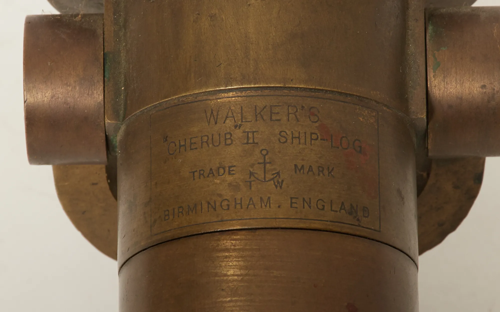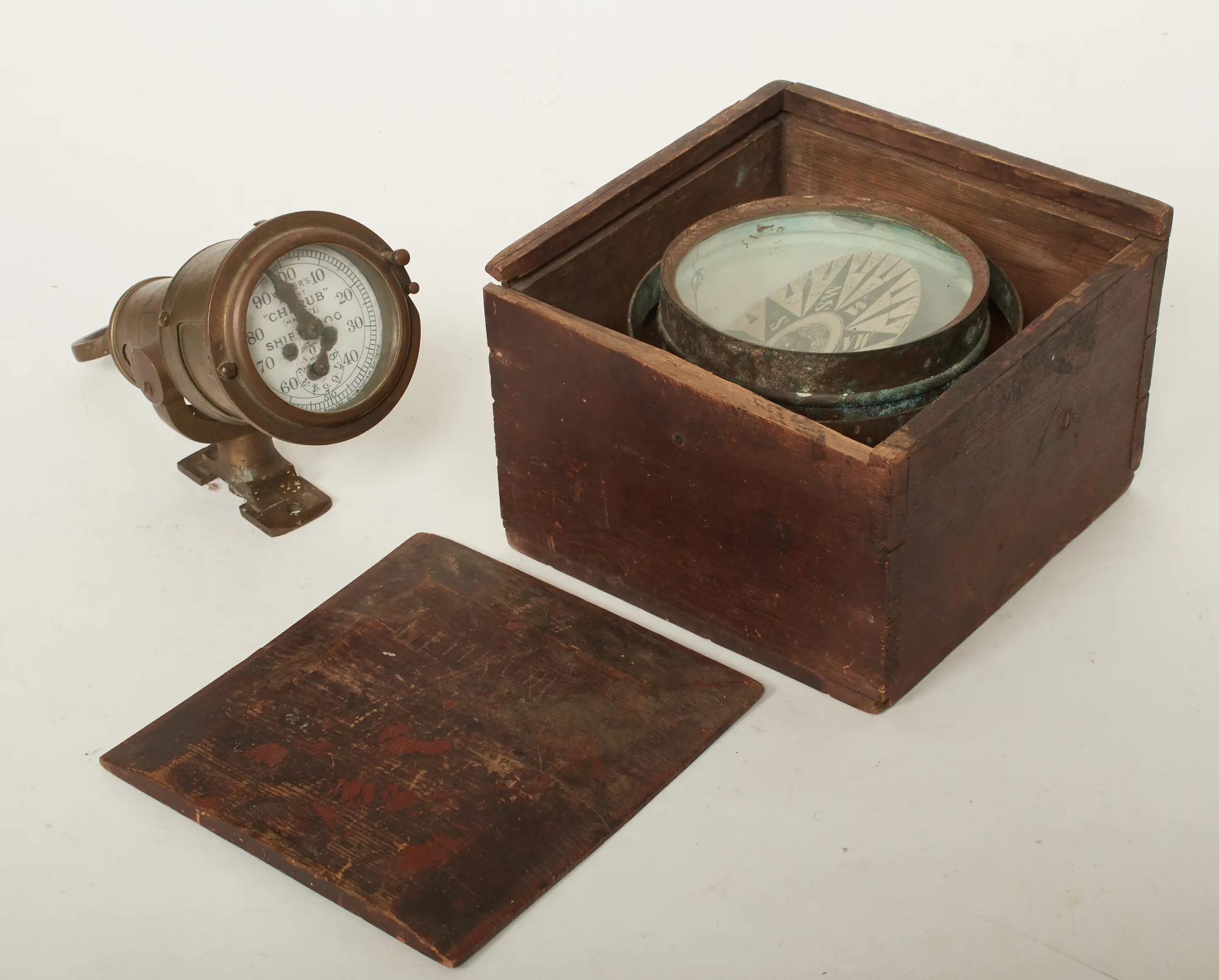 Kompass defekt i trälåda, samt släplogg Cherub, mässing. Bruksslitage/slitage.
