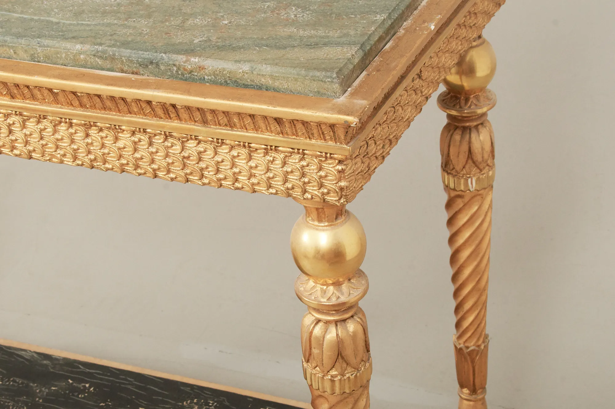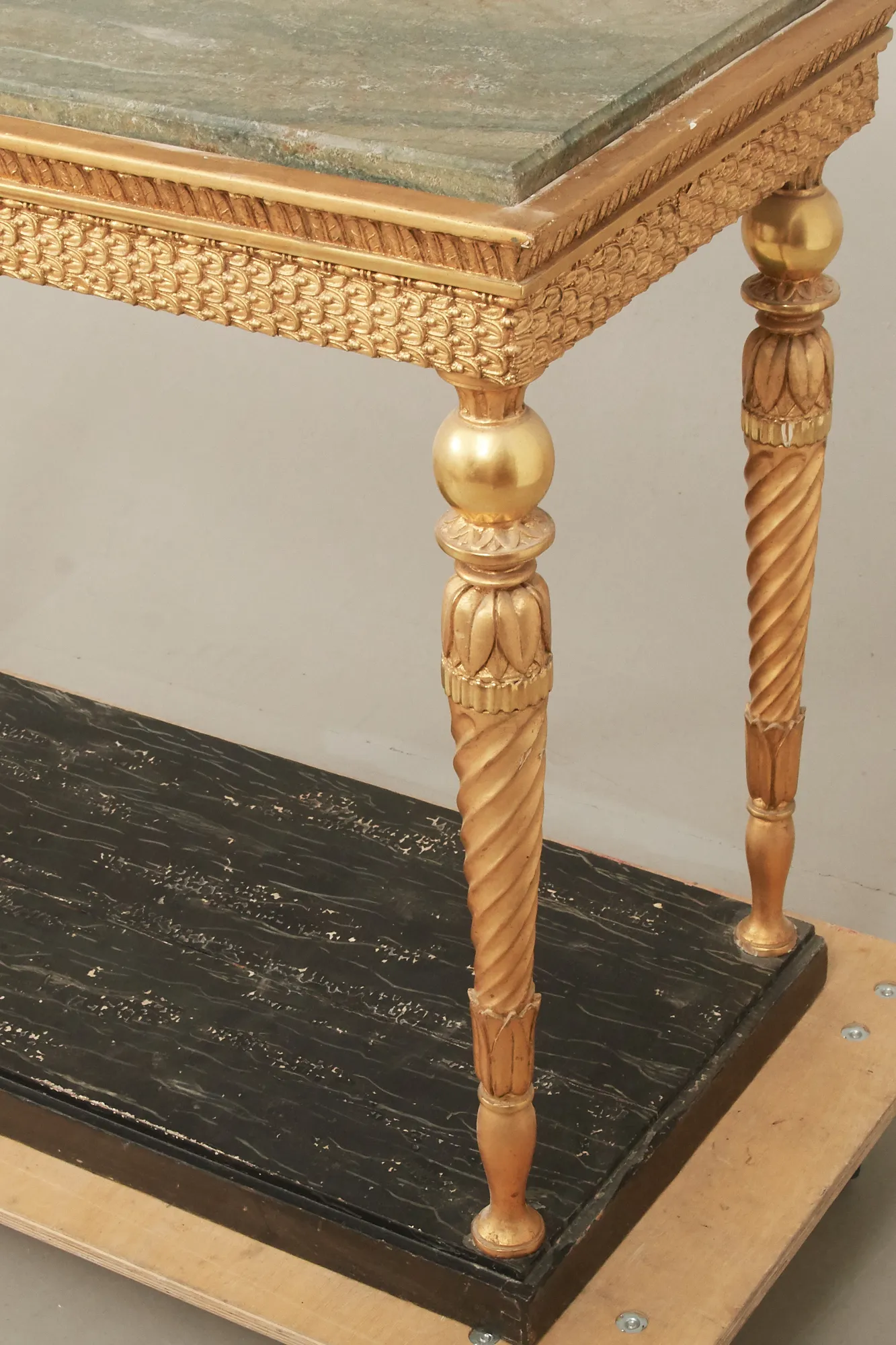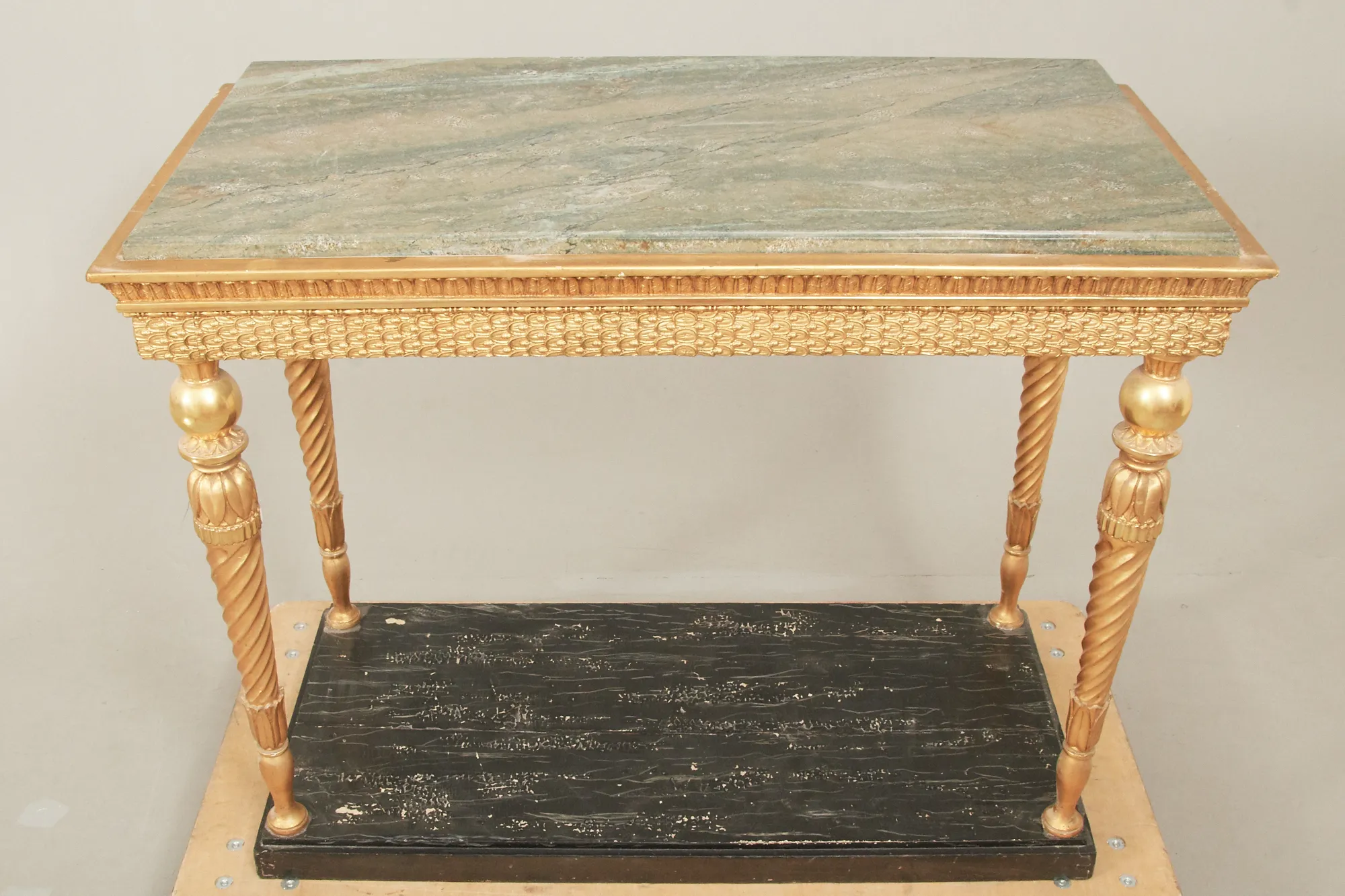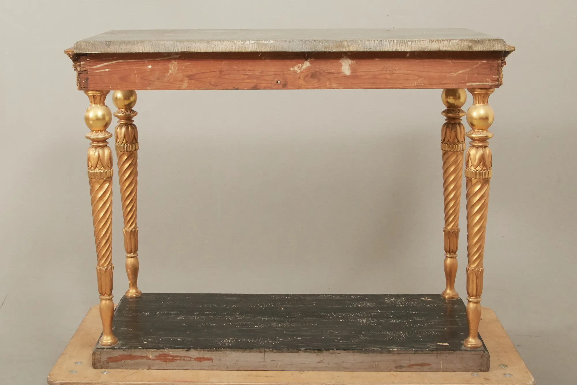 1800-talets början, underrede i senare förgyllt trä, marmorskiva, 106 x 53 cm, höjd 83 cm. Åldersrelaterat bruksslitage.