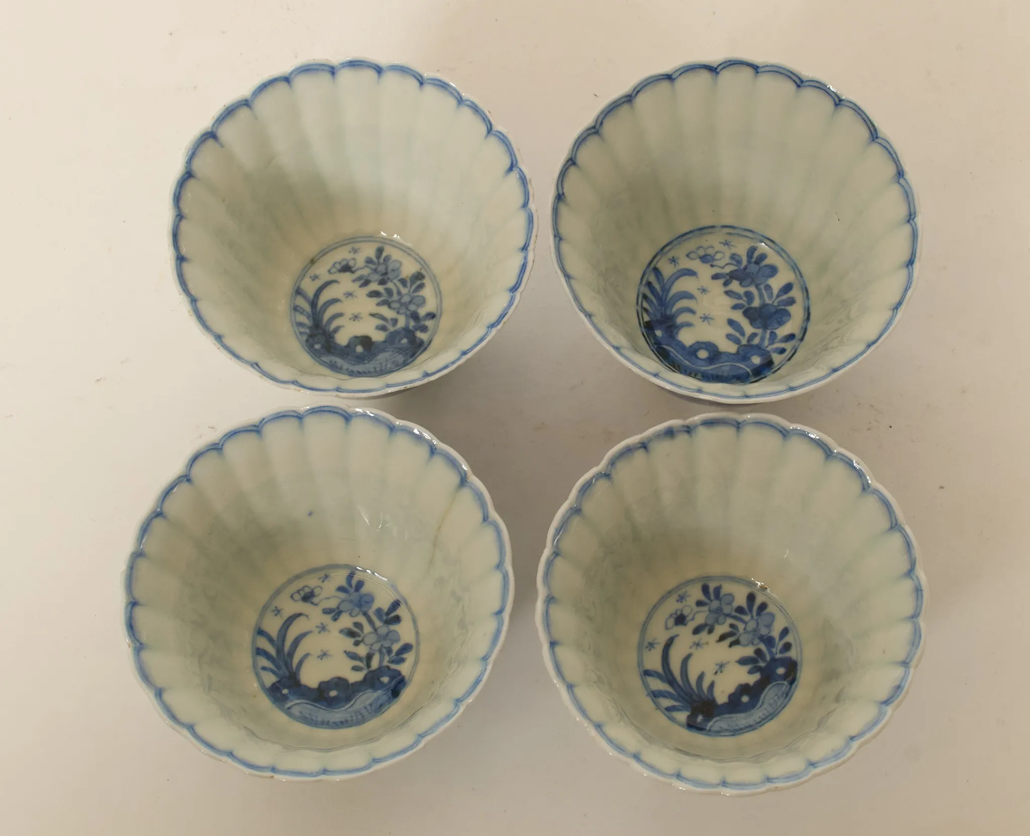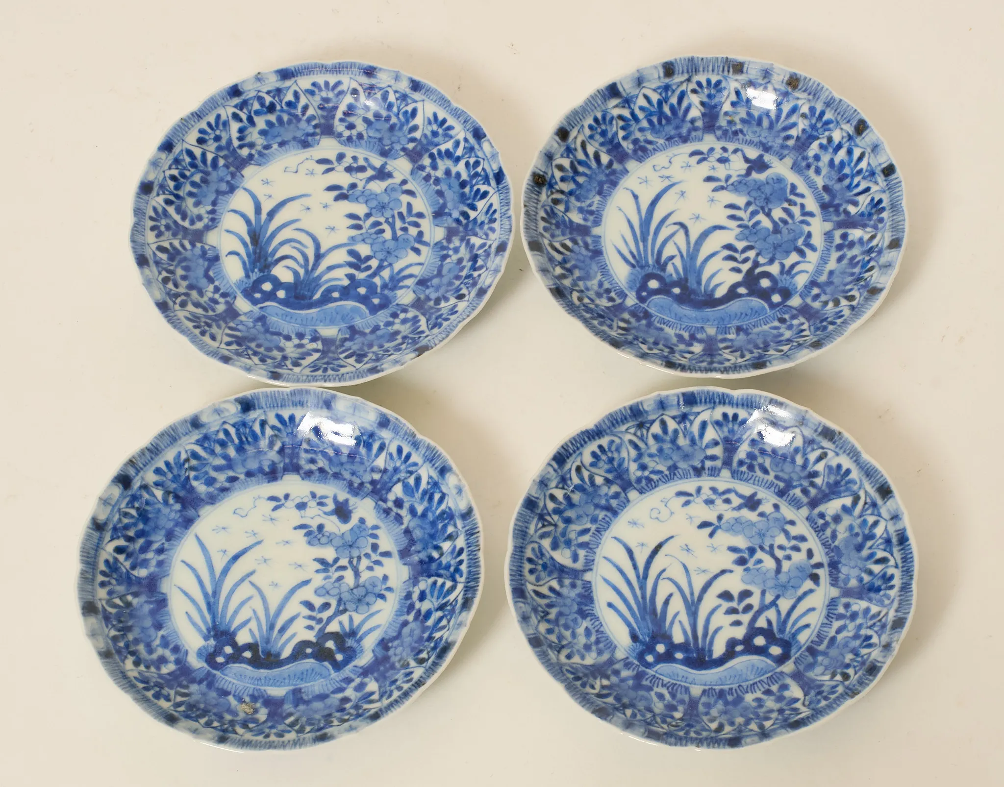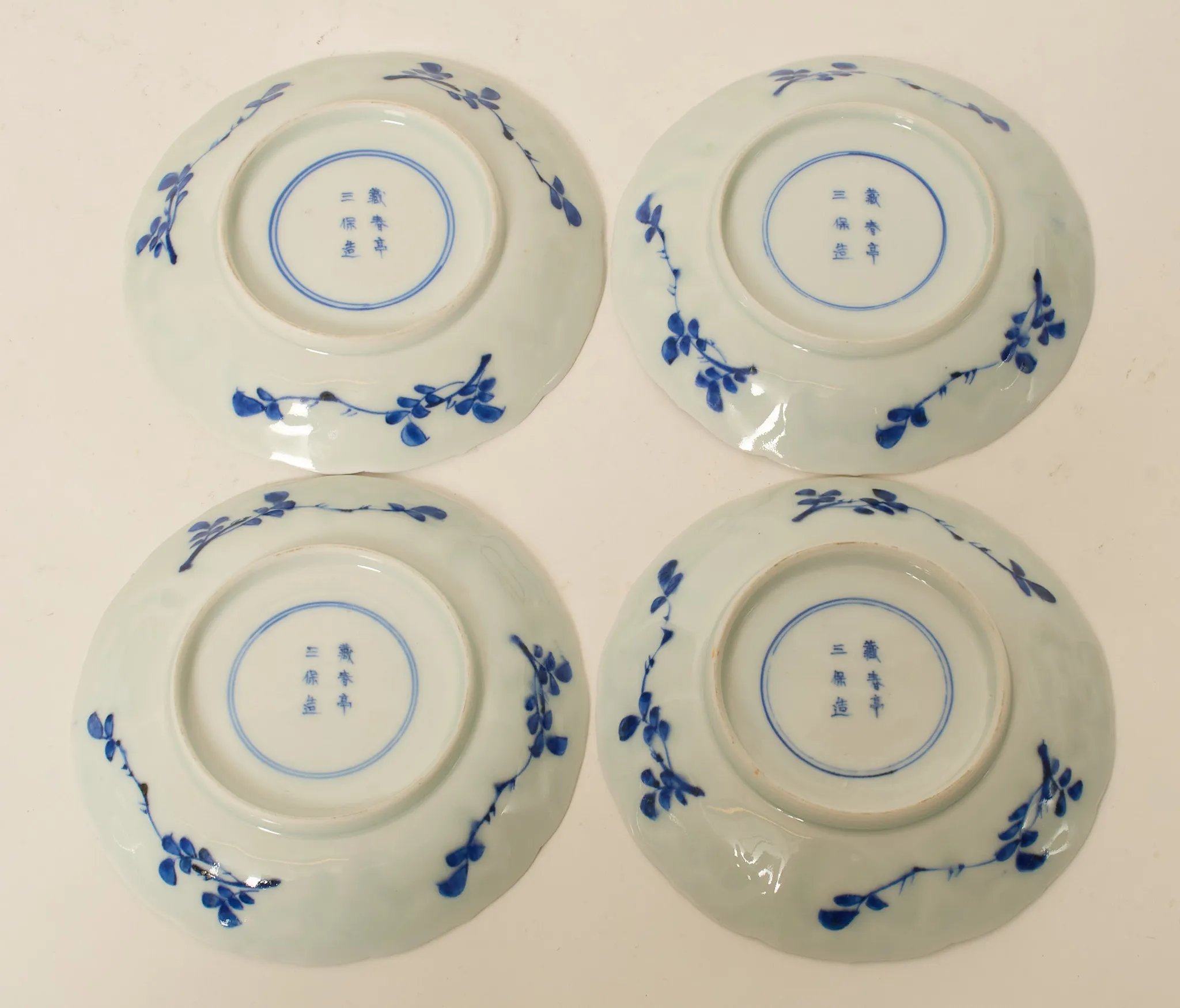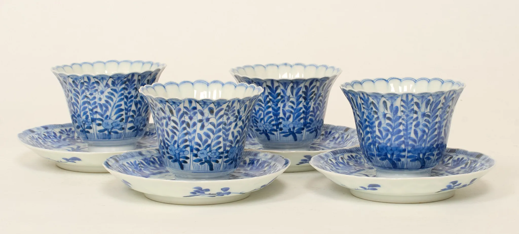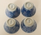 4 st, dekor i underglasyrblått, bär märkning, höjd kopp 7 cm, diam fat 13,5 cm, mindre nagg förekommer, 2 koppar med sprickor samt ett fat med spricka