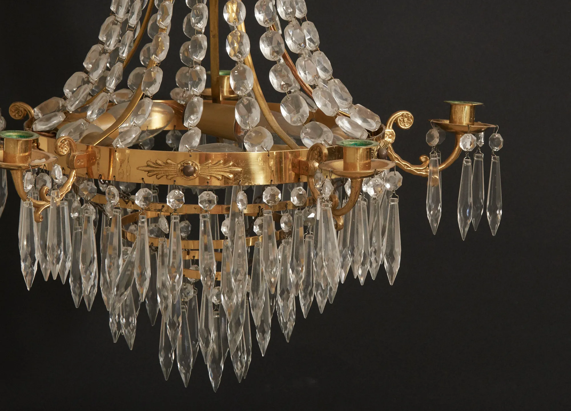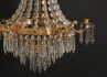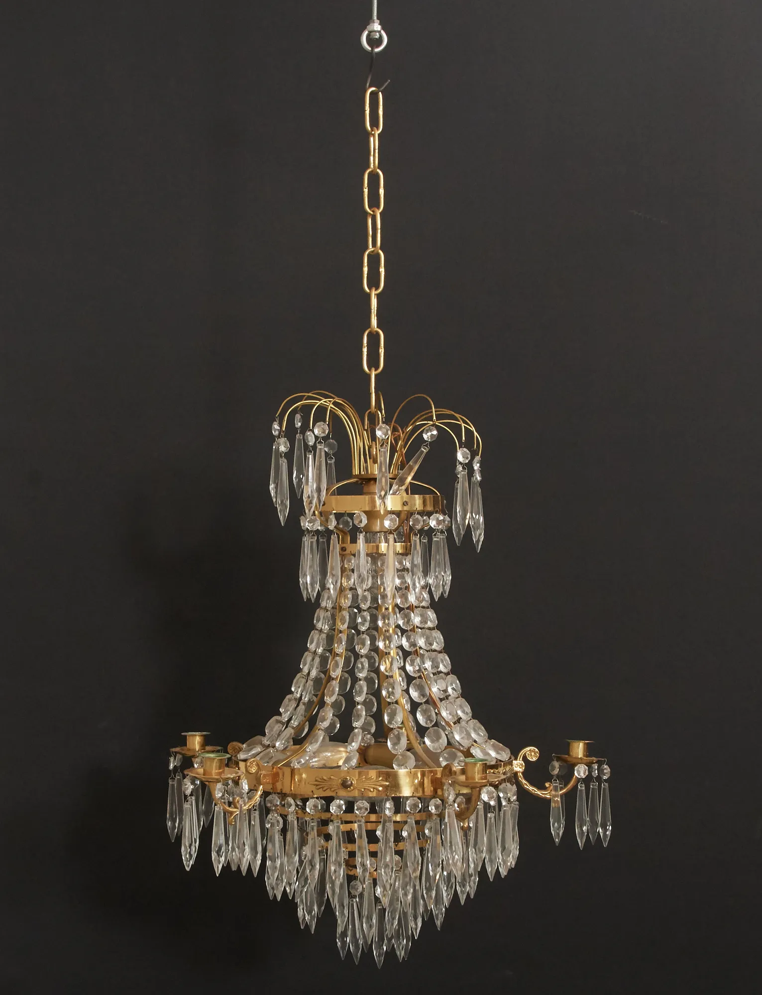 Höjd ca 60 cm exkl upphängning, 5 elektriska ljuskällor samt 5 för levande ljus.Några prismor saknas. Ej funktionstestad.