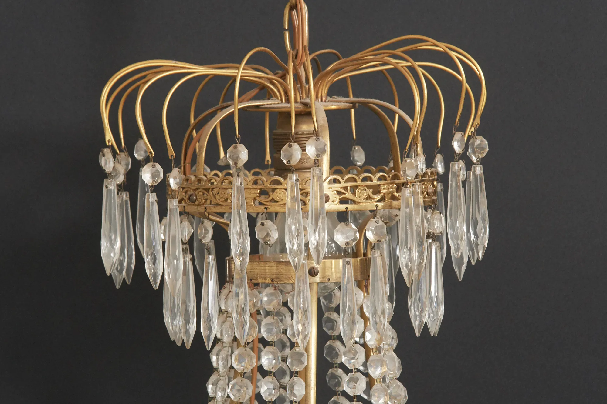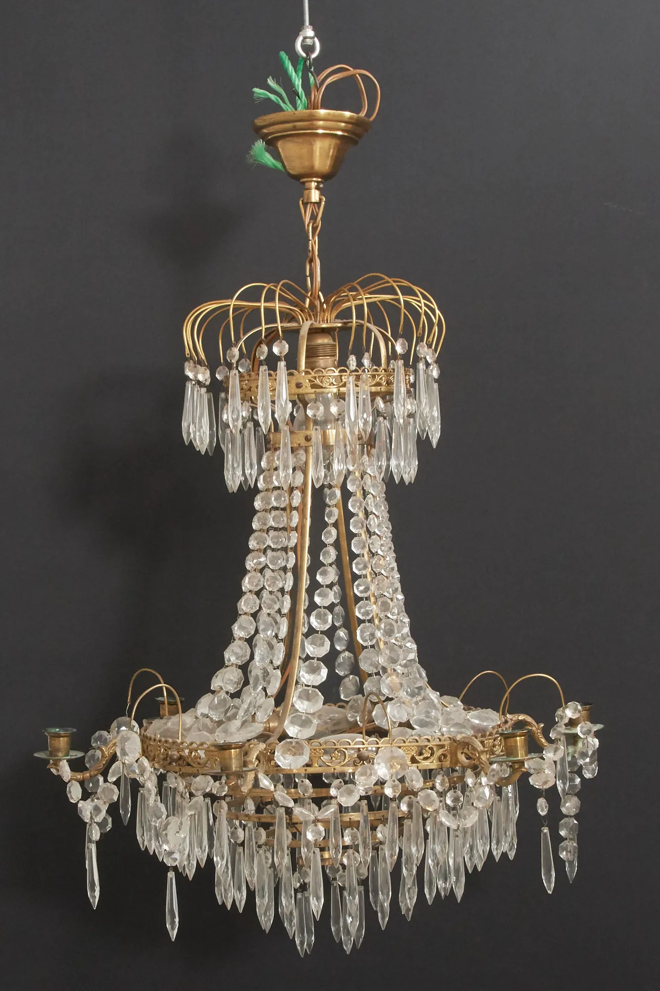 1 + 6 elektriska ljuspunkter, hållare för 6 levande ljus, höjd exkl upphängning ca 70 cm, bruksslitage.