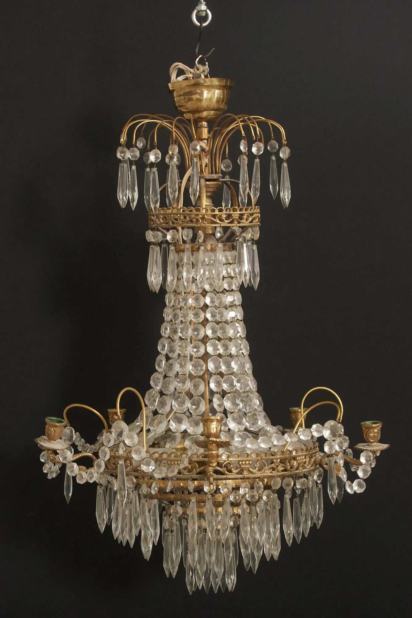 1 + 5 elektriska ljuspunkter, samt hållare för 5 levande ljus, höjd exkl upphängning ca 65 cm, lösa prismor medföljer.