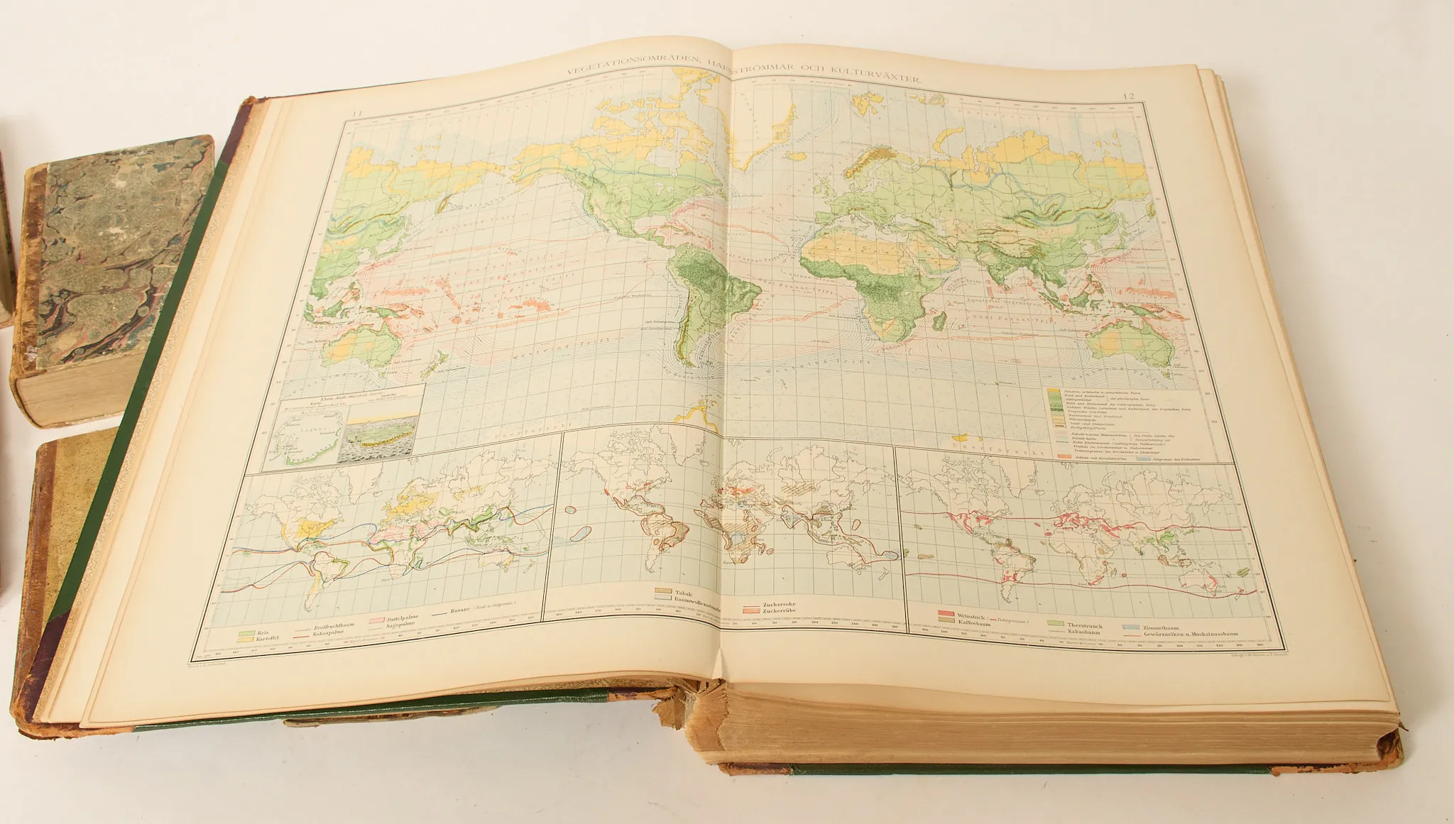 Andrees handatlas, 2:a nordiska upplagan, Hebreisk språklära 1821, Svea Riket Riddarskap och Adel 1816, 2 band Minnen Carl XII:s krigare 1818-1819, Fransk-svensk lexikon 1848, Sällskapslivet i Förenta Staterna 1835, slitage, skador.